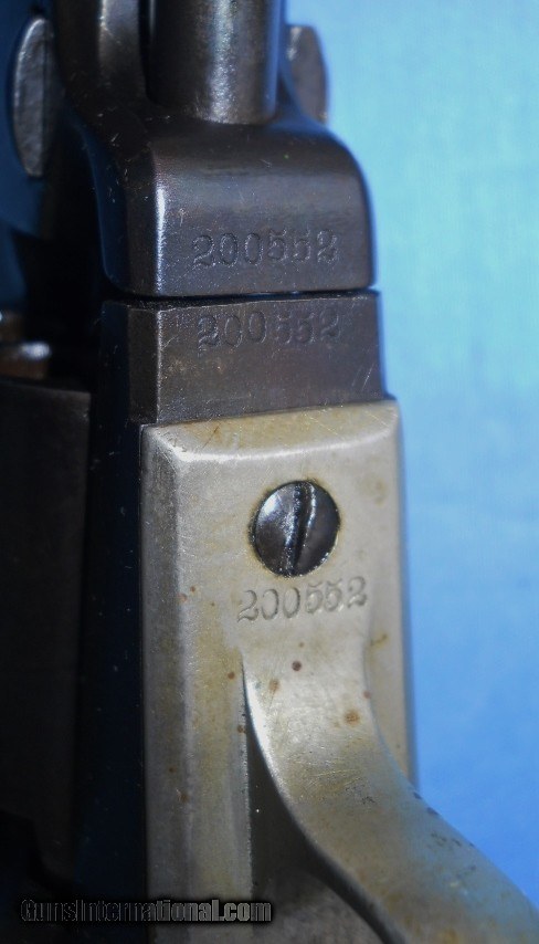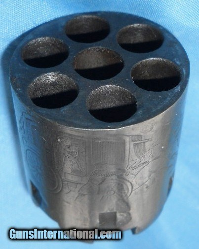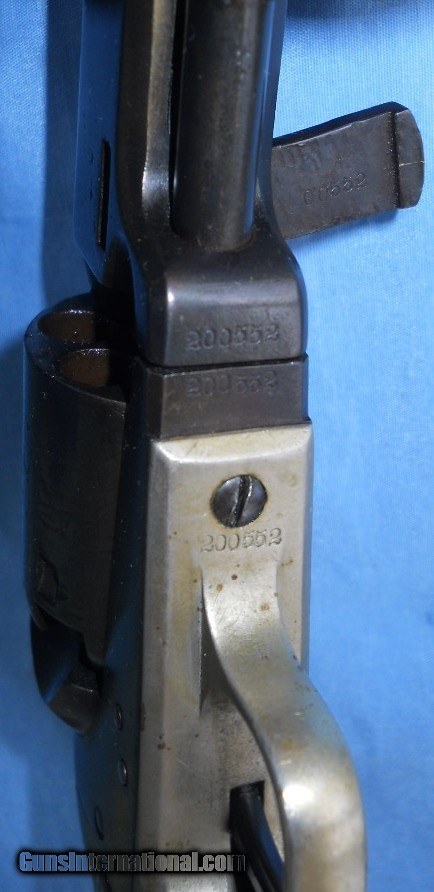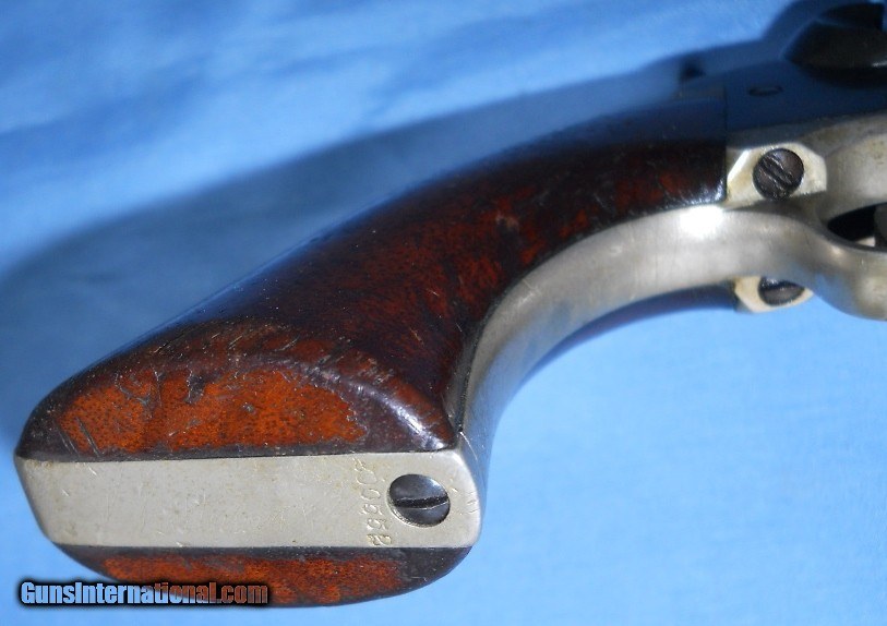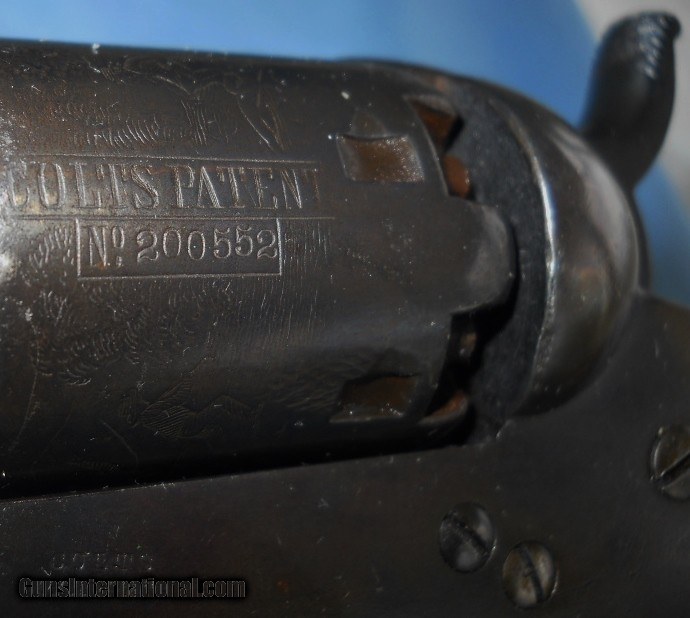 Description: ANTIQUE COLT MODEL 1849 CIVIL WAR ERA POCKET REVOLVER, MFG 1862 WITH DESIREABLE 6" BARREL, 2 LINE HARTFORD ADDRESS & 6 SHOT CYLINDER. ALL NUMBERS ARE MATCHING INCLUDING WEDGE. METAL SURFACE ABOUT 95% BLUE FINISH REDONE AT SOME POINT WITH FADING & HIGH EDGE WEAR. STAGECOACH HOLD UP CYLINDER SCENE IS MOSTLY VISIABLE. NOTE ALL BUT ONE OF THE SAFETY PINS ARE INTACT. CHAMBERS ARE CLEAR, MISSING 1 NIPPLE ($6.00 FROM LODGEWOOD) TRIGGER GUARD & BACKSTRAP HAVE NEARLY ALL OF A SILVER FINISH THAT IS LIGHTLY TARNISHED. LIGHTLY CLEANED WALNUT GRIPS RATE FINE TO NEAR EXCELLENT AND ARE PROPERLY NUMBERED TO THE GUN. ACTION IS CRISP, TIMES WELL WITH SNUG CYLINDER LOCKUP. A GREAT LOOKING CIVIL WAR ERA REVOLVER THAT WON'T BREAK YOUR BANK ROLL, AS PICTURED. $18.00 S&H DIRECT TO BUYER ANYWHERE THAT'S OK. SEE ALL "ESTATE ANTIQUES" LISTINGS FOR MORE SCARCE ITEMS FROM OLD TIME COLLECTIONS AT SENSIBLE PRICES. SOLD Antique: Yes Manufacturer: COLT Model: 1849 Serial Number: 200552 MATCHING Barrel Length: 6 Caliber Info: .31 Bore: LIGHT PITTING Chambers: CLEAR Condition: VERY GOOD AS PICTURED Wood Condition: FINE Bore Condition: STRONG RIFLING Barrel Type: OCTAGON Action: WORKING Sights: FACTORY ORIGINAL Manufacture Date: 1862 Engraving: FACTORY |