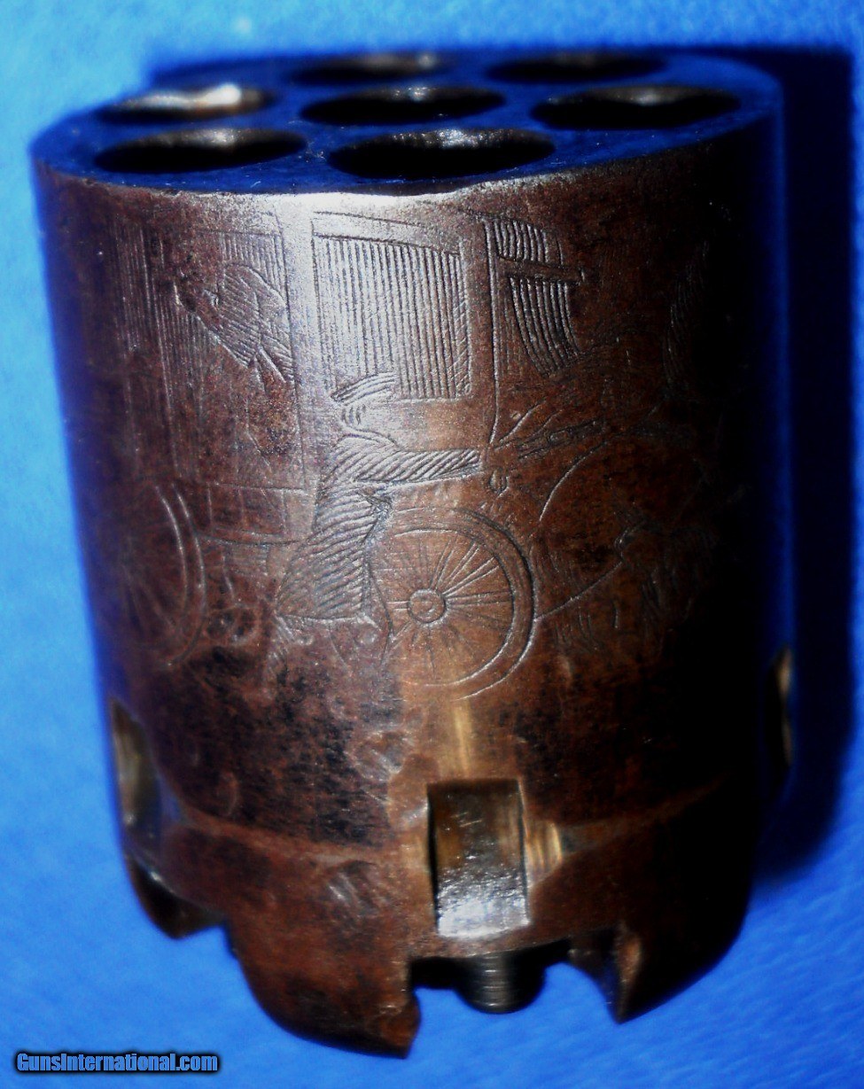 Description: COLT MODEL 1849 POCKET MODEL REVOLVER IN PERIOD WALNUT CASE WITH ACCESSORIES. SERIAL NUMBERS ARE ALL MATCHING INCLUDING WEDGE, MFG. 1862. DESIREABLE 6 SHOT WITH 5" BARREL. BORE HAS OVERALL LIGHT PITTING WITH STRONG RIFLING. METAL SURFACES ORIGINAL BRIGHT BLUE BLENDING WITH GRAY-BROWN PATINA. STAGE COACH HOLDUP CYLINDER SCENE FULLY VISABLE WITH SOME SAFTY PINS STILL INTACT. LOADING LEVER & FRAME STILL HAVE A RESPECTABLE AMOUNT OF SMOKEY CASE COLORS WITH A NUMBER OF THE SCREWS & TRIGGER BRIGHT FIRE BLUE. LOTS OF THE ORIGINAL SILVER STILL ON THE TRIGGERGUARD WITH JUST A LITTLE ON BACKSTRAP. FACTORY MARKINGS ARE CRISP AND CLEAR. WALNUT GRIPS RATES FINE PLUS HAVING 90% ORIGINAL FINISH AND ONLY LIGHT WEAR. ACTION IS CRISP, IN TIME WITH SOLID CYLINDER LOCK-UP. A VERY NICE 1849 POCKET FOR YOUR COLLECTION OR INVESTMENT. ACCESSORIES INCLUDE PERIOD POWDER FLASK, TIN OF WINCHESTER CAPS, UNMARKED BRASS 2 CAVITY BULLET MOLD, NIPPLE WRENCH AND A FEW .31 CAL. ROUND BALLS, CASE HAS NO KEY. $30.00 S&H DIRECT TO BUYER ANYWHERE THAT'S OK. SEE ALL "ESTATE ANTIQUES" LISTINGS FOR MORE FROM COLLECTIONS & ESTATES. SOLD Antique: Yes Handgun Caliber: .31 Manufacturer: COLT Model: 1849 POCKET Serial Number: 221319 Barrel Length: 5 Bore: SHARP RIFLING Chambers: CLEAR Condition: VERY GOOD PLUS Metal Condition: ORIGINAL Wood Condition: VERY GOOD Bore Condition: GOOD Barrel Type: OCTAGON Action: CRISP & TIGHT Finish: ORIGINAL Manufacture Date: 1862 |