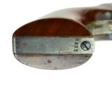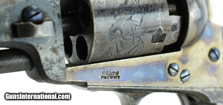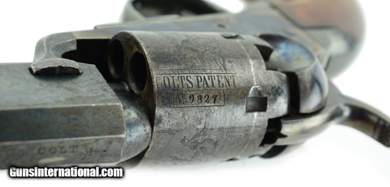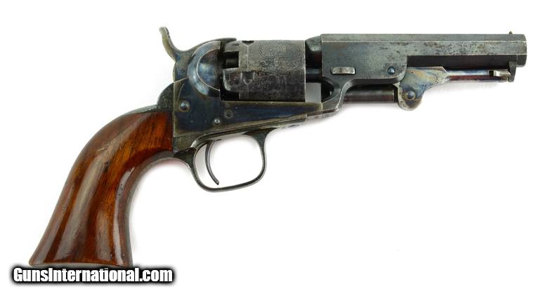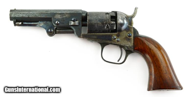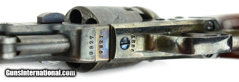 Description: Colt 1849 Pocket London Model. Made in 1856. Scarce barrel address with “{ADDRESS COL. COLT/LONDON}”. Gun is in beautiful condition with 80% of the original blue on the barrel. Cylinder is very fine with excellent cylinder scene. Case colors are beautiful and rate around 100%. Both trigger guard and back strap have all of original silver. Grips are excellent. There is not much not to like about this fine gun! SOLD Antique: Yes |