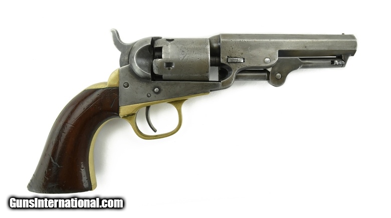 Description: Colt 1849 Pocket model. 31 caliber 6 shot revolver. Matching serial numbers. Lever is not numbered but high serial number 49 models are not numbered. Bore is good with strong rifling. Cylinder scone is good, being about 60-70% visible. Grips have approximately 95% original varnish. Brass parts have a fine even patina. This is a one line New York barrel address 1849. In very good condition. SOLD Antique: Yes |
