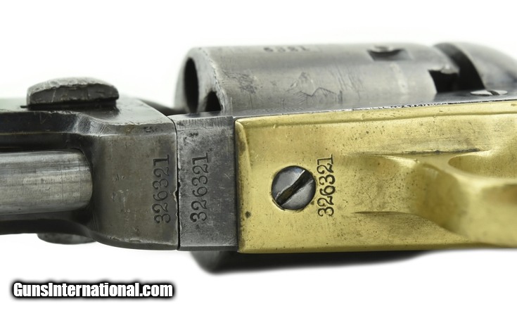 Colt 1849 Pocket model. 31 caliber 6 shot revolver. Matching serial numbers. Lever is not numbered but high serial number 49 models are not numbered. Bore is good with strong rifling. Cylinder scone is good, being about 60-70% visible. Grips have approximately 95% original varnish. Brass parts have a fine even patina. This is a one line New York barrel address 1849. In very good condition.