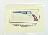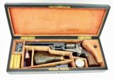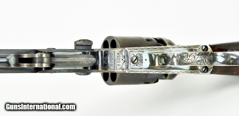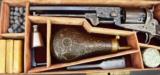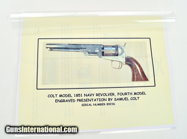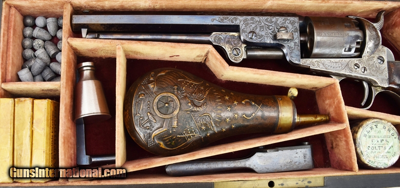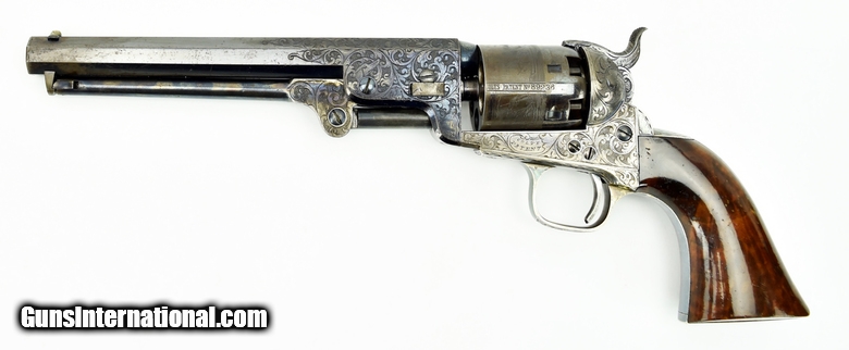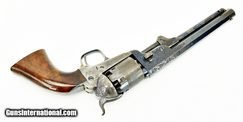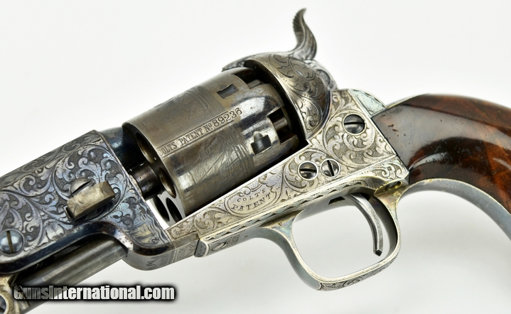Colt 1851 Factory Engraved Navy made in 1858. 95% of the original finish. Engraving is excellent and sharp. Good case colors remain on the lever. The colors on the frame have toned slightly. Grips are beautiful burled walnut. The back strap has a Sam Colt presentation. The presentation read “L. Cole Esq with Colonel Colt’s compliments” S. Cole was Silas Ebeneezer Cole who was a Canadian attorney who Colt hired as a patent attorney. This gun is a deluxe ebony case. The case very fine accessories along with 3 very nice skin packets. Under the embossed compartment lid is a mushroom head cleaning rod. This gun came out of the famous Robert Pershing collection of Colts. Mr. Pershing was a very astute collector who authored a number of articles on his research. Accompanying this gun is detailed description of this gun and Mr. Pershing research. Very fine Colonel Colt presentation in very fine condition in a killer case. Hard set to improve upon!