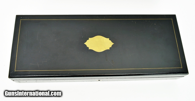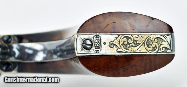 Description: Colt 1851 Factory Engraved Navy made in 1858. 95% of the original finish. Engraving is excellent and sharp. Good case colors remain on the lever. The colors on the frame have toned slightly. Grips are beautiful burled walnut. The back strap has a Sam Colt presentation. The presentation read “L. Cole Esq with Colonel Colt’s compliments” S. Cole was Silas Ebeneezer Cole who was a Canadian attorney who Colt hired as a patent attorney. This gun is a deluxe ebony case. The case very fine accessories along with 3 very nice skin packets. Under the embossed compartment lid is a mushroom head cleaning rod. This gun came out of the famous Robert Pershing collection of Colts. Mr. Pershing was a very astute collector who authored a number of articles on his research. Accompanying this gun is detailed description of this gun and Mr. Pershing research. Very fine Colonel Colt presentation in very fine condition in a killer case. Hard set to improve upon! SOLD Antique: Yes |