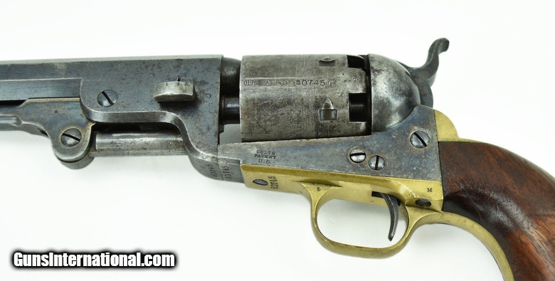 Colt 1851 Martial Navy revolver. Made in 1857. Excellent original blue on the barrel. Bright case colors on the frame. Very good cylinder scene. Sharp Cartouches on the grips. Exceptional Martial Navy!