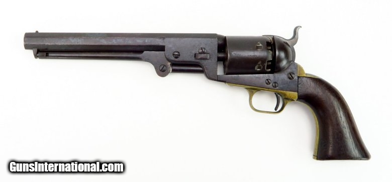 Colt 1851 Navy U.S marked frame. All matching numbers. Parts are inspected “A” for Ainsworth. Small trigger guard. Grids are good to very good and have faint cartouches on both sides of the grips. Bore is about good. Good plus early small guard Navy. This Navy variation is an Army-Navy.