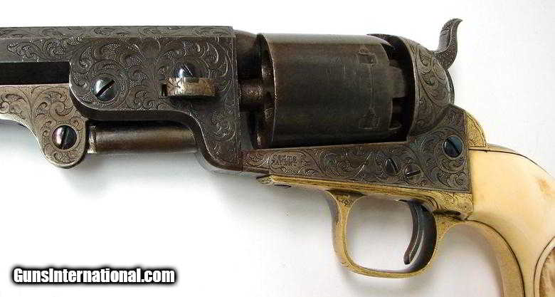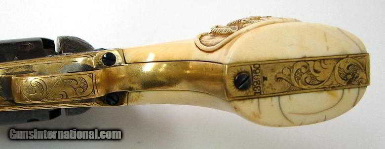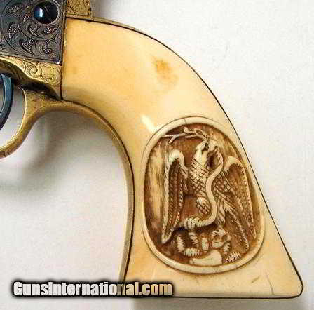 Description: Colt 1851 Navy Revolver. Beautiful, factory engraved. Excellent condition gun made in 1863. Inscribed on the back strap Juan P. Robles. Engraving is factory engraved and has the normal patterns and animals you find from the guns done by the Gustave Young Shop. Excellent blue on the barrel and very good case colors on the frame. Gun looks like it was barely used. Grips are wonderful carved Mexican eagle ivories that have been barely used. A fantastic factory engraved piece! SOLD Antique: Yes |