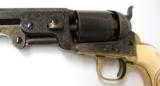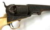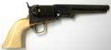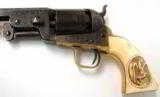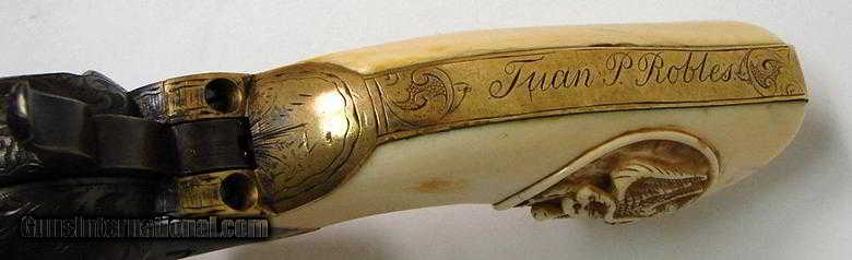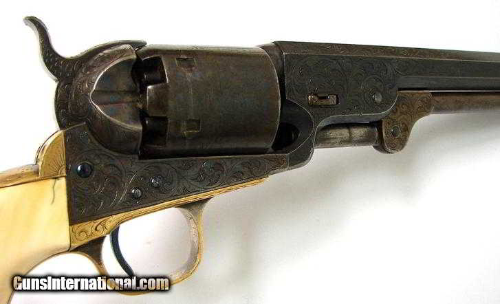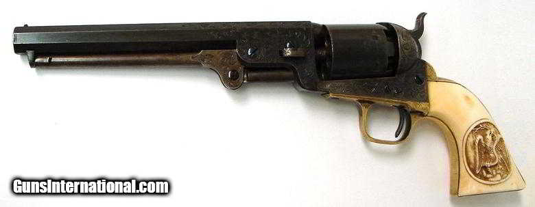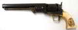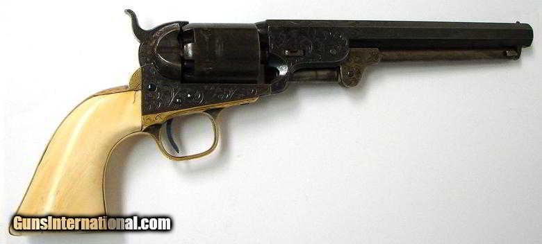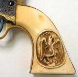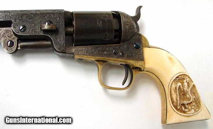 Colt 1851 Navy Revolver. Beautiful, factory engraved. Excellent condition gun made in 1863. Inscribed on the back strap Juan P. Robles. Engraving is factory engraved and has the normal patterns and animals you find from the guns done by the Gustave Young Shop. Excellent blue on the barrel and very good case colors on the frame. Gun looks like it was barely used. Grips are wonderful carved Mexican eagle ivories that have been barely used. A fantastic factory engraved piece!