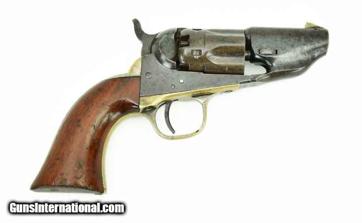Rare Colt 1862 Police Trapper Model. In the Book of Colt Firearms by R.L. Wilson on page 174 is a picture of an identical example. They note that these are special order snub nose models and between 25-50 were the estimated production. This gun is in very nice condition with 50%-60% of the original blue on the barrel. Good case colors remain on the frame. Grips are very fine.
