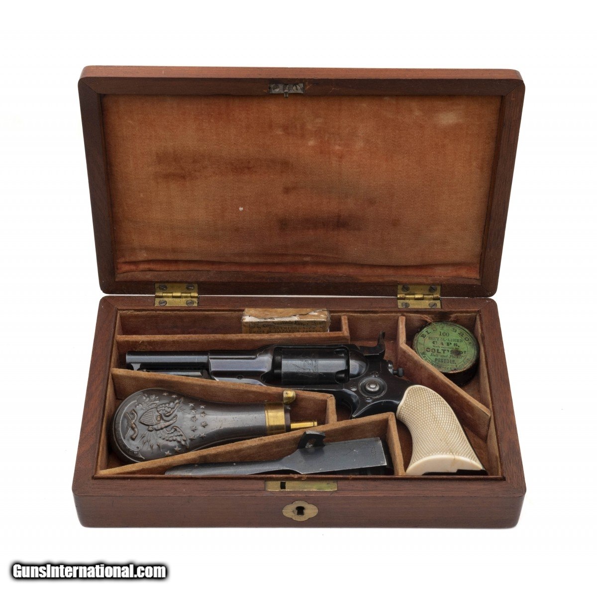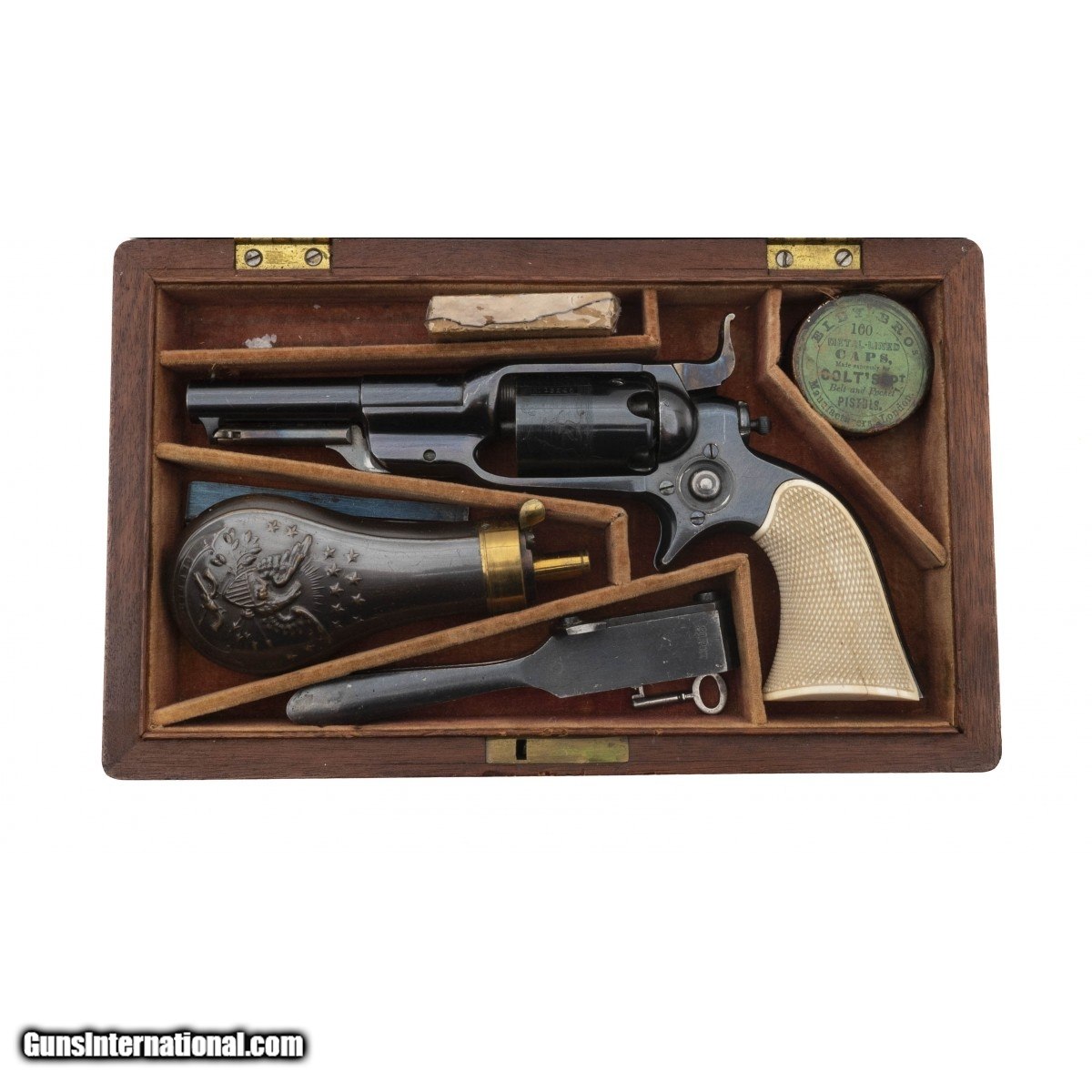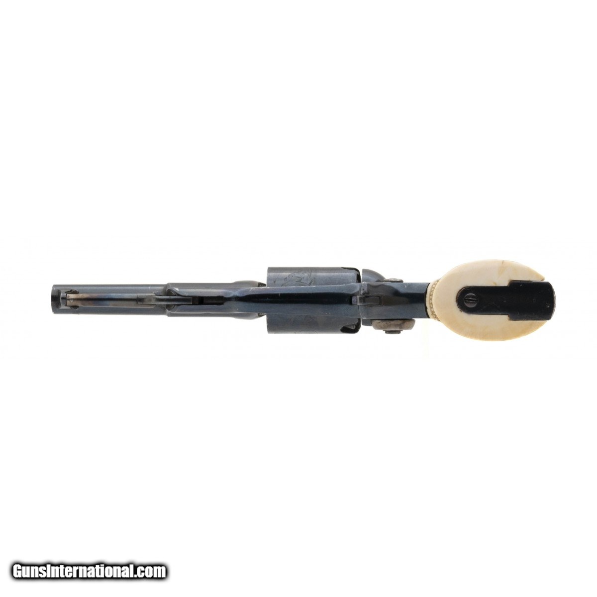 Description: "Serial number 13246. Made in 1856. 31 caliber with a 3 ½" barrel. Absolutely beautiful gun with 97% of the original high polish blue. Both loading lever and hammer have all of the case colors. Grips are excellent checkered ivories. Case is excellent with excellent condition accessories. Top Notch Colt 1855 Root! SOLD Antique: Yes |