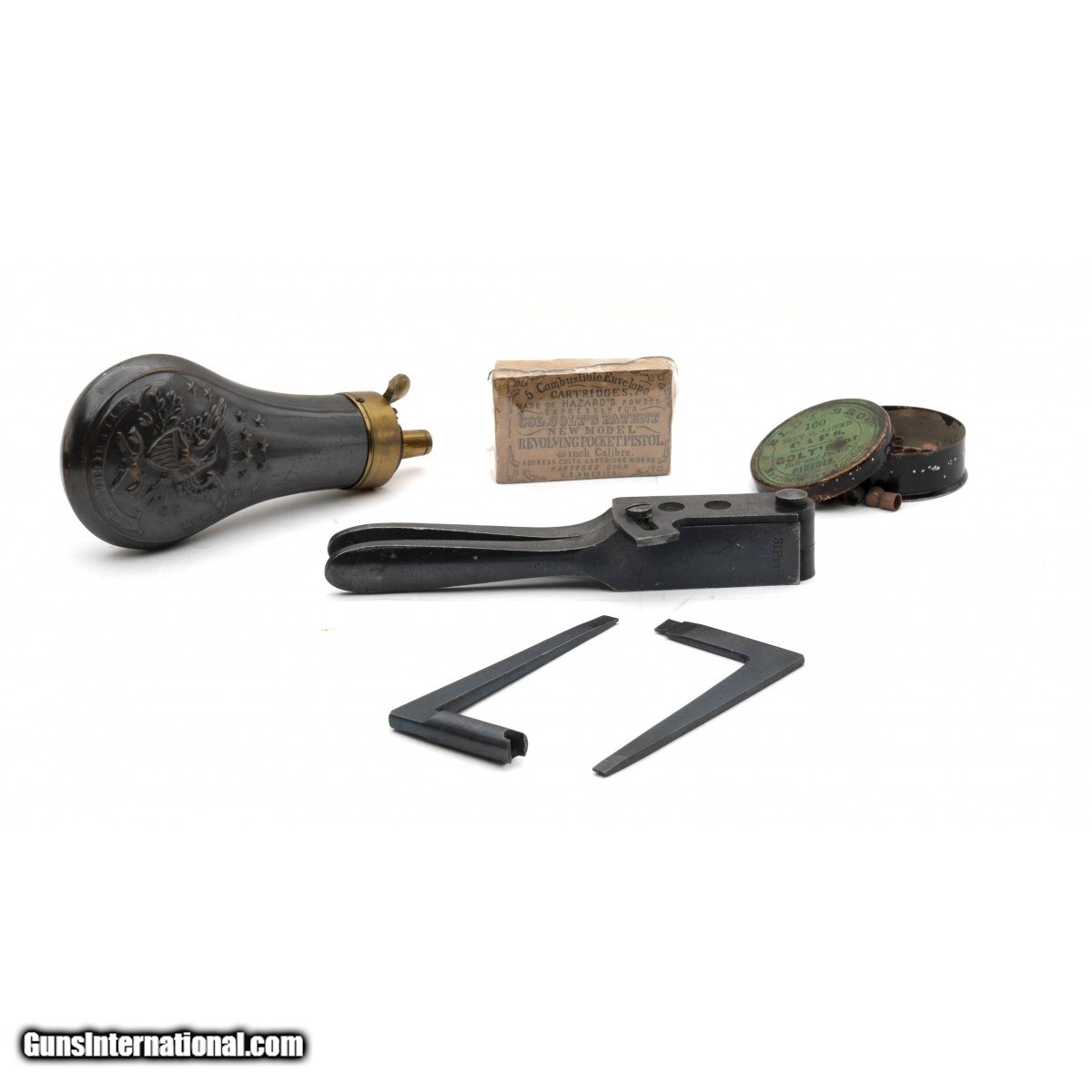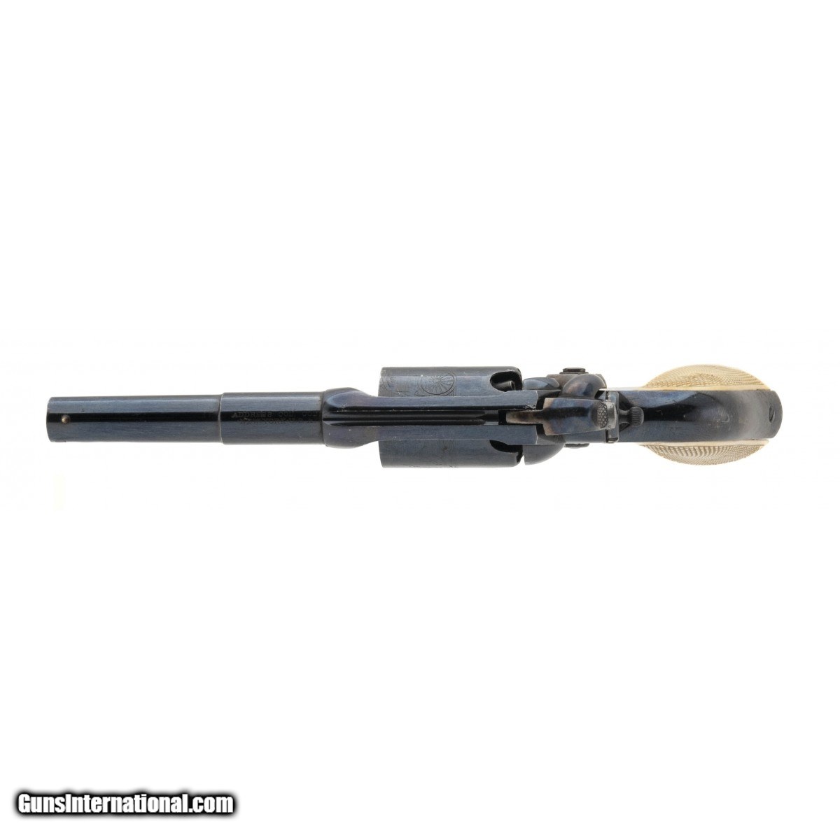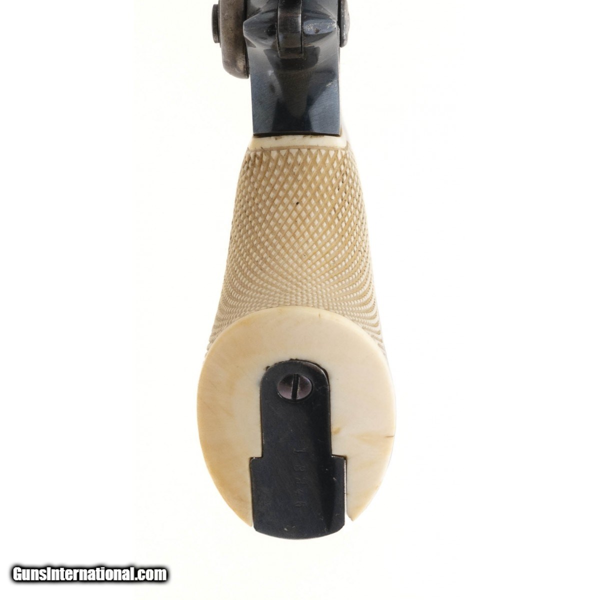 Description: "Serial number 13246. Made in 1856. 31 caliber with a 3 ½" barrel. Absolutely beautiful gun with 97% of the original high polish blue. Both loading lever and hammer have all of the case colors. Grips are excellent checkered ivories. Case is excellent with excellent condition accessories. Top Notch Colt 1855 Root! SOLD Antique: Yes |