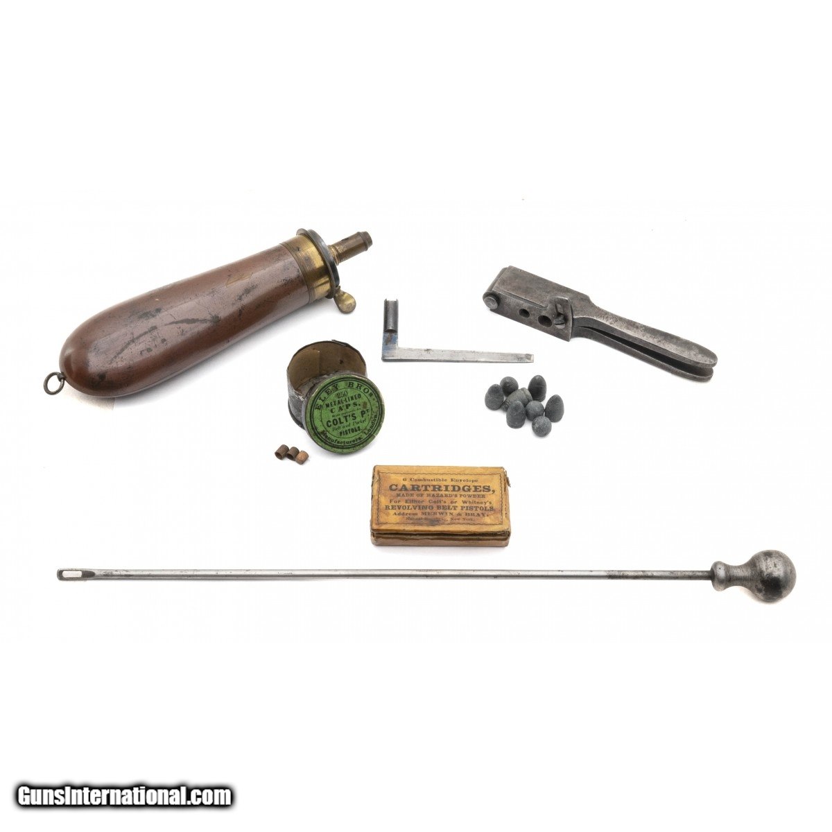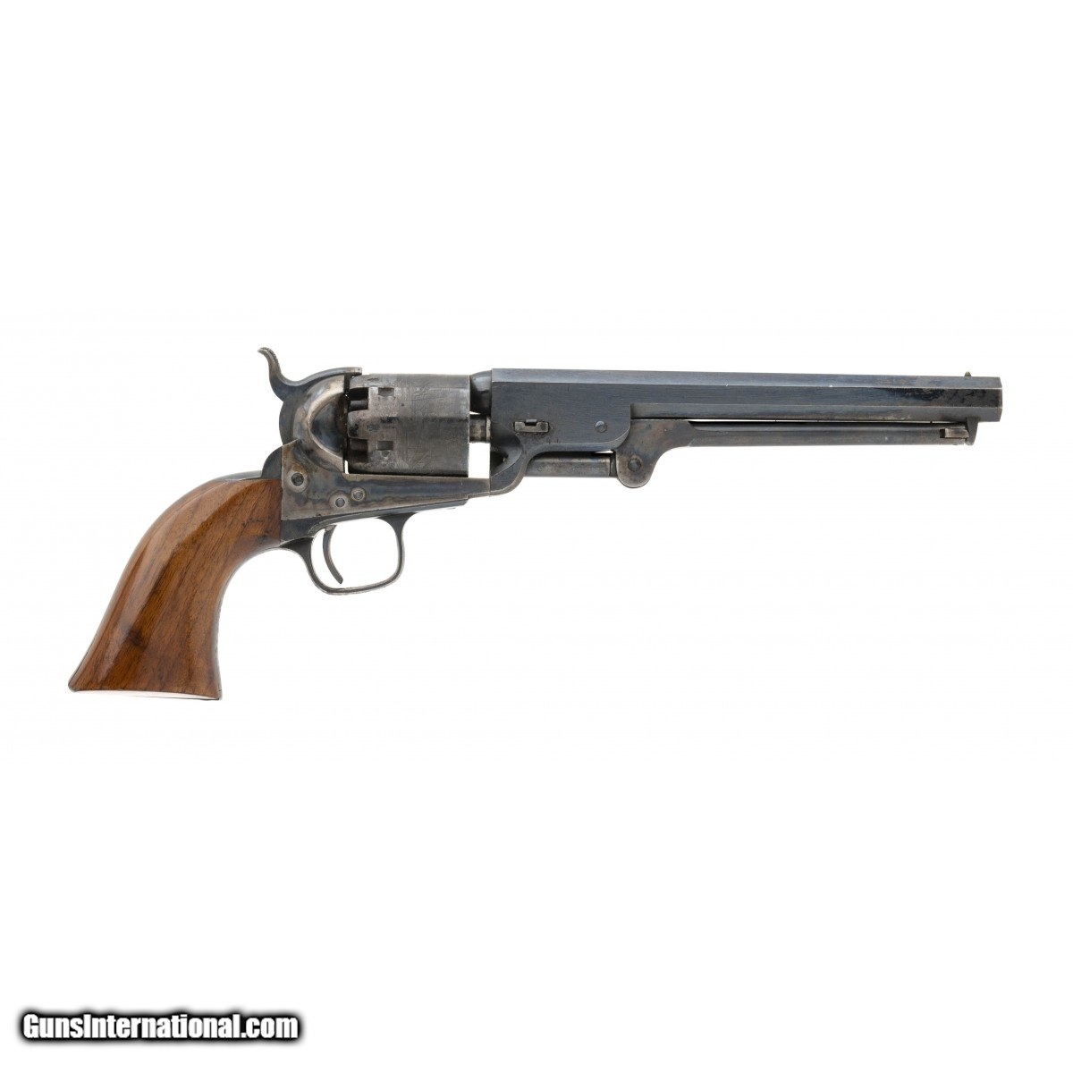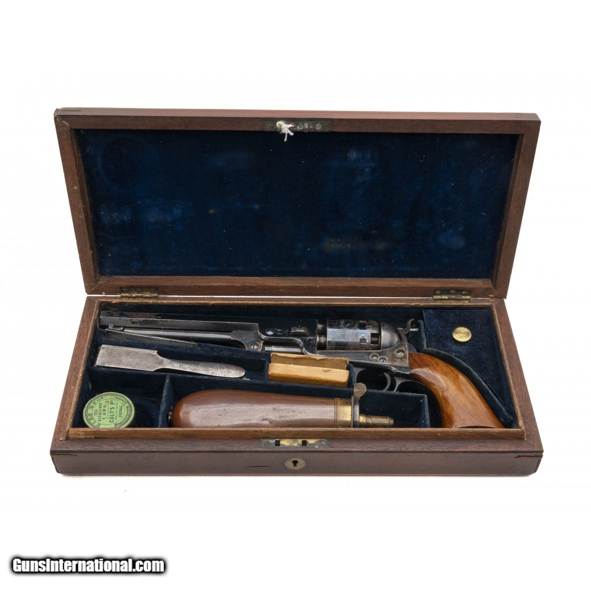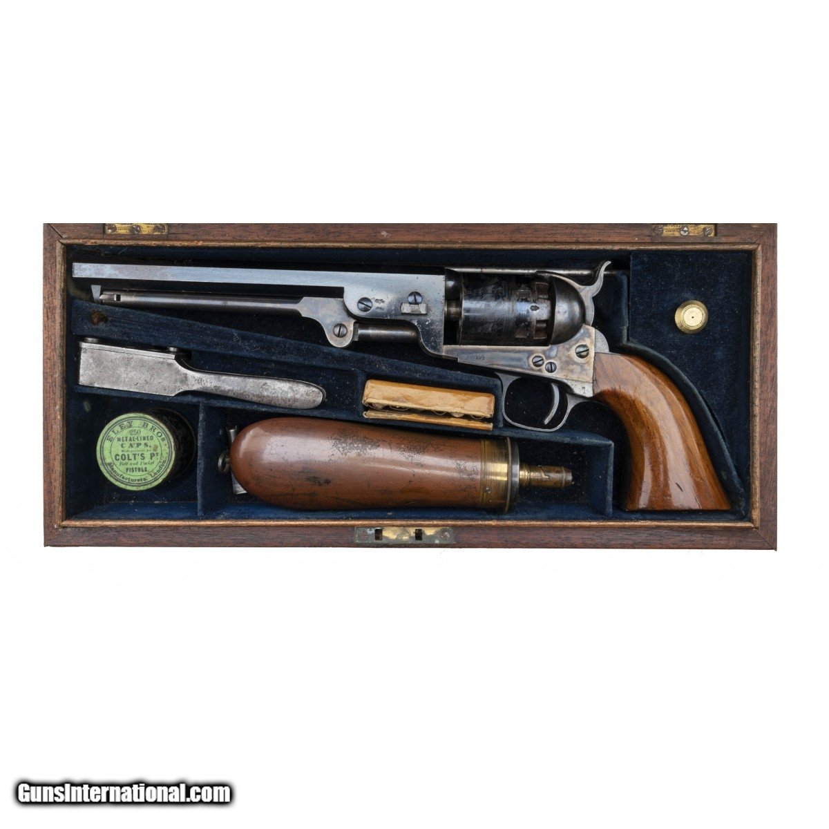 Description: "Serial number 42115. Made in 1856. 36 caliber with a 7 ½" barrel. Very fine all original finish with 85% of the original blue on the barrel. The frame has most of the original bright case colors. Grips are excellent. Case has very fine accessories. SOLD Antique: Yes |