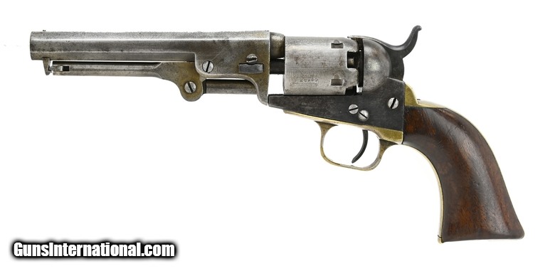 Description: " Colt 1849 Pocket Model Percussion Revolver. .31 Caliber manufactured 1852. Barrel has a two-line New York address and has a 5” length barrel. Serial numbers match except the wedge and loading lever, which does not have any number. Bore is good with good rifling. Action works perfectly. Cylinder scene is worn but you can see all of the stage coach. Frame has the very tiny Colts patent mark on left side. Grips are very good, no chips or cracks and has very good old varnish. SOLD Antique: Yes |