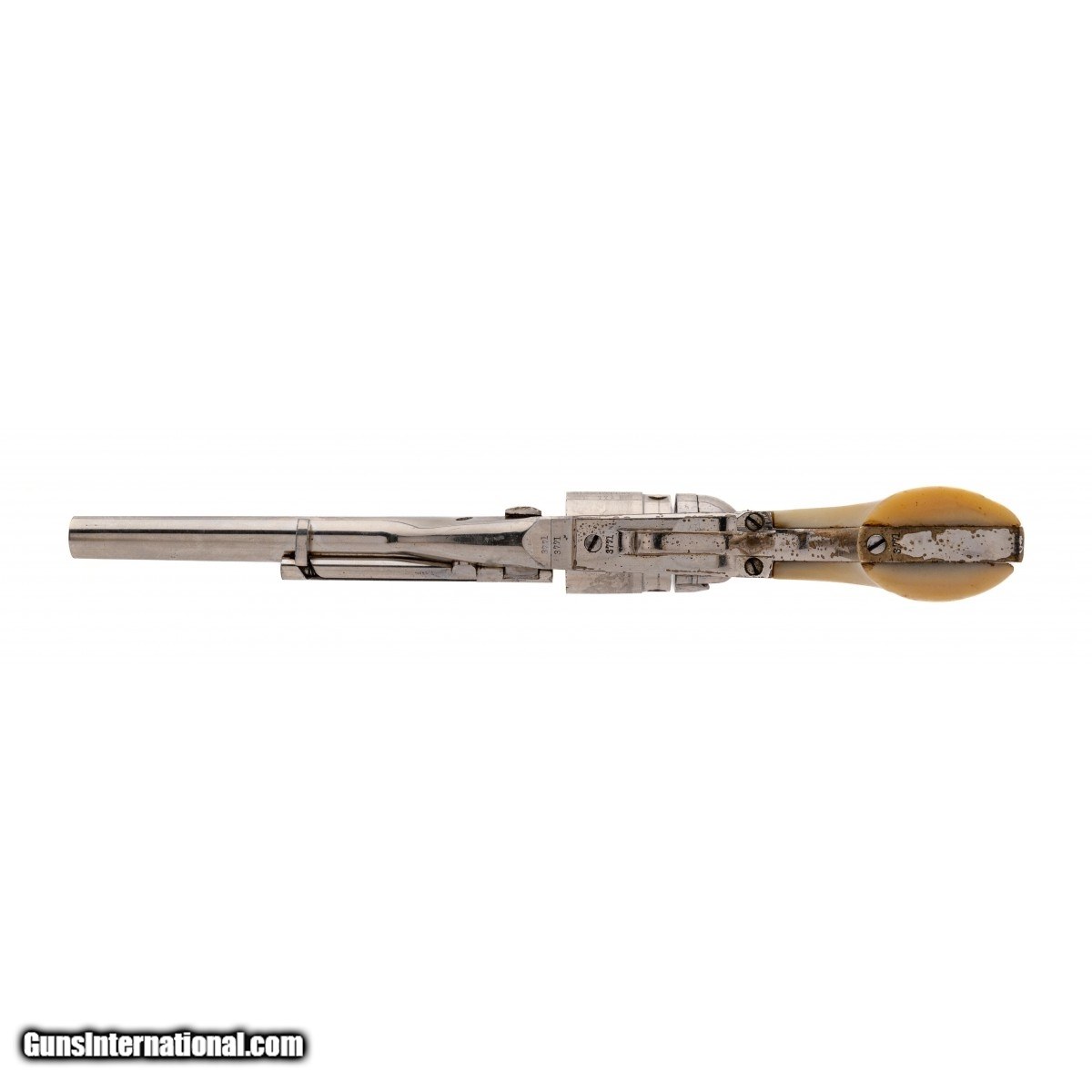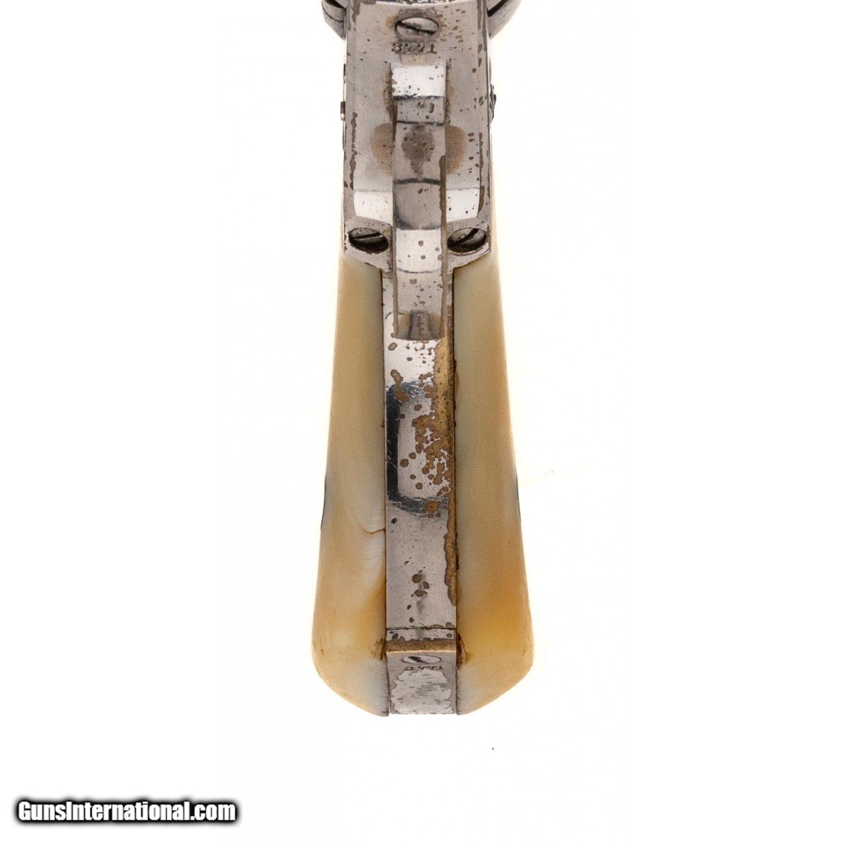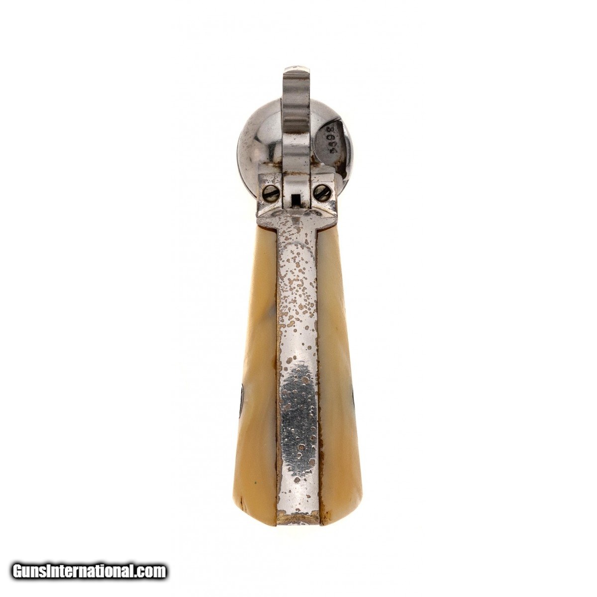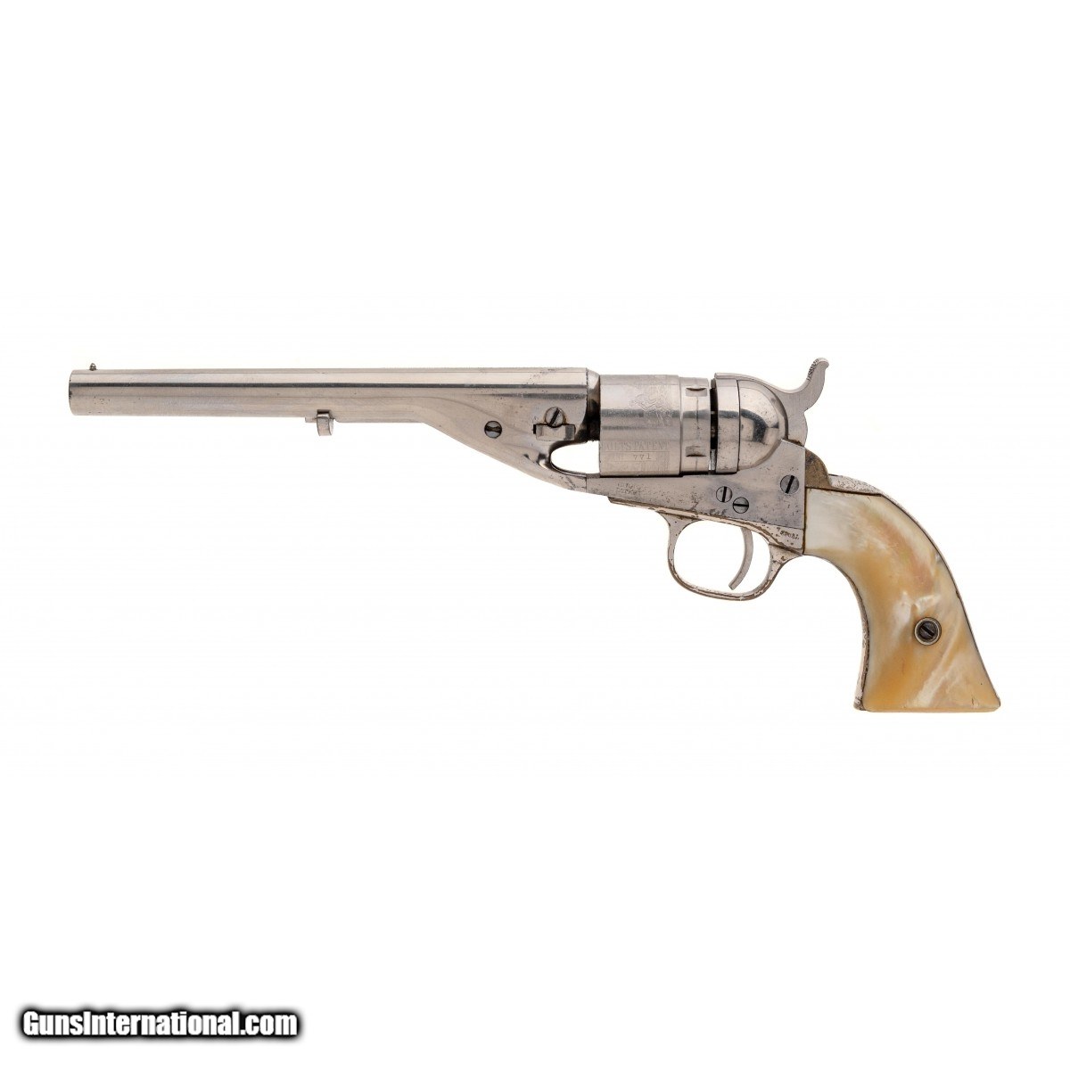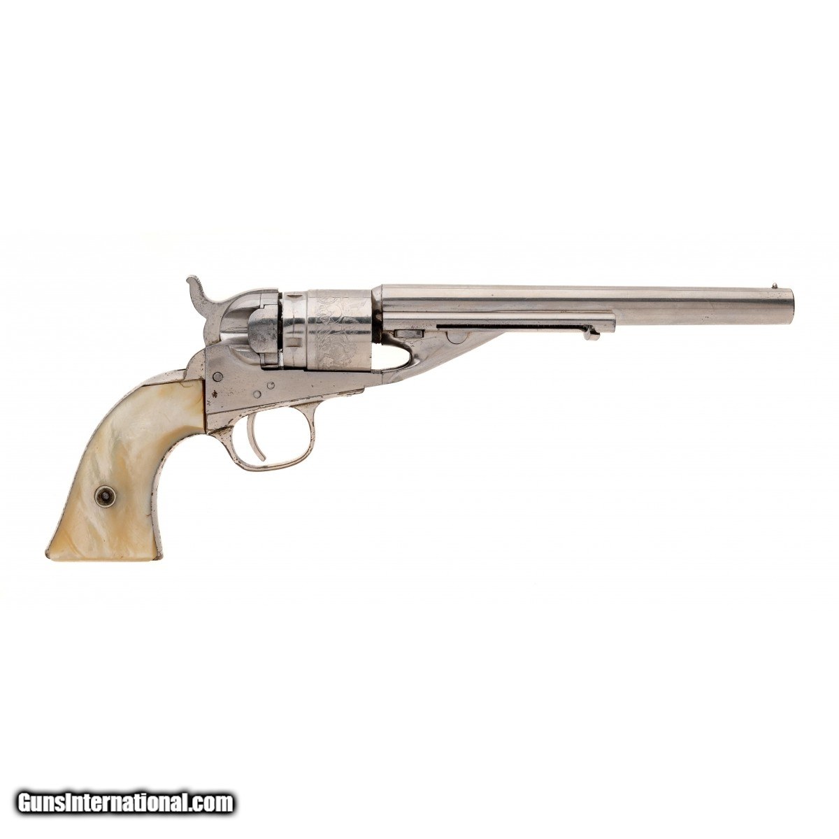 Description: "Serial number 3771. Made circa late 1860s. 38 RF with a 6 ½" barrel. Gun is in excellent condition to near new. Cylinder scene is excellent. This gun has beautiful two piece pearl grips. (Consignment) SOLD Antique: Yes |