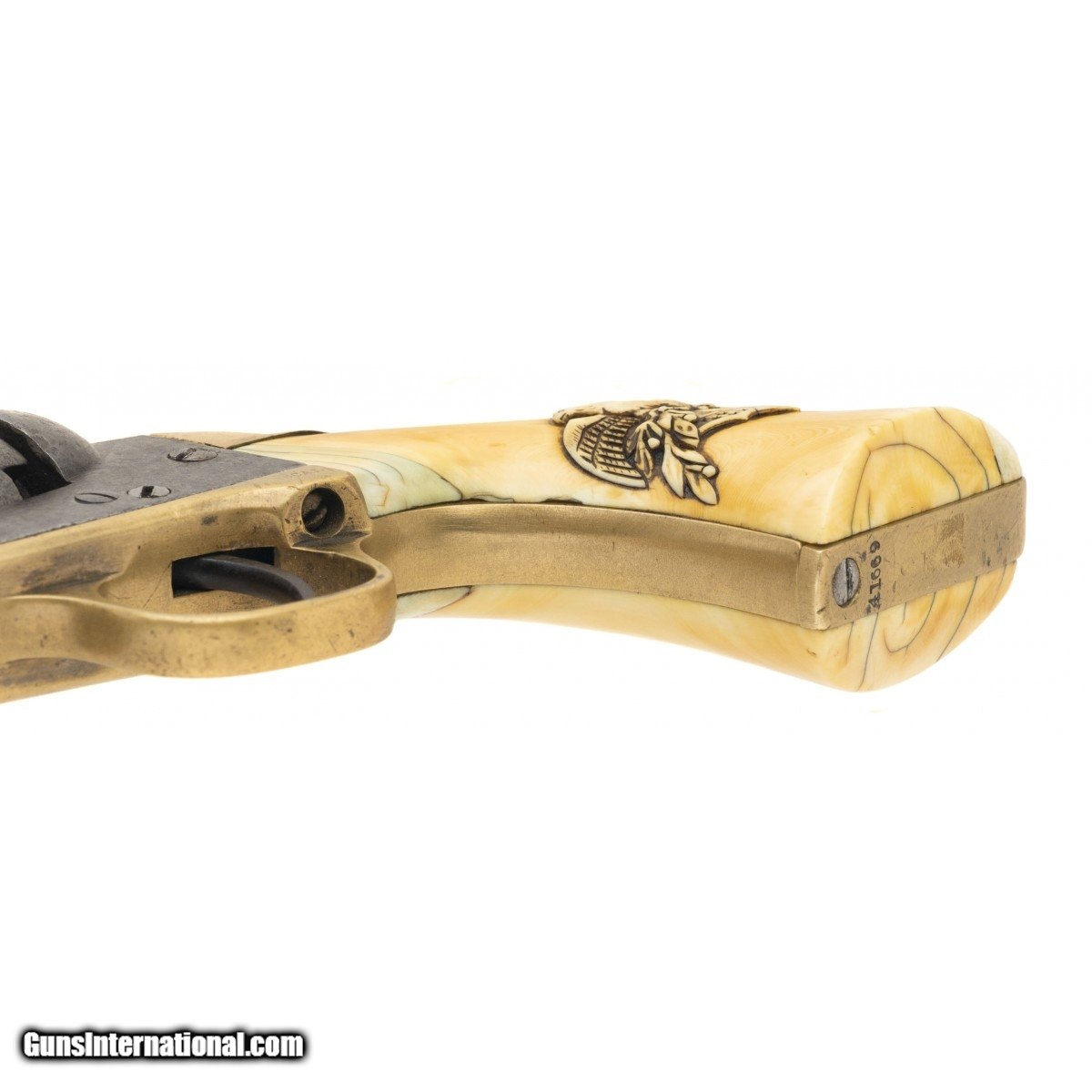Description: "Serial number 41669. Made in 1869. 36 caliber with a 4 ½" barrel. Metal has a dark gray patina. Action works well. Grips are period carved one piece ivory with a Patriotic American eagle on the left hand side. Grips have been repaired. SOLD Antique: Yes |