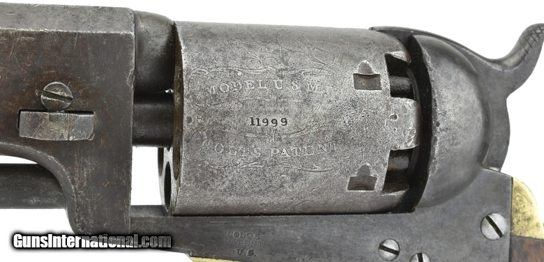 Description: " Colt 3rd Model Dragoon US Martial. Made in 1851, .44 caliber with a 7 ½”barrel. Nice sharp gun with a dark gray to brow patina. Cylinder scene is excellent. Gun is all matching. This gun has all of the small martial inspector’s markings. Grips are very fine with most of the original varnish. Action works perfectly. Very fine original gun. SOLD Antique: Yes |