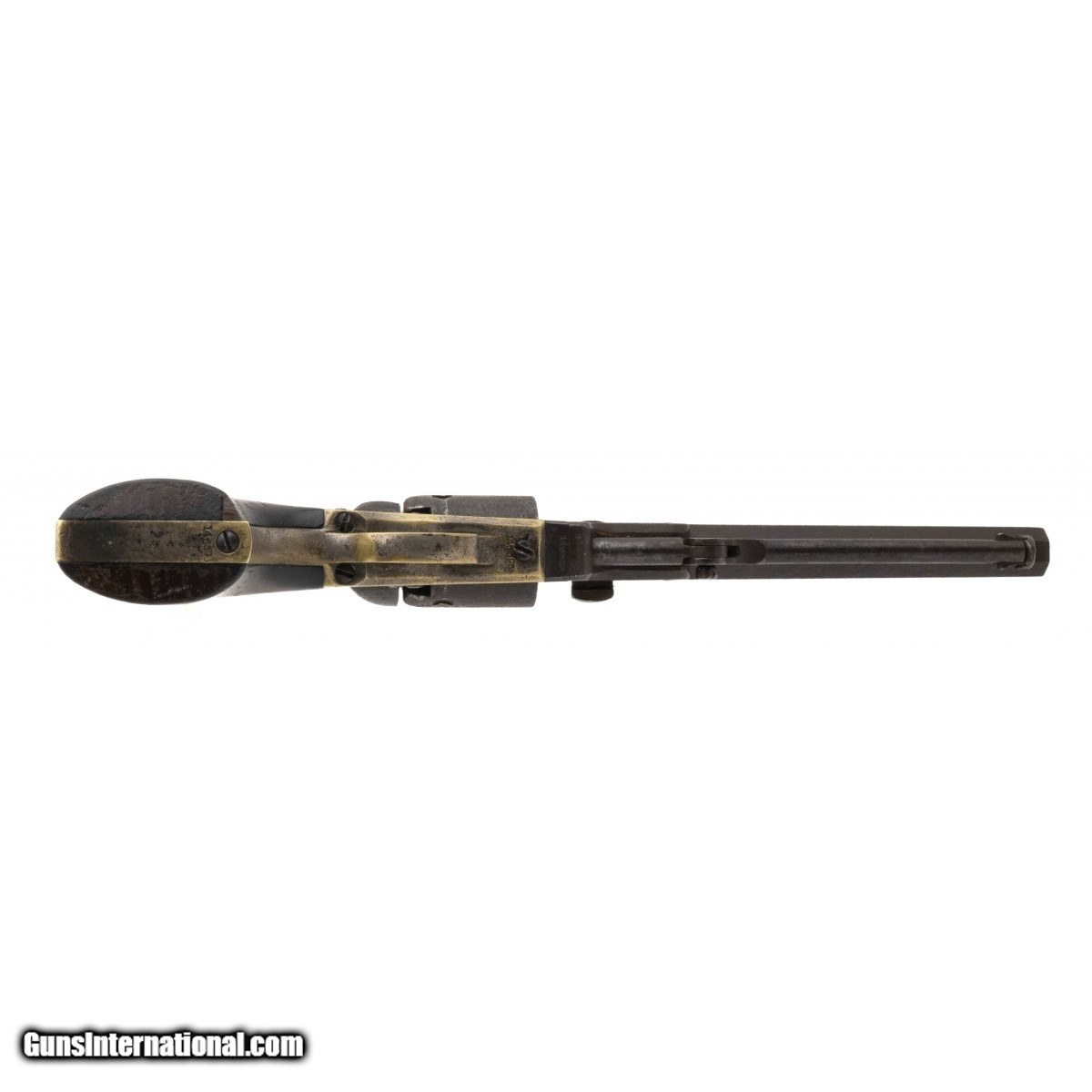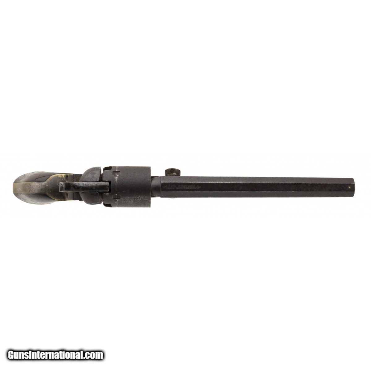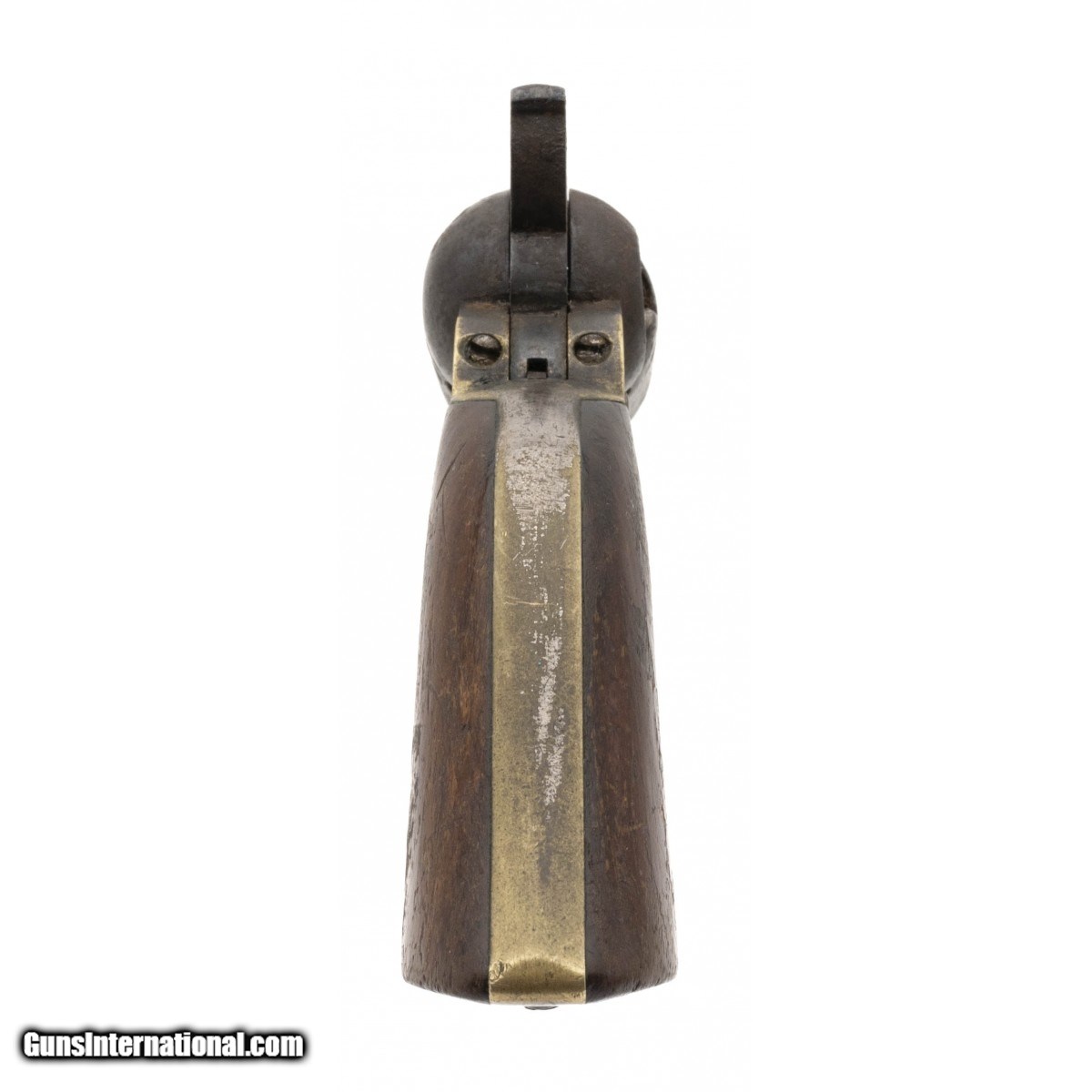 Description: " Serial No. 146596, made in 1858, .31 caliber, 6"" octagonal barrel. Serial numbers are matching, finish is a dark grey patina with surface oxidation and pitting visible. Original varnish is flaking, mostly on the right side with a chip at the toe. Action does not function hammer will go to full cock, cylinder will not rotate. Bore has pitting in the grooves, rifling remains strong. consignment SOLD Antique: Yes |
