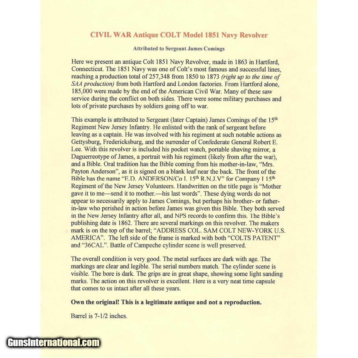 Serial No. 149340, made in 1863, .36 caliber, 7.5"" octagonal barrel. Bore is good with frosting and oxidation visible in the grooves. Rifling remains strong. Serial numbers are matching, wedge is not marked. Finish is a grey patina with markings legible, faint traces of cylinder scene remains. Action indexes correctly with a good lock up. Grips have expected nicks dings and scratches. Paperwork that comes with this states its attributed to Captain James Comings of the 15th New Jersey Volunteer Infantry including his watch, bible, portable mirror and photos. These items are grouped together through ""Oral tradition"" Consignment