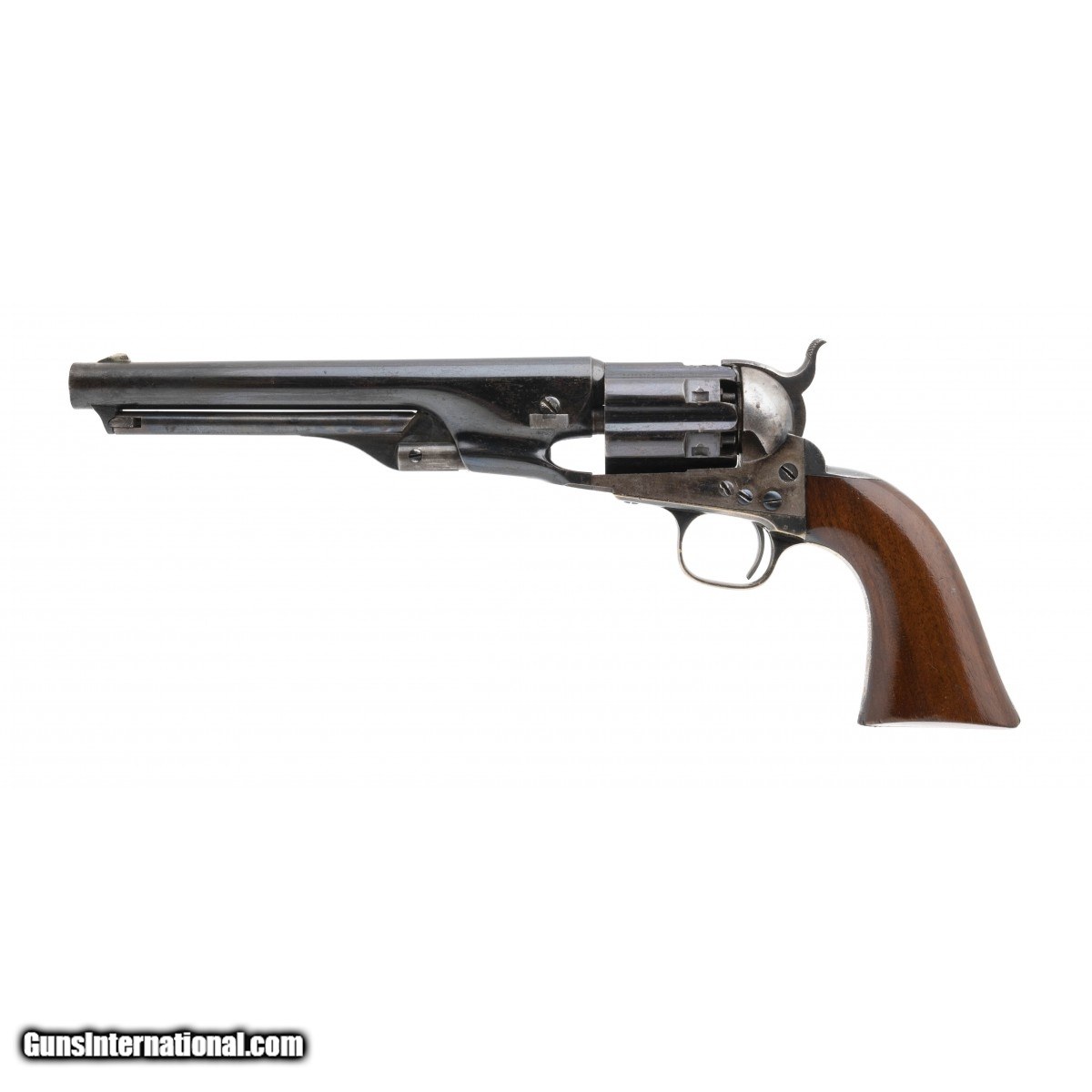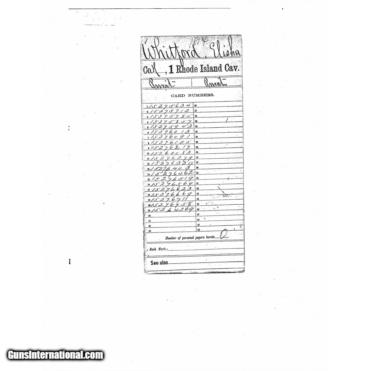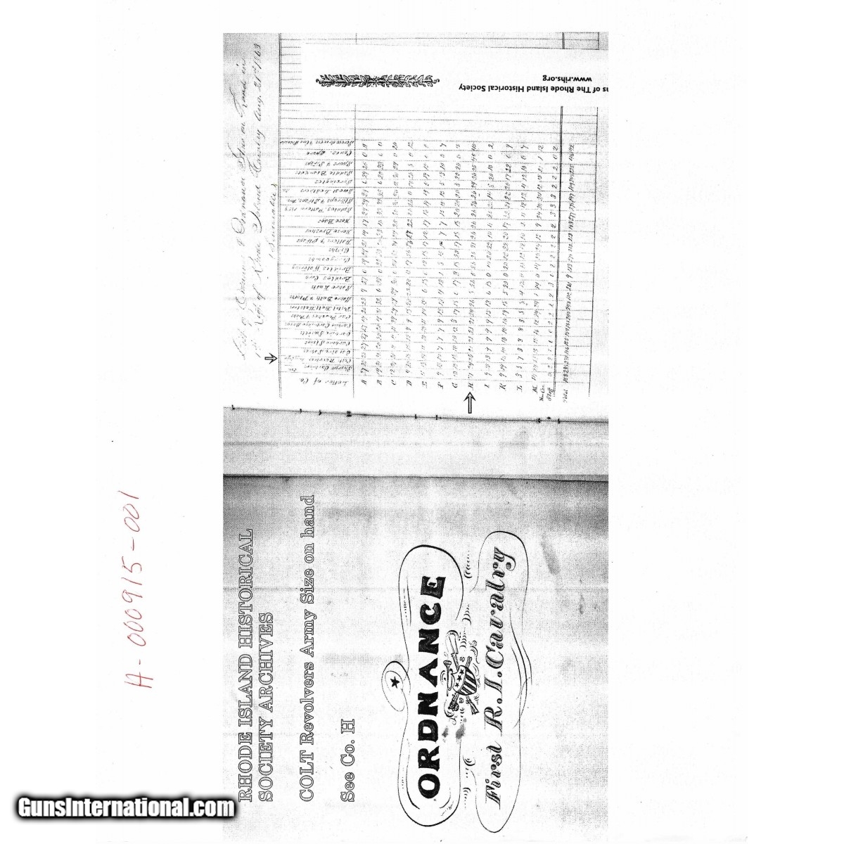 Description: "Serial number 1403. Made in 1861. 44 Caliber with a 8" barrel. Absolutely beautiful gun with 90% of the original blue on the barrel, bright case colors on the frame, 85% of the original blue on the cylinder and 95% of the original silver on the back strap and trigger guard. Grips are excellent. This gun is listed in the Rhode Island Historical Society as being issued to Elisha Whitford of the 1st Rhode Island Cavalry. A packet of Documentation accompanies this gun along with a Colt factory letter. SOLD Antique: Yes |