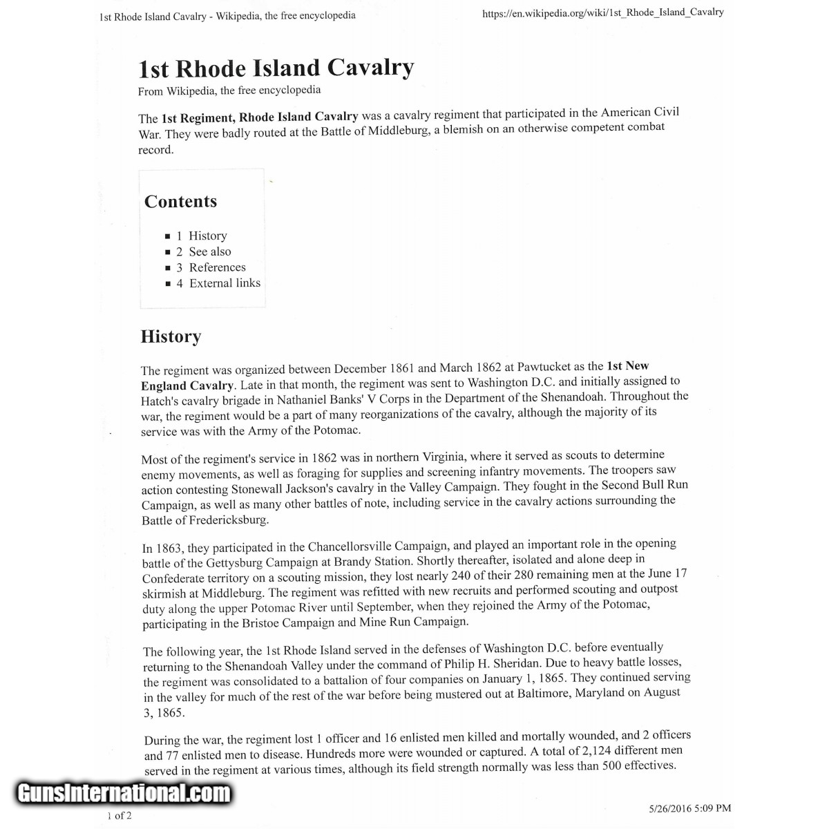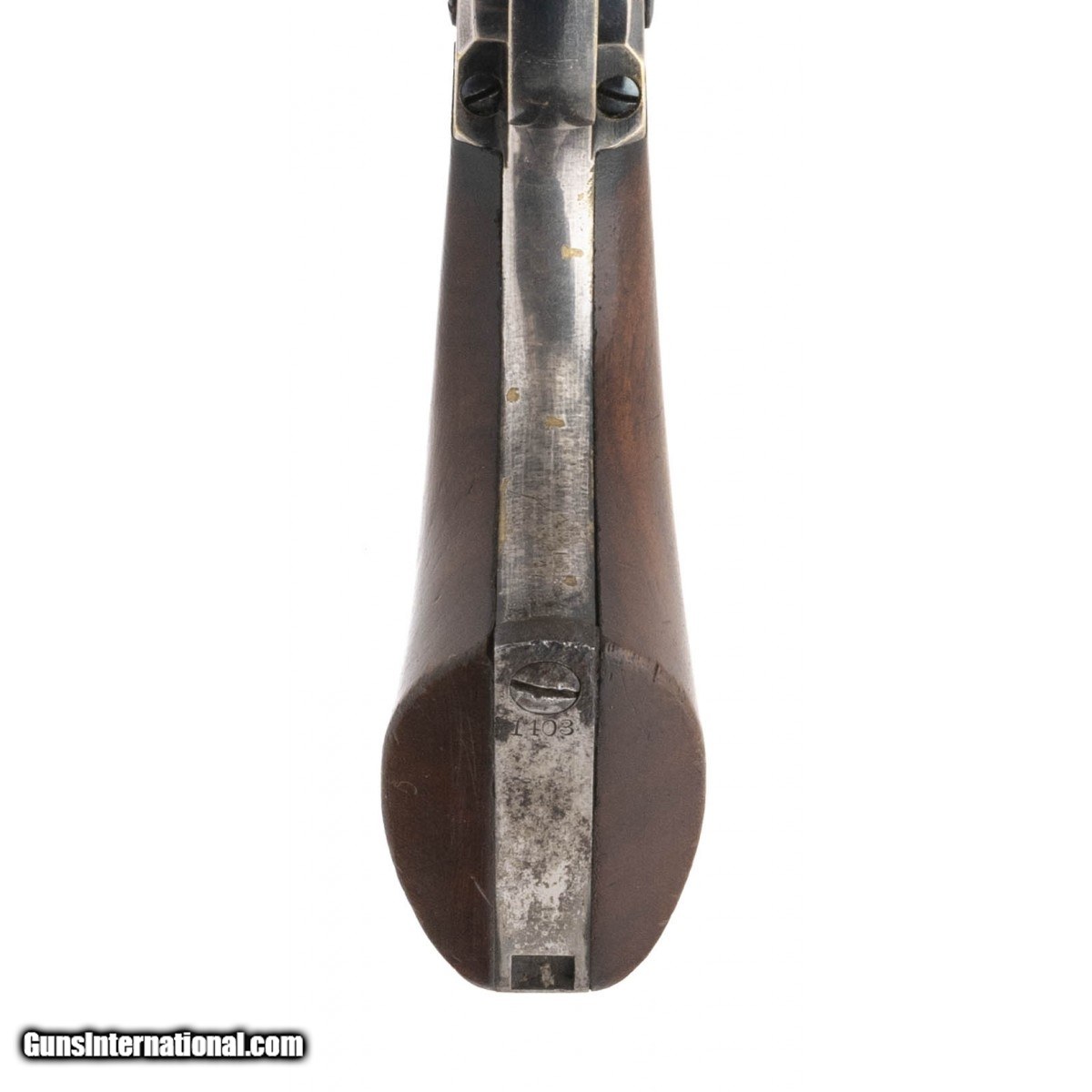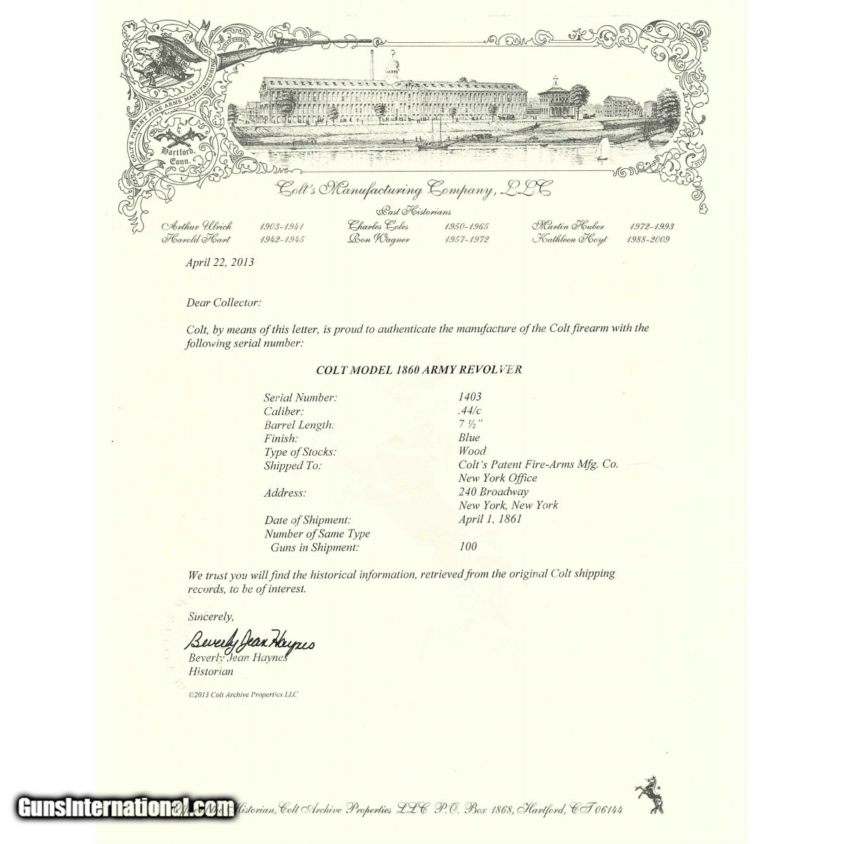 Description: "Serial number 1403. Made in 1861. 44 Caliber with a 8" barrel. Absolutely beautiful gun with 90% of the original blue on the barrel, bright case colors on the frame, 85% of the original blue on the cylinder and 95% of the original silver on the back strap and trigger guard. Grips are excellent. This gun is listed in the Rhode Island Historical Society as being issued to Elisha Whitford of the 1st Rhode Island Cavalry. A packet of Documentation accompanies this gun along with a Colt factory letter. SOLD Antique: Yes |