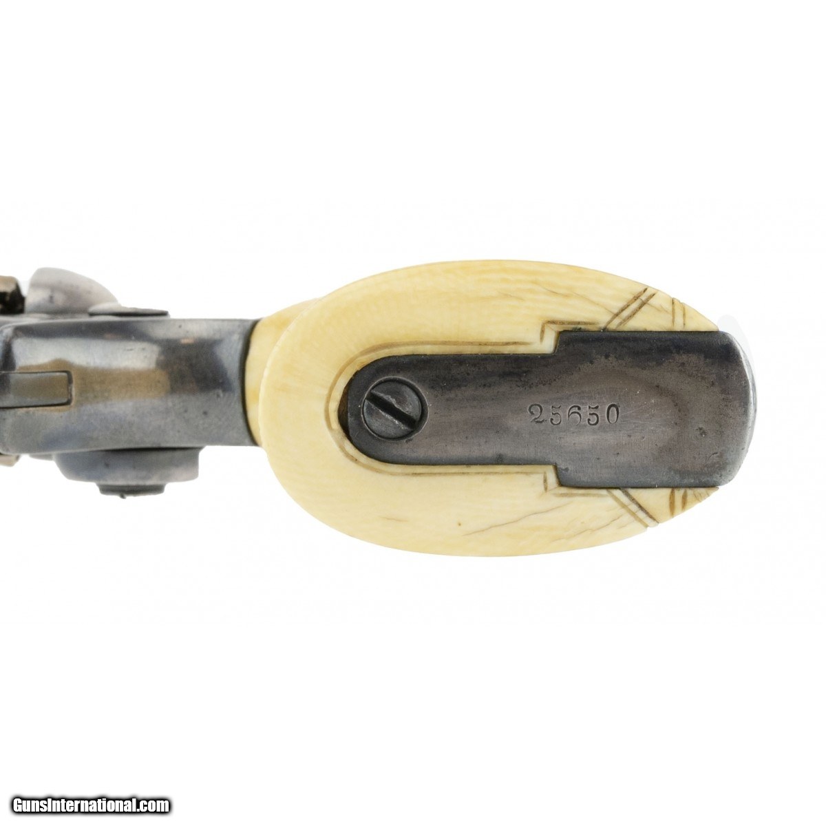 Description: " Commonly called the ""Root Model"", this revolver was produced from 1855 to circa 1870. This is a Model 3 with 3.5"" octagon barrel with an excellent bore, Hartford address with the pointing hand motif, 28 caliber, and full fluted cylinder with a clear patent marking. With the exception of the gold-washed cylinder, this revolver is silver plated. Most of the silver plate has tarnished but but is present except for edges and high points. The ivory grips are fine with checkering at the bottom edge and rear corner. Included in the case are the correct Colt-marked brass mold with sprue cutter, a two-sided Colts Patent eagle powder flask, a cleaning rod, several loose balls, and the key. The case is in excellent condition with intact partitions. This is an unusual and somewhat rare combination finish cased Model 3 Root Revolver. SOLD Antique: Yes |