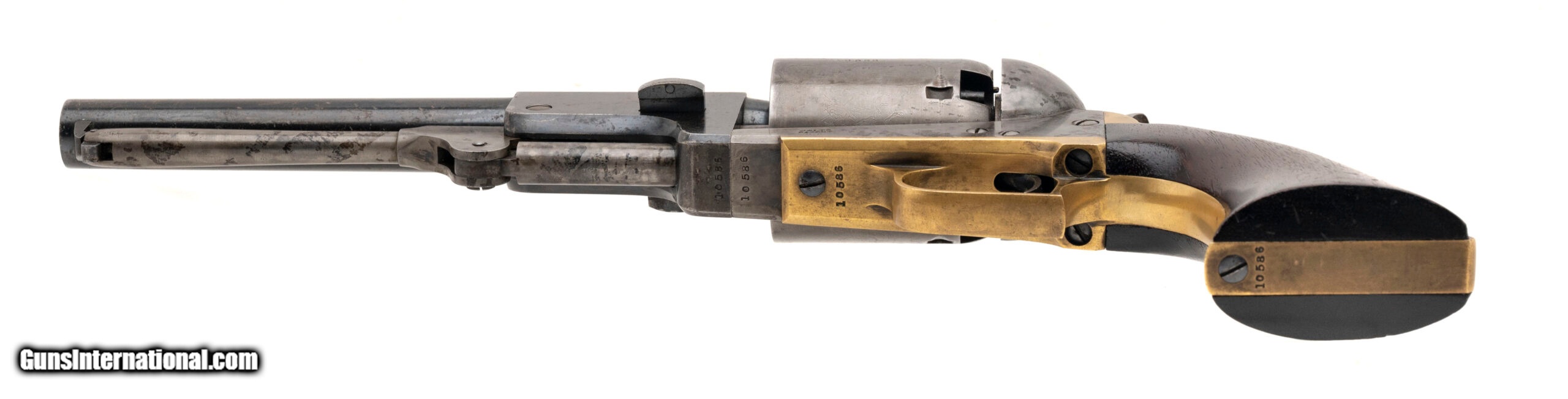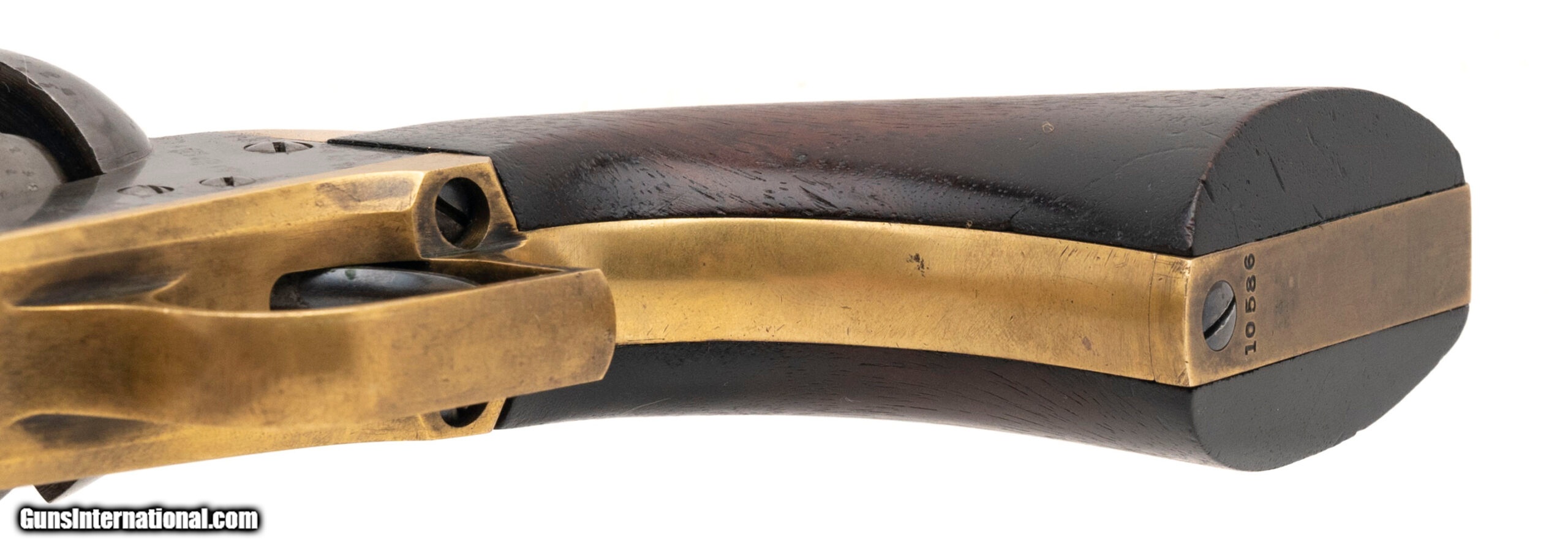 Description: "Serial number 10586. Made in 1851. 44 caliber with a 7.5" barrel. This gun is in excellent condition with 60% of the original blue finish on the barrel, traces of case colors remain. The cylinder scene is. All numbers are matching. This grips are excellent with good sharp cartouches. This is a very fine example of a Colt 2nd Model Dragoon! SOLD Antique: Yes |