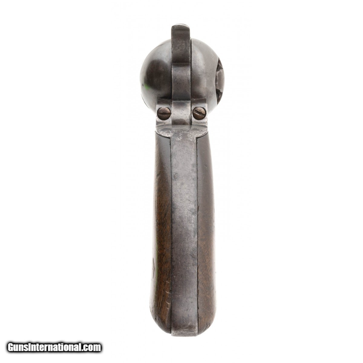 Description: "Serial number 1247. Made in 1847. 44 caliber with a 7 ½" barrel. Very fine example of Whitneyville Hartford Dragoon. Metal is nice and sharp with a light brown patina. Cylinder scene has most of the original scene. Grips are excellent with most of the original varnish. The trigger guard still has most of the original silver while the back strap has 10% - 15% of the original silver. This gun is all matching. Cylinder is unnumbered and never had one. This gun comes with a letter from famed dealer and Collector Arnold Marcus Chernoff. Very rare gun in very fine condition from what you normally find these in! SOLD |