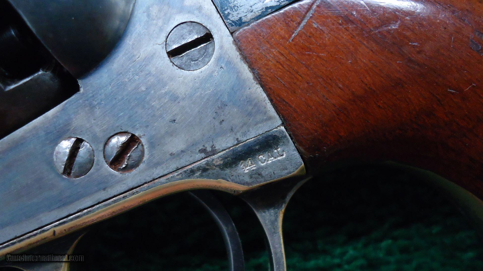 Description: 44 caliber. A very nice clean gun with about 25% vivid glossy blue on the barrel with the balance having flaked and turned a blue/brown color. Excellent case colors on the lever. The trigger guard has 75% of original silver that is turning a dark patina. Good traces of blue on the backstrap. Frame has a Colt patent marking on a 2-line address and probably 60-70% vivid case colors. Excellent case color on the hammer as well. Cylinder has matching numbers with most of the cylinder scene visible and a plum/brown color. Crisp tight mechanics. Grips retain most original varnish. The case looks like it has been relined years ago and is in good condition with the correct Colt Peace flask, some bullets and a tin of primers. 177k serial range. Leroy Merz Antique Firearms specializes in antique and vintage Winchesters and other fine American firearms. Since 1965 Mr. Merz has taken part in the world of firearms and has been a contributor to many well known reference books. We have hundreds of additional guns in every price range at our home online. Search for Merz Antiques in google. SOLD Antique: Yes |
