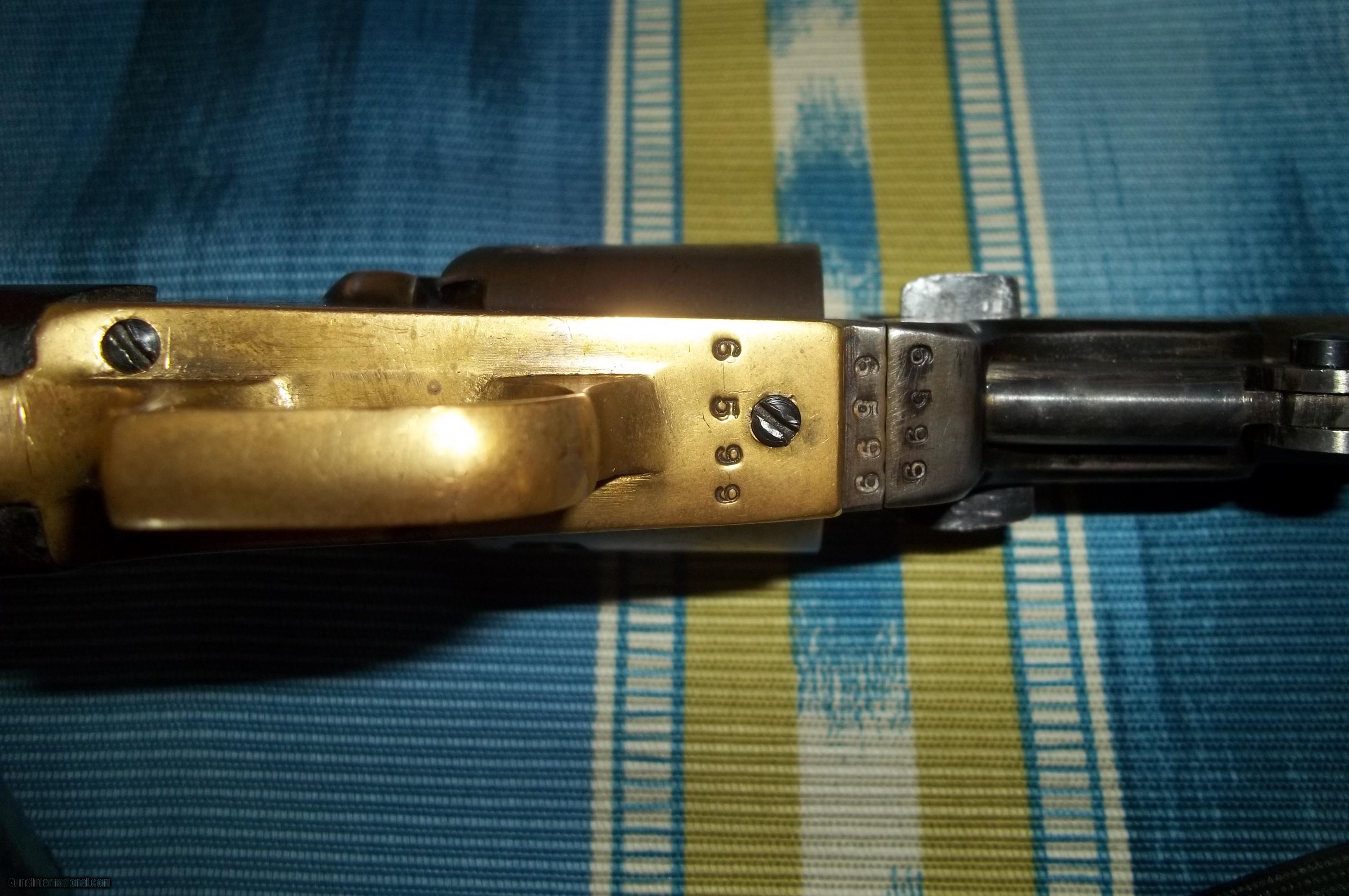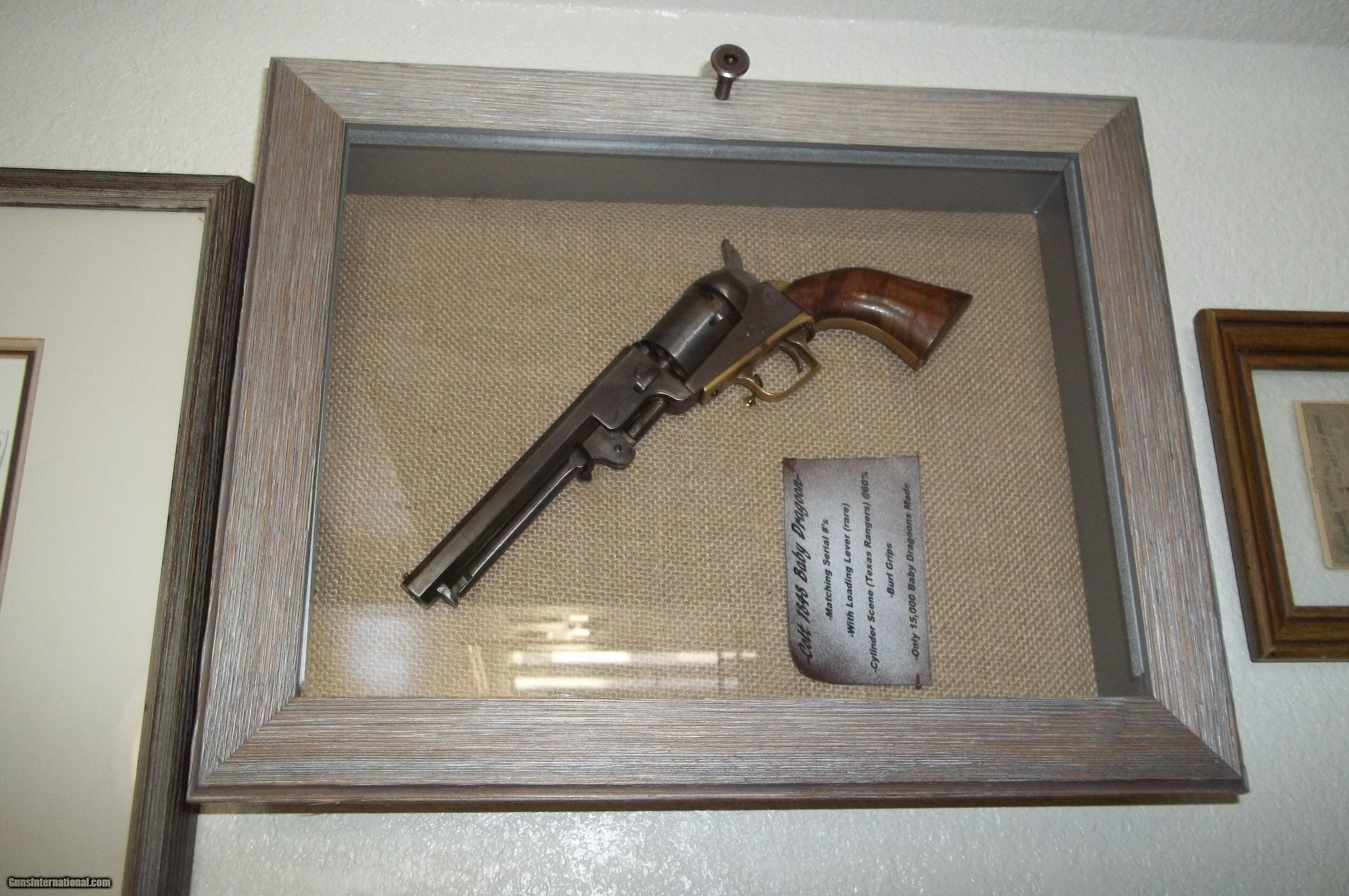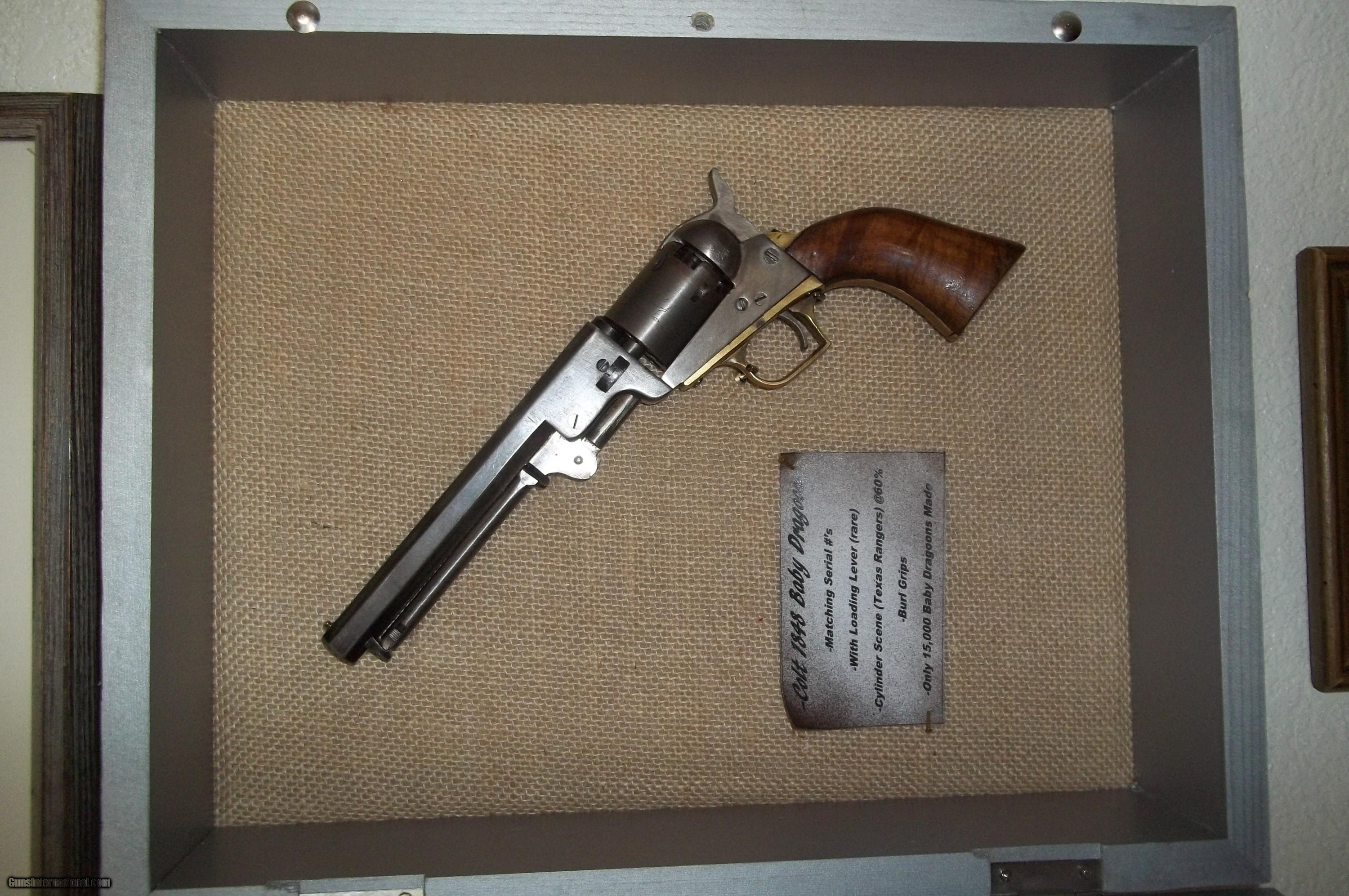 Description: 1848 Colt Baby Dragoon .31 caliber with early serial #6599 (only about 15,000 made) with 6” barrel. Matching numbers including wedge. Has rare loading lever. Address barely visible. A handsome old gun and a fine representation of the model with an even patina, case hardened areas and virtually no exterior pitting but appears in areas to have been buffed. Original burl grips in fine condition. Cylinder scene clearly visible (Texas Ranger and Indian fight as on early examples). Good bore and rifling with tight mechanicals. A unique example including display case. $4,850-including shipping. No FFL required. As with all vintage weapons if buyer desires to fire, it should be inspected by a gunsmith to certify safety. Cashier’s check or money order payable to Collector and Investment Arms L. L. C.. SOLD Antique: Yes Manufacturer: Colt Model: 1848 Baby Dragoon Caliber Info: .31 |