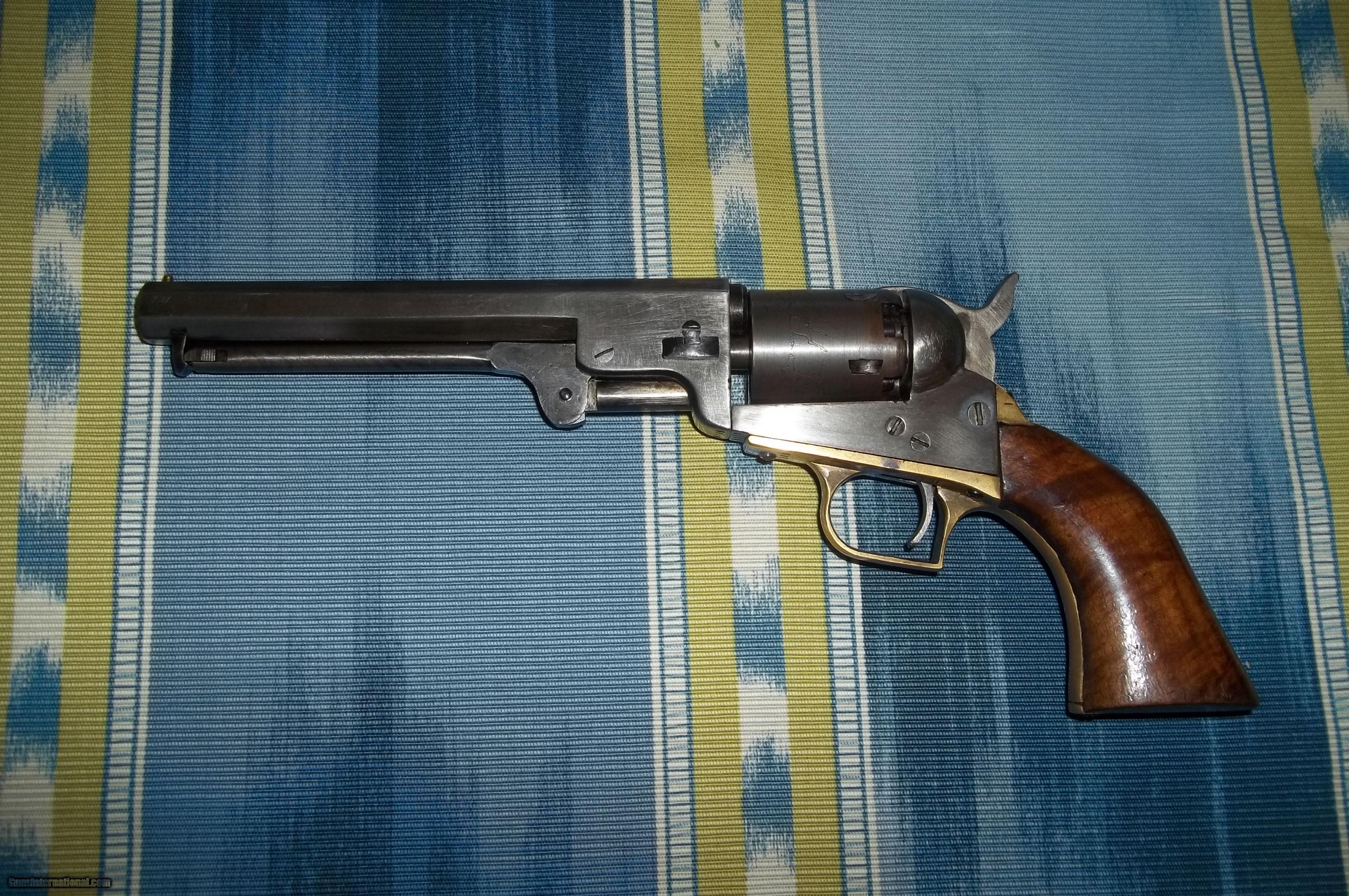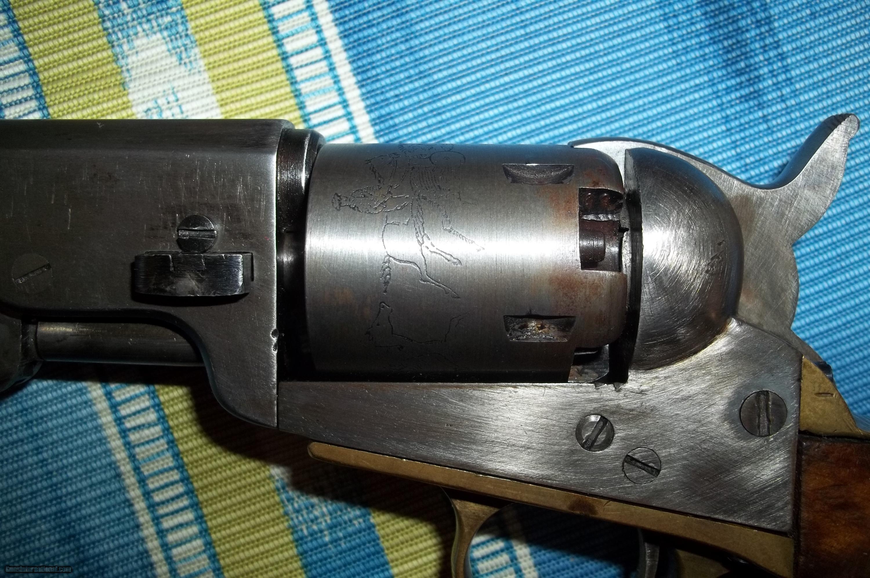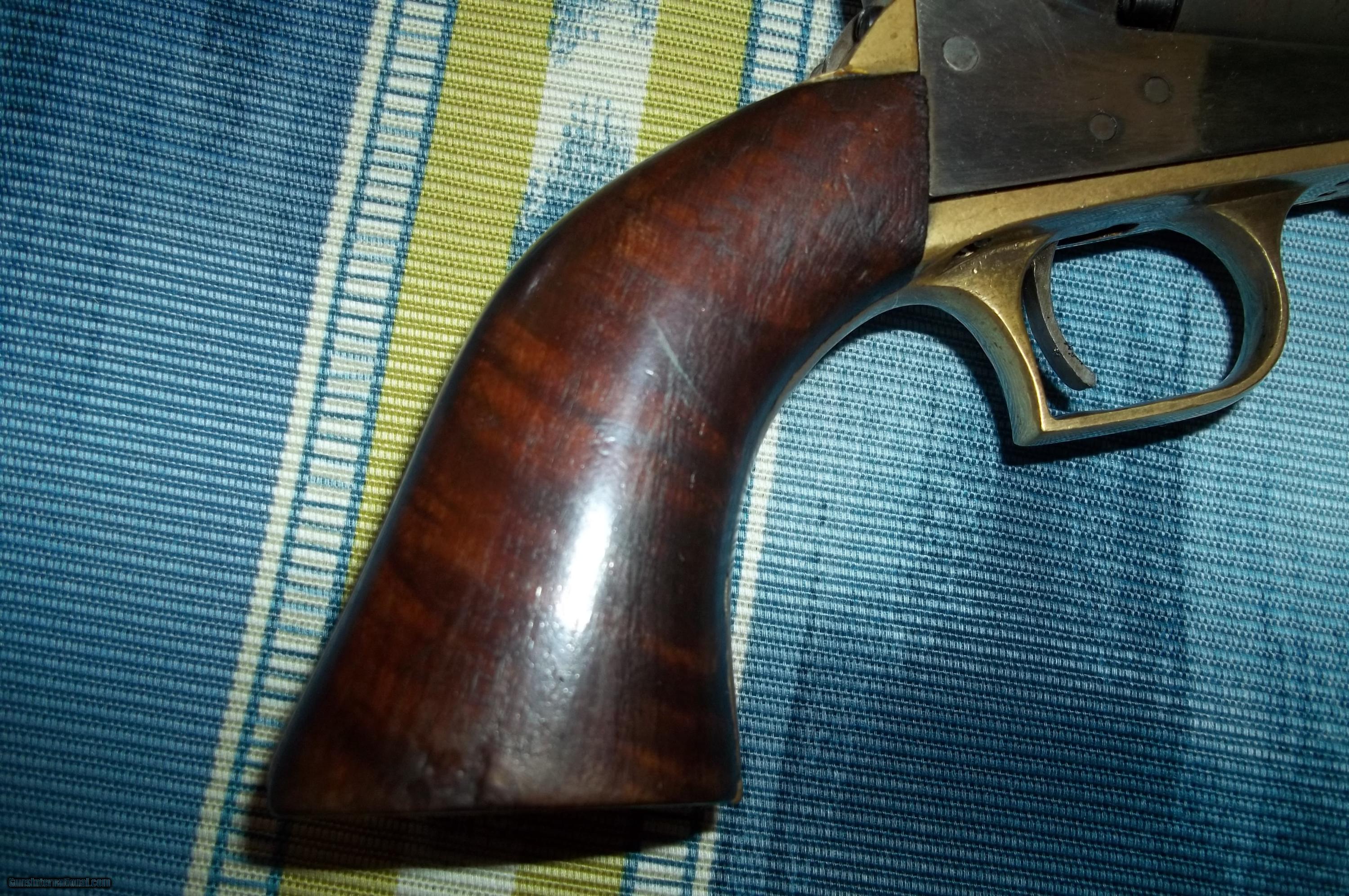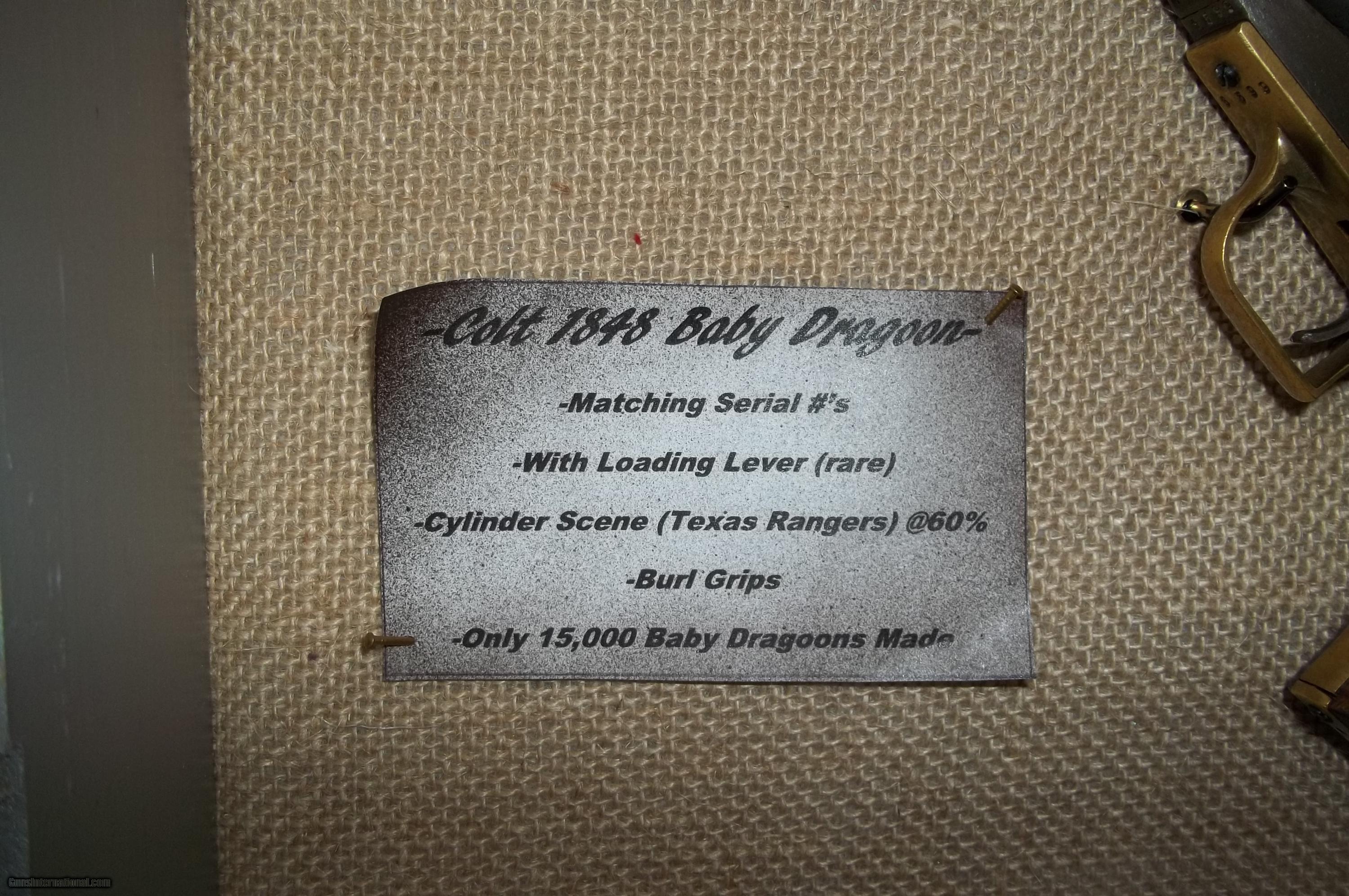 Description: 1848 Colt Baby Dragoon .31 caliber with early serial #6599 (only about 15,000 made) with 6” barrel. Matching numbers including wedge. Has rare loading lever. Address barely visible. A handsome old gun and a fine representation of the model with an even patina, case hardened areas and virtually no exterior pitting but appears in areas to have been buffed. Original burl grips in fine condition. Cylinder scene clearly visible (Texas Ranger and Indian fight as on early examples). Good bore and rifling with tight mechanicals. A unique example including display case. $4,850-including shipping. No FFL required. As with all vintage weapons if buyer desires to fire, it should be inspected by a gunsmith to certify safety. Cashier’s check or money order payable to Collector and Investment Arms L. L. C.. SOLD Antique: Yes Manufacturer: Colt Model: 1848 Baby Dragoon Caliber Info: .31 |