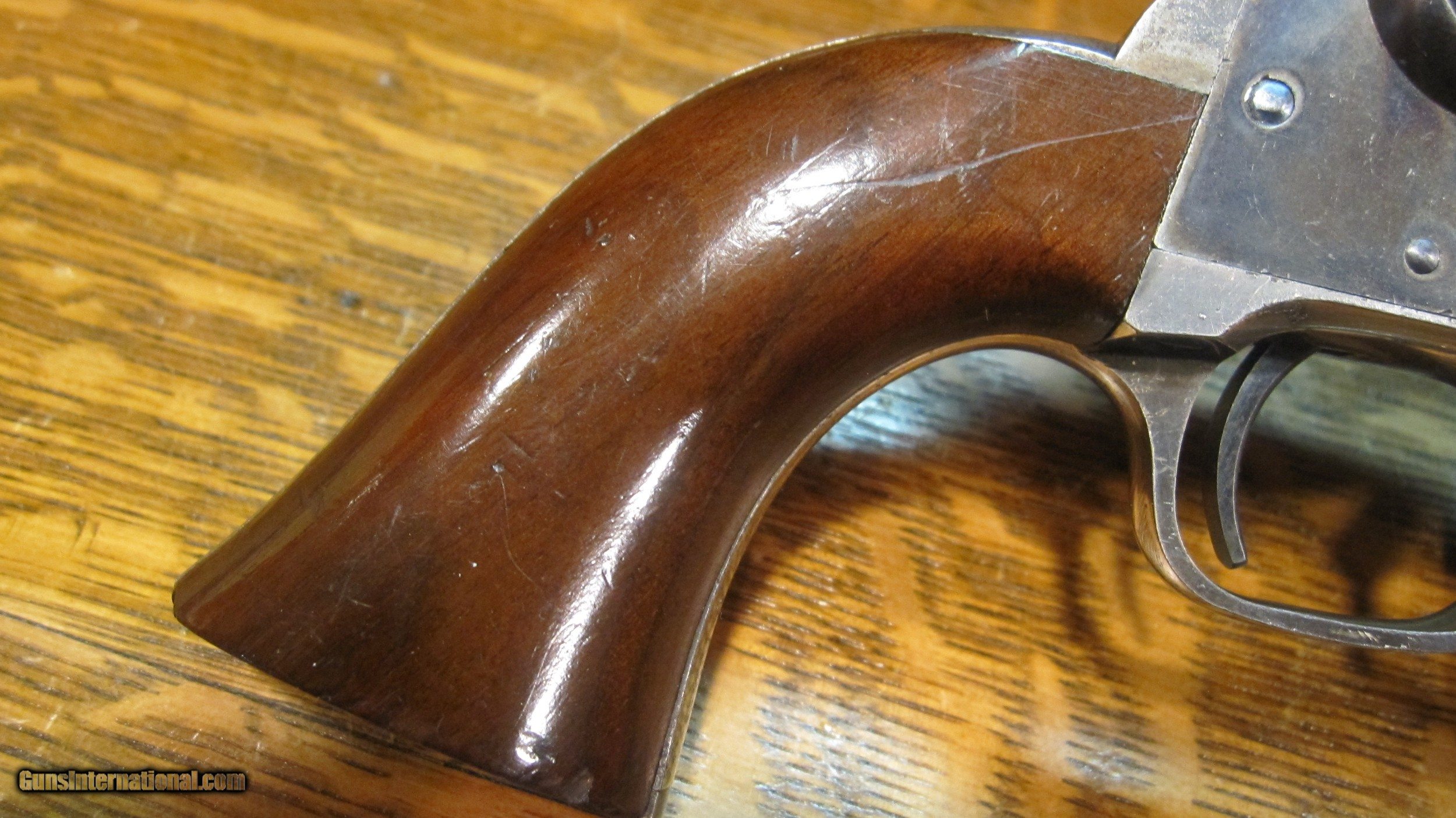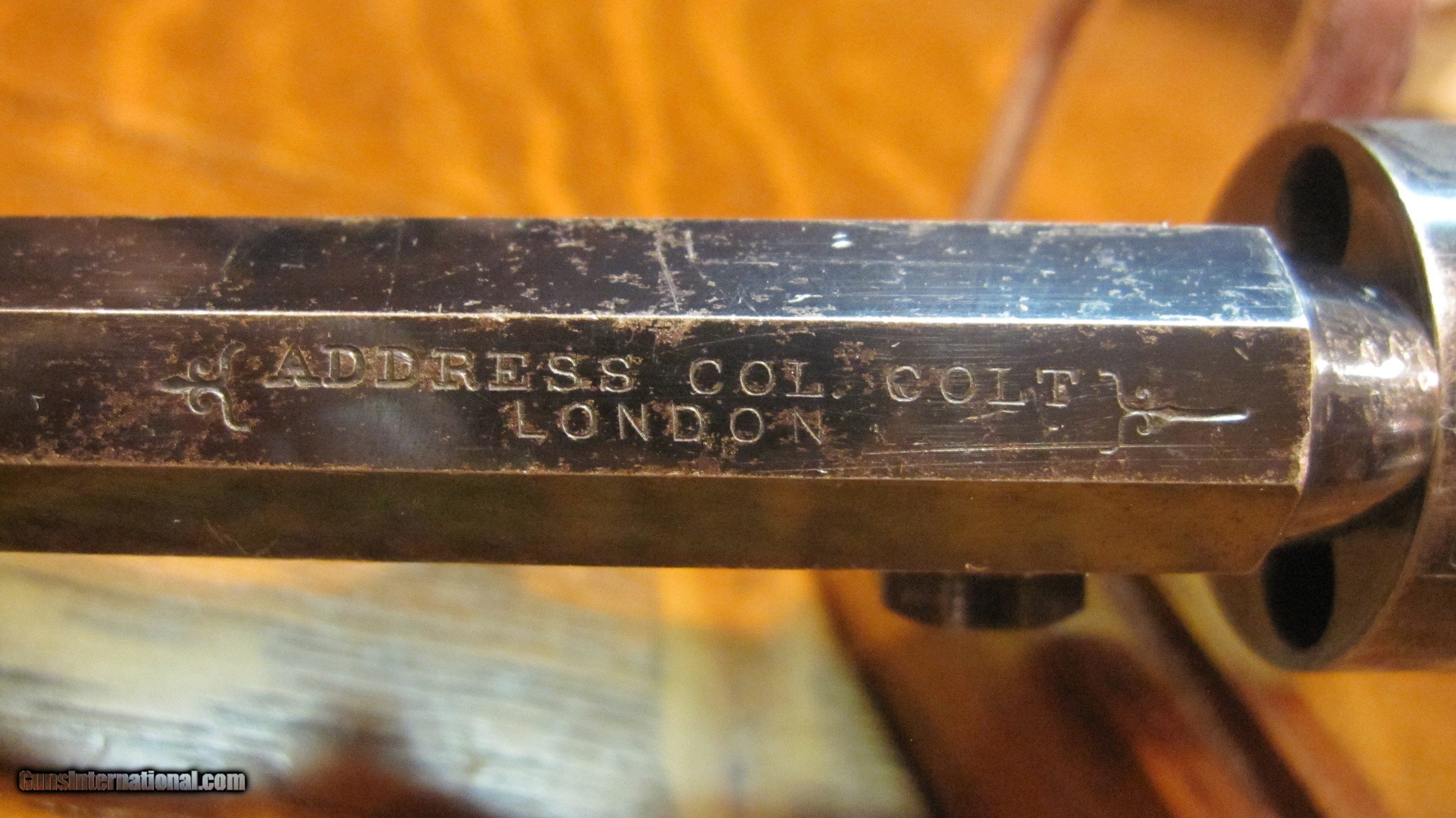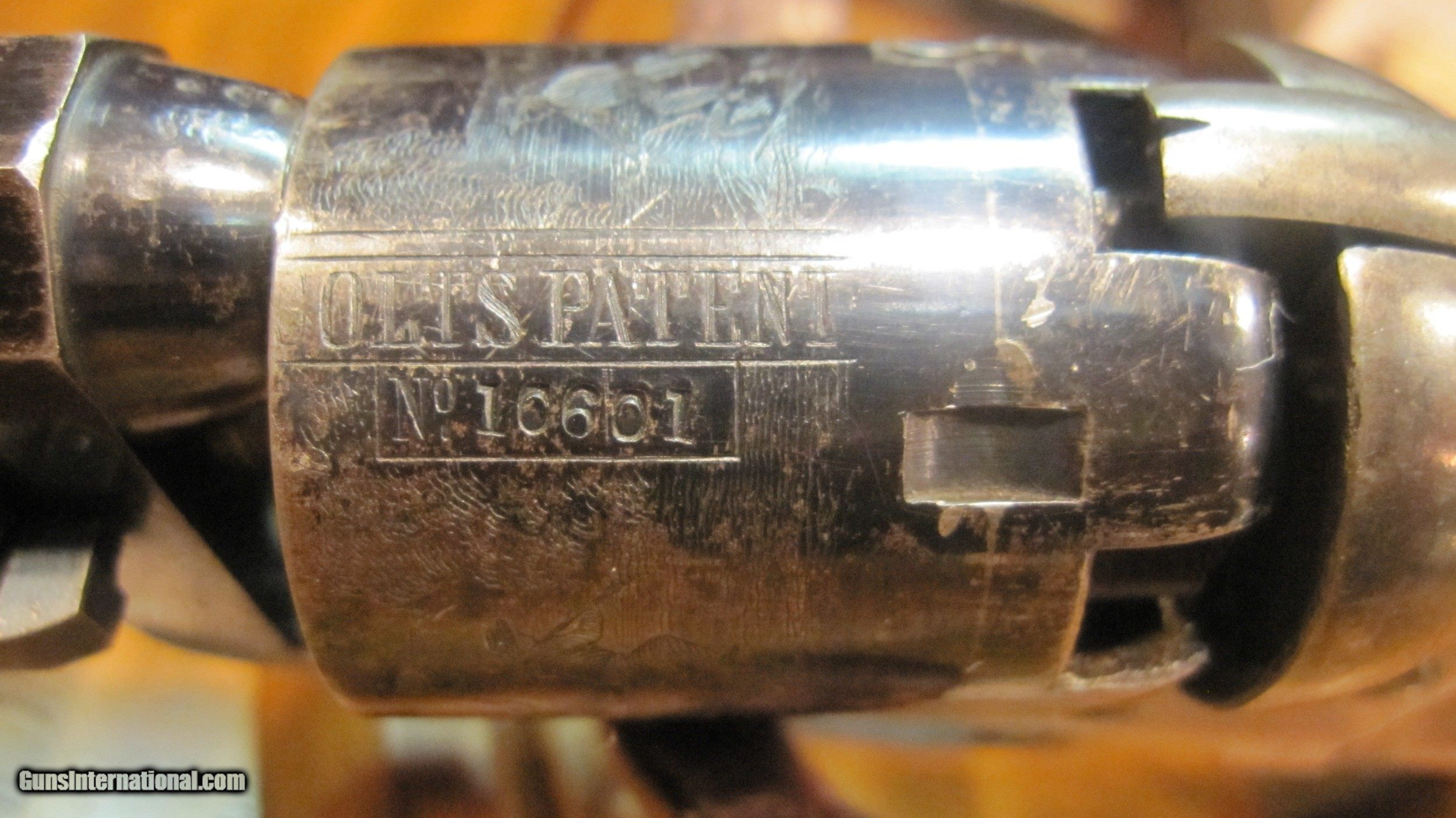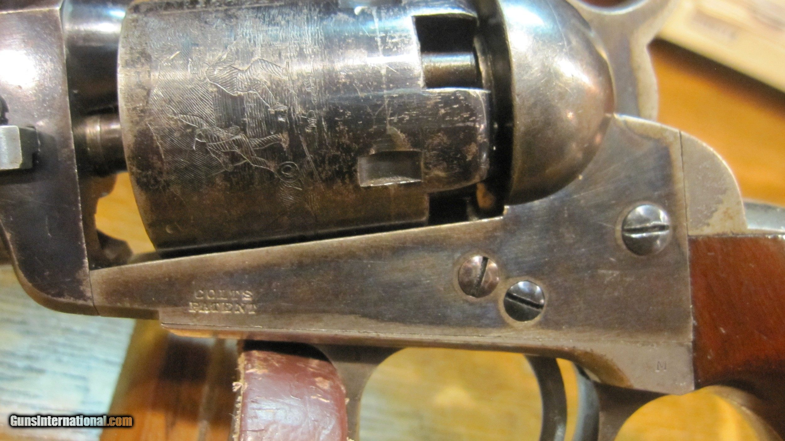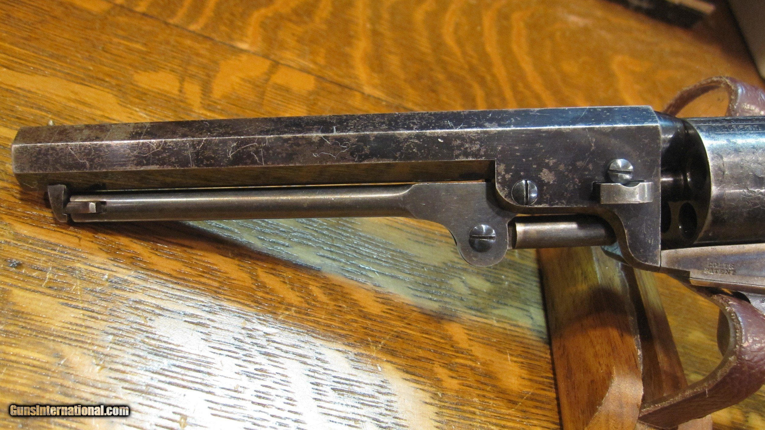 Description: 1849 Colt London 5 shot Pocket Revolver. Desireable 6" barrel. Serial No.10601. This revolver was produced in Hartford around 1861 from parts shipped back stateside after London Plant closed in 1857. This revolver has no British proof marks as it was produced here. Although made here, it is in the late-late London serial range as it was already serialed in London but not finished or assembled. Shipped back to Hartford sometime after 1857. London iron trigger guard and backstrap. Revolver has 94-95% original high polish blue on barrel and cylinder. Frame, hammer, and loading lever has all case colors. 96% silver on trigger guard and backstrap. 3 of the 5 safety pins are perfect. Cylinder scene is 100% and perfect. Very strong action. Hartford style grips have 98% original finish. Screws are all about perfect with all original finish. I believe this revolver fired very little, if at all, as some blue left in chambers and a very strong bore. A fantastic 6" Pocket made for the Civil War in Hartford Connecticut. A VERY RARE variation of the 1849 Pocket. If you collect pockets, you won't find to many like this. Please call 973-214-3407 with questions SOLD Antique: Yes |