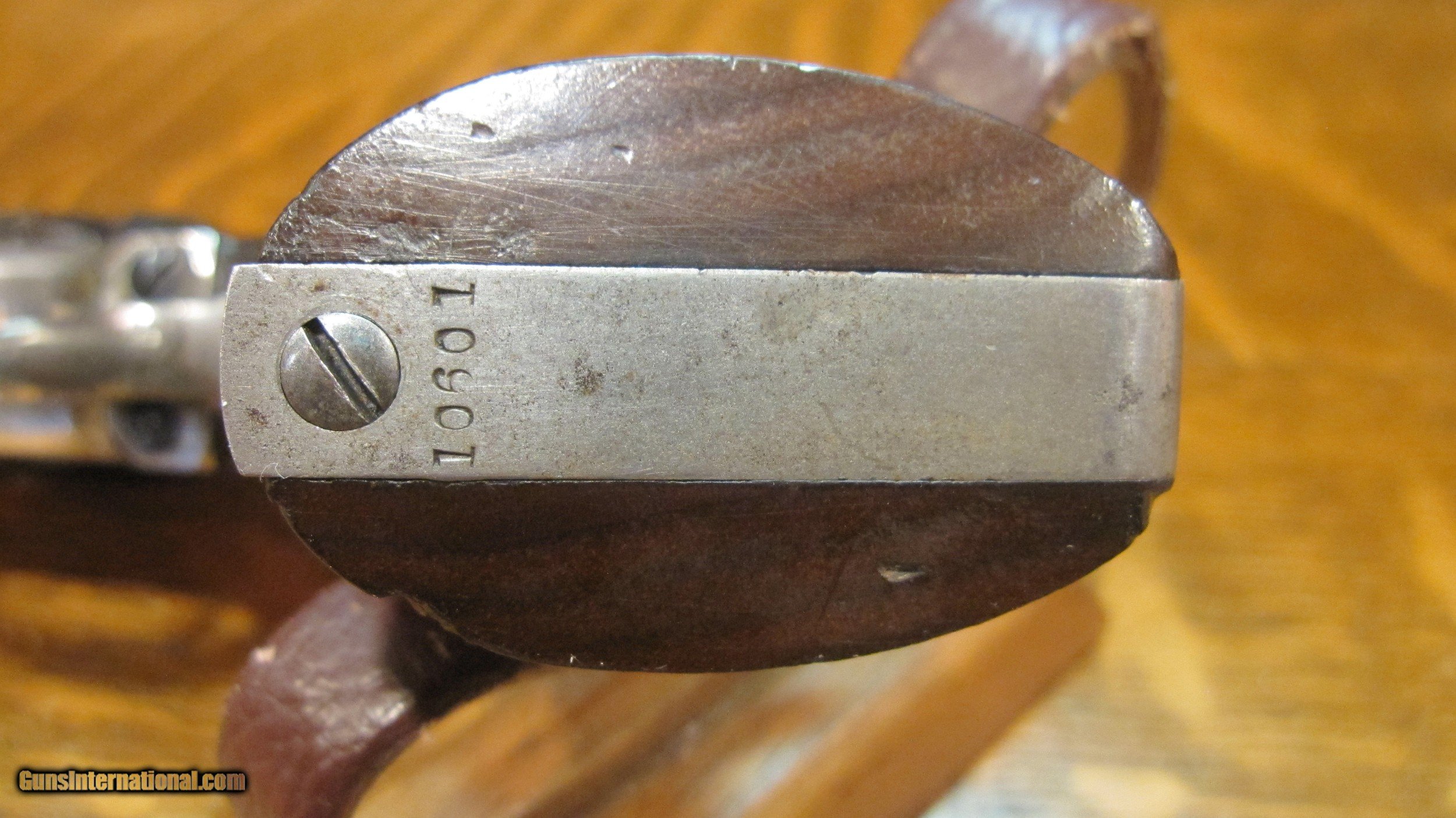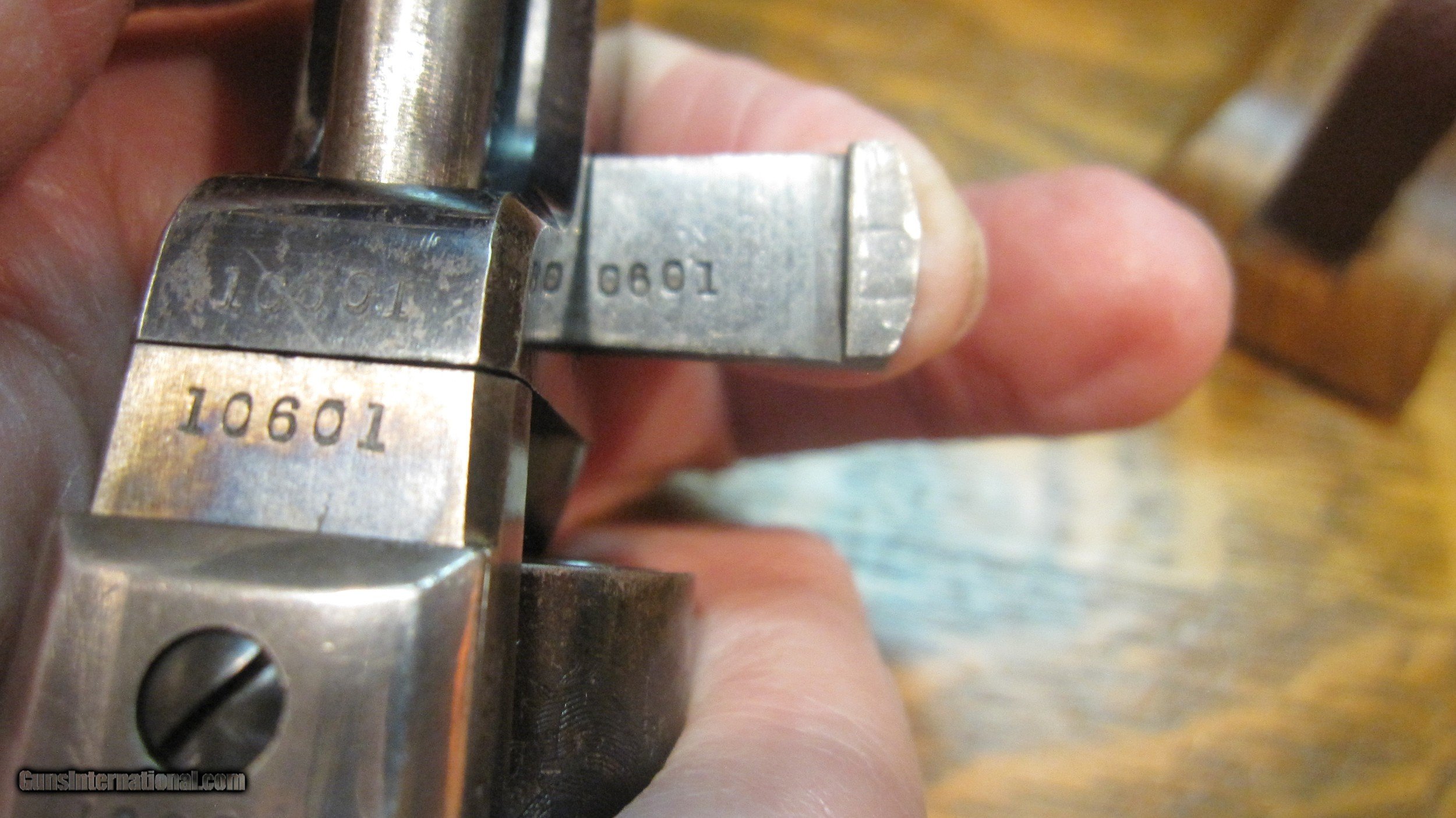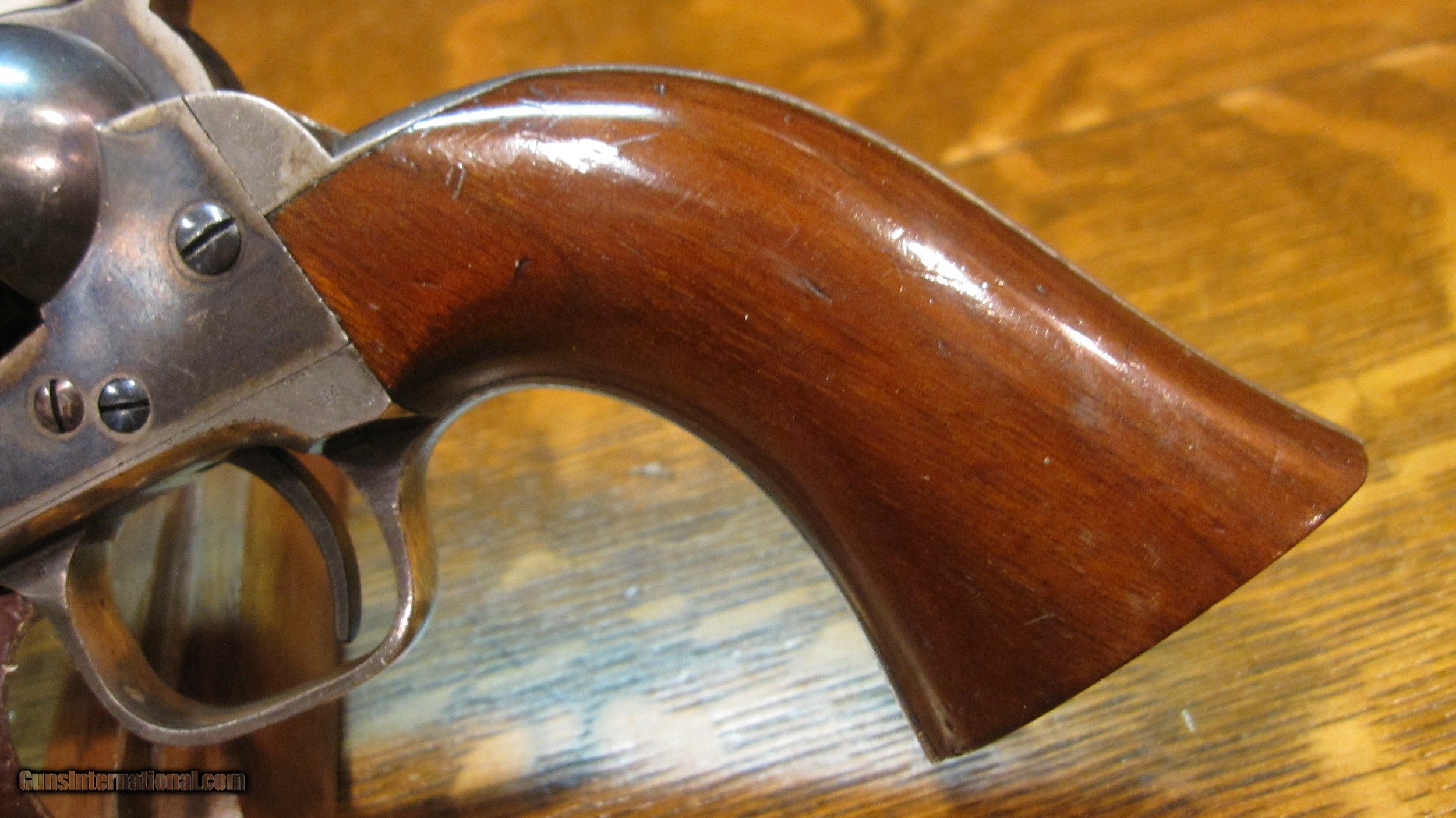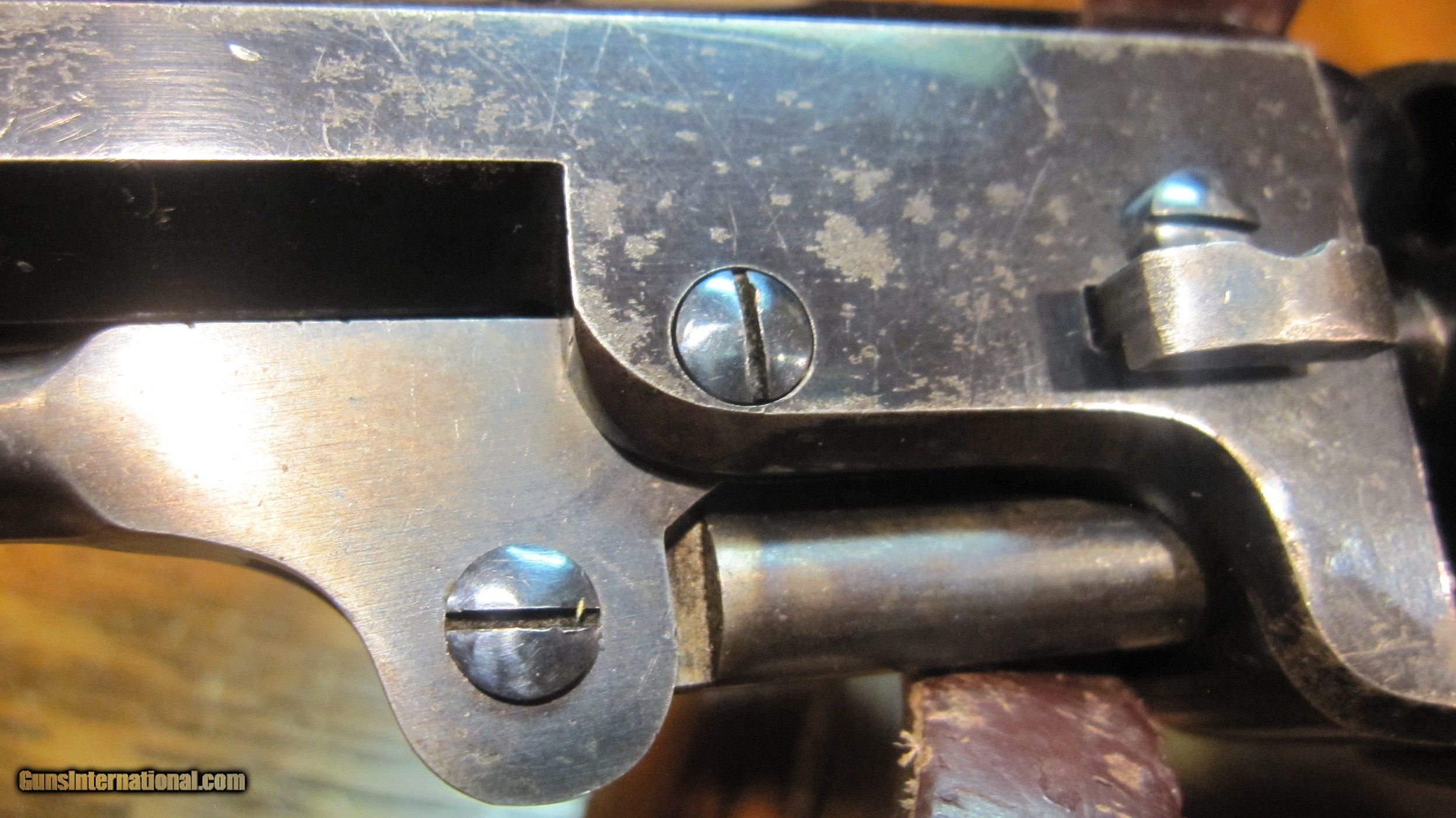 Description: 1849 Colt London 5 shot Pocket Revolver. Desireable 6" barrel. Serial No.10601. This revolver was produced in Hartford around 1861 from parts shipped back stateside after London Plant closed in 1857. This revolver has no British proof marks as it was produced here. Although made here, it is in the late-late London serial range as it was already serialed in London but not finished or assembled. Shipped back to Hartford sometime after 1857. London iron trigger guard and backstrap. Revolver has 94-95% original high polish blue on barrel and cylinder. Frame, hammer, and loading lever has all case colors. 96% silver on trigger guard and backstrap. 3 of the 5 safety pins are perfect. Cylinder scene is 100% and perfect. Very strong action. Hartford style grips have 98% original finish. Screws are all about perfect with all original finish. I believe this revolver fired very little, if at all, as some blue left in chambers and a very strong bore. A fantastic 6" Pocket made for the Civil War in Hartford Connecticut. A VERY RARE variation of the 1849 Pocket. If you collect pockets, you won't find to many like this. Please call 973-214-3407 with questions SOLD Antique: Yes |
