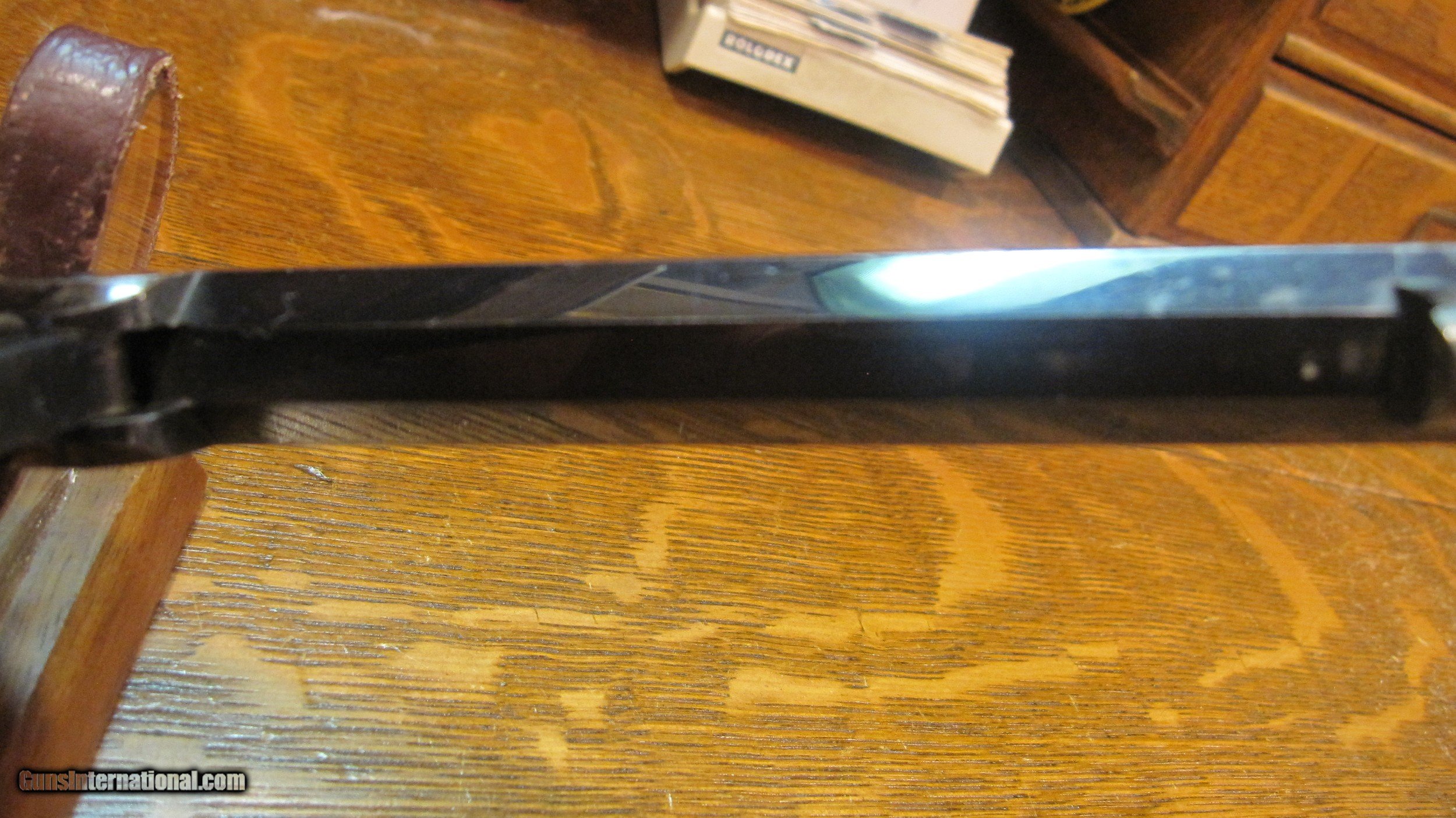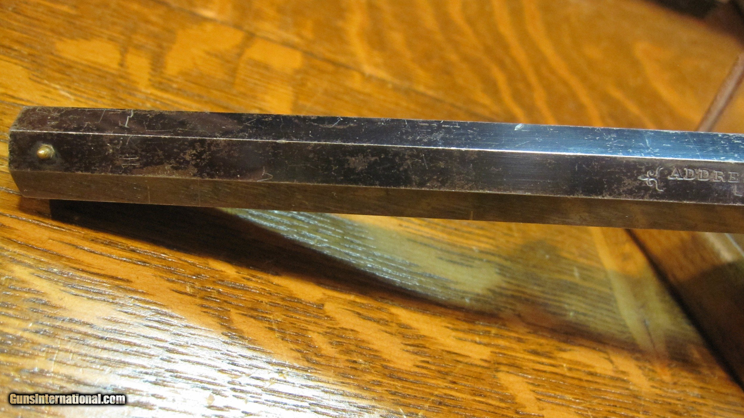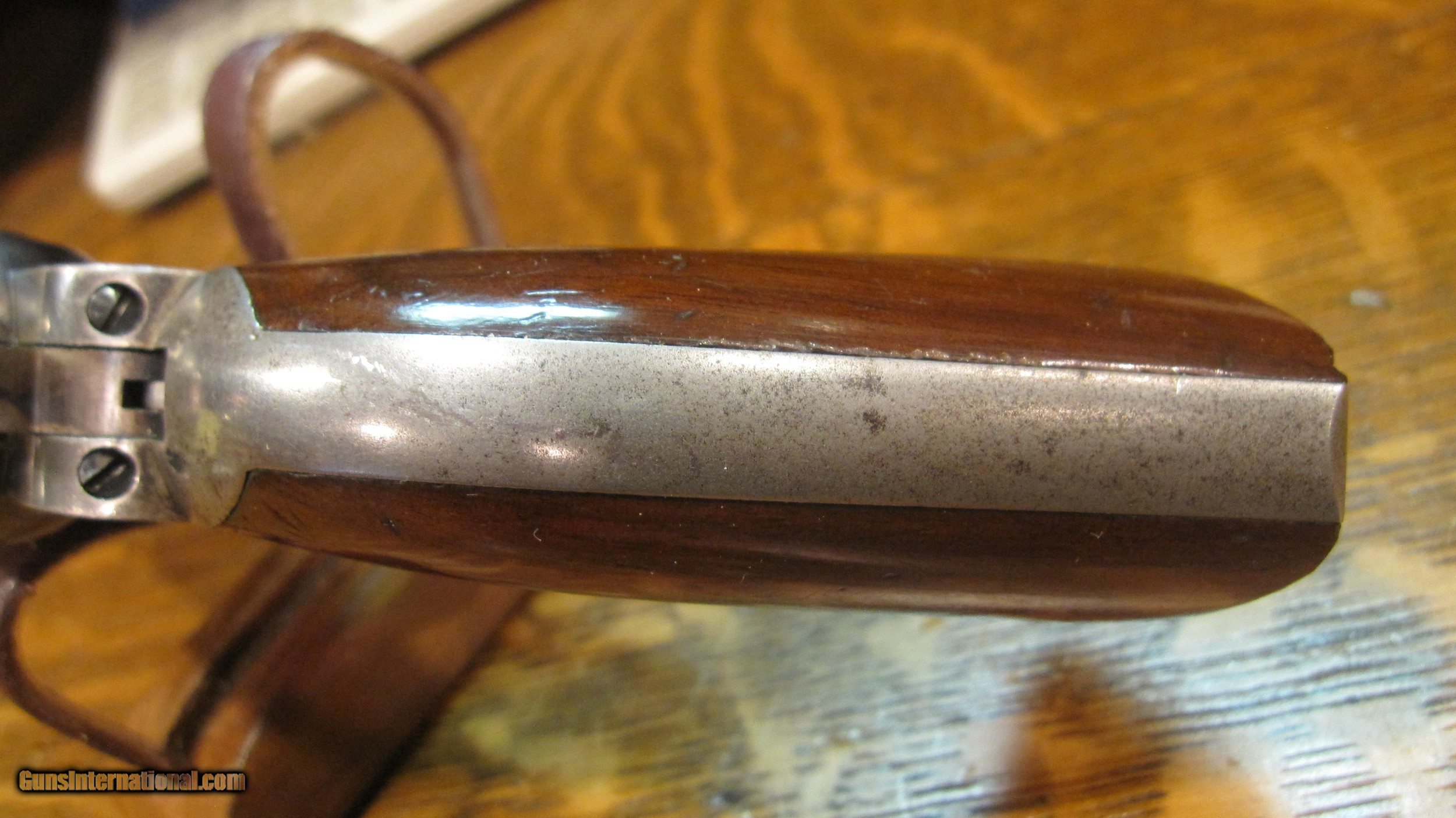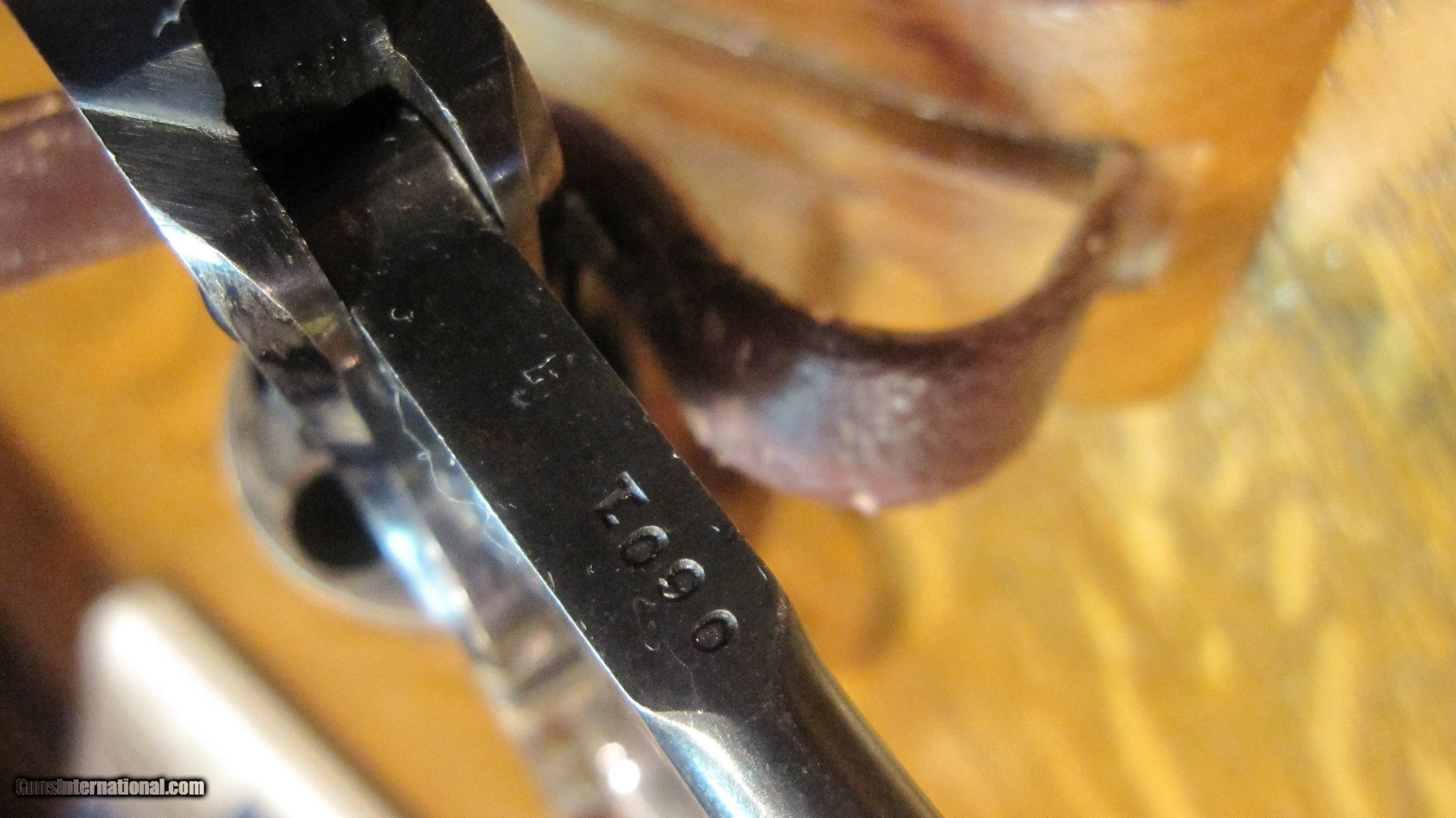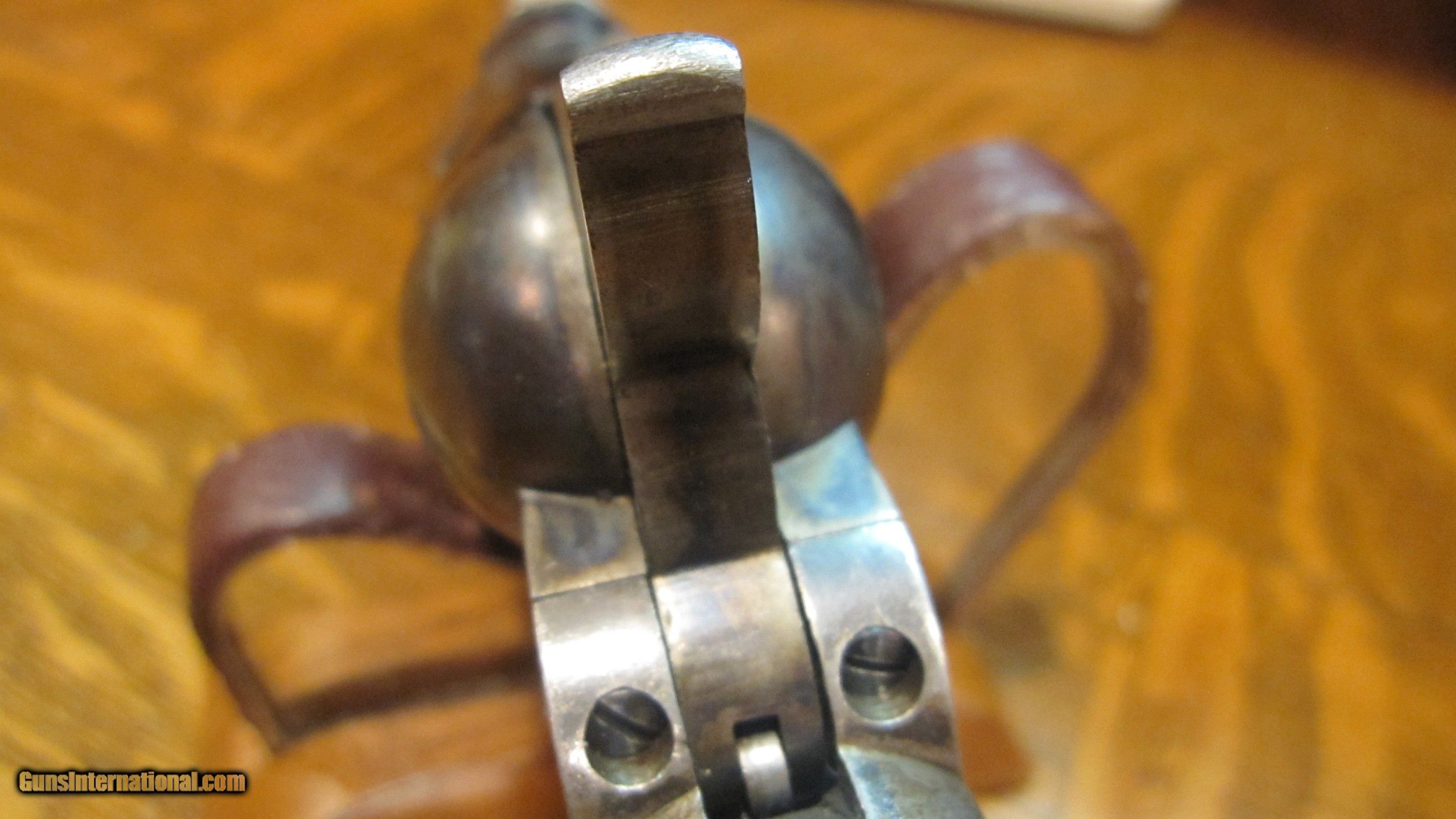 Description: 1849 Colt London 5 shot Pocket Revolver. Desireable 6" barrel. Serial No.10601. This revolver was produced in Hartford around 1861 from parts shipped back stateside after London Plant closed in 1857. This revolver has no British proof marks as it was produced here. Although made here, it is in the late-late London serial range as it was already serialed in London but not finished or assembled. Shipped back to Hartford sometime after 1857. London iron trigger guard and backstrap. Revolver has 94-95% original high polish blue on barrel and cylinder. Frame, hammer, and loading lever has all case colors. 96% silver on trigger guard and backstrap. 3 of the 5 safety pins are perfect. Cylinder scene is 100% and perfect. Very strong action. Hartford style grips have 98% original finish. Screws are all about perfect with all original finish. I believe this revolver fired very little, if at all, as some blue left in chambers and a very strong bore. A fantastic 6" Pocket made for the Civil War in Hartford Connecticut. A VERY RARE variation of the 1849 Pocket. If you collect pockets, you won't find to many like this. Please call 973-214-3407 with questions SOLD Antique: Yes |