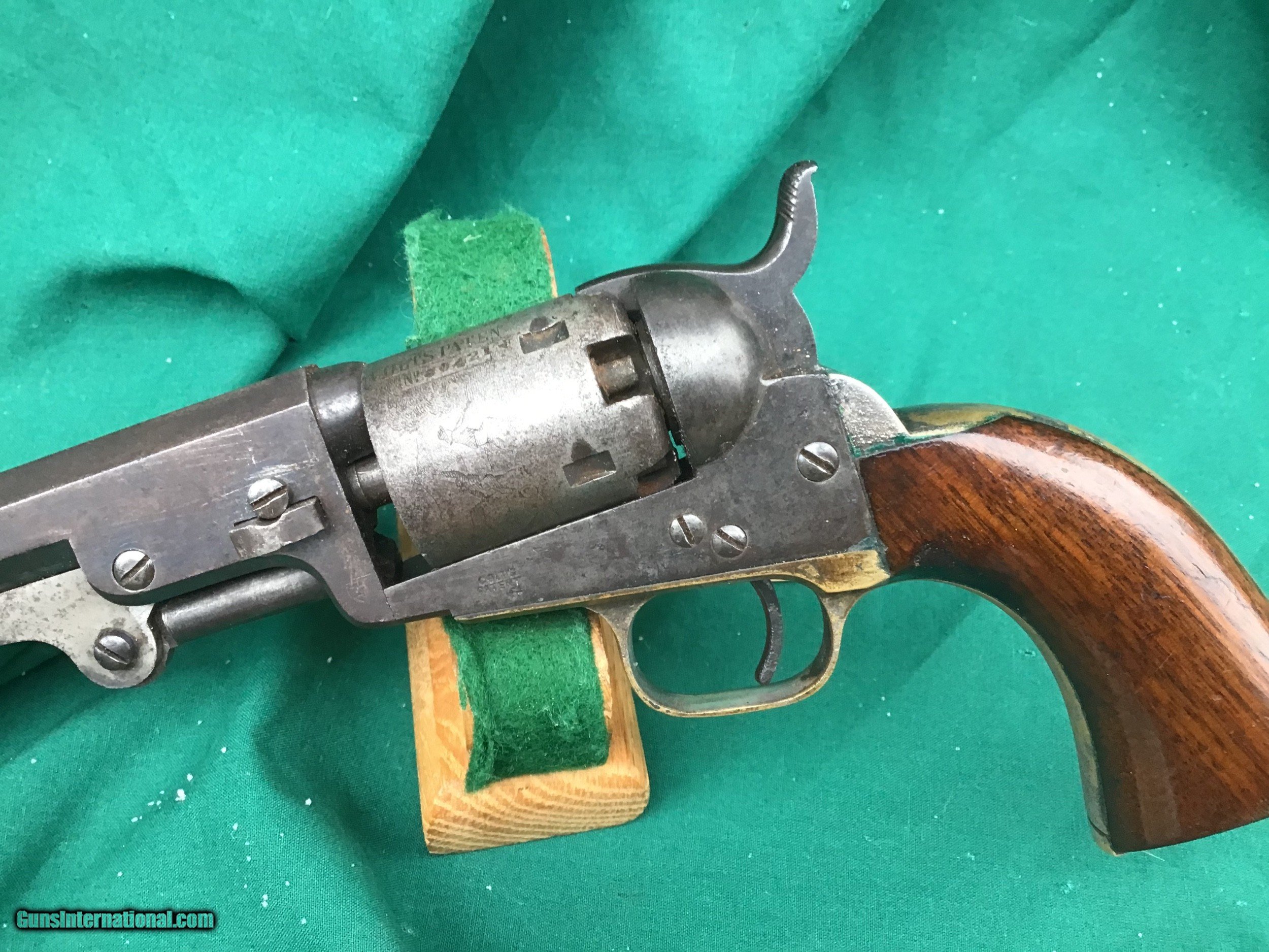 Description: Colt 1849 Pocket Revolver. Manufactured in 1853, nice early gun and most likely seen use in the Civil War. This is an all matching 1849: frame, barrel, trigger guard, blackstrap, cylinder, cylinder arbor, loading lever, and wedge all match. 6" barrel is a nice brown / gray patina with some nice original blue mixing in. Cylinder scene is almost 100% present. Frame retains some nice molted case colors. Great markings. Gun indexes properly and functions as it should. Traces of silver still showing on trigger guard and blackstrap. Grips are in very nice condition. This is an untouched 1849 Colt with the ever popular 6" barrel. Antique and can be shipped directly to your doorsteps. Please feel free to ask questions. SOLD Antique: Yes |