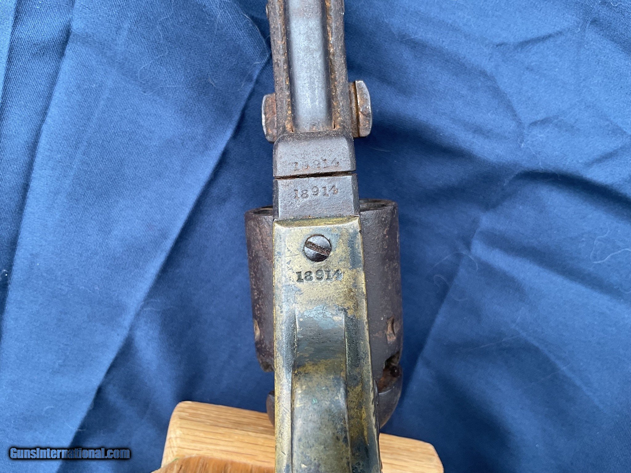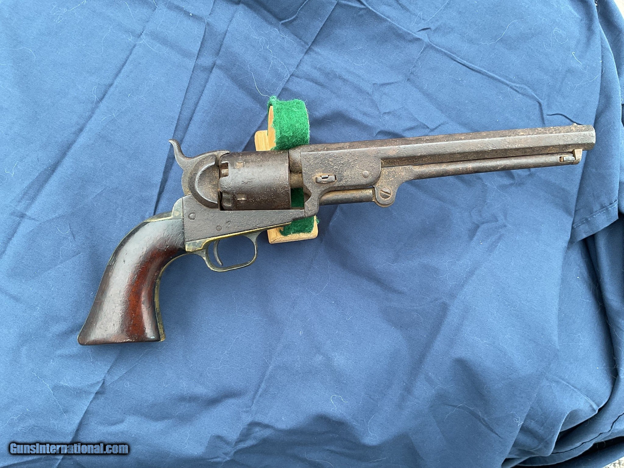 Description: For Sale: Authentic 1851 Colt Navy Revolver – Serial #18914 Caliber: .36 Percussion Condition: Fair at best – a testament to its storied history Matching Serial Numbers: Yes, all components match Grips: Original walnut grips in good condition Barrel Length: 7.5 inches Finish: Even patina, indicative of age and use This revolver is a prime example of the Colt 1851 Navy model, renowned for its craftsmanship and historical significance. The matching serial numbers across all parts confirm its authenticity, making it a valuable addition to any collection. The original walnut grips remain in good condition and action functions nicely. Bore is fair. This revolver may clean up nicely but I prefer to keep it in its original state. Please feel free to ask questions. I do offer a layaway (please contact me for the details). I will also consider trades. SOLD Antique: Yes |