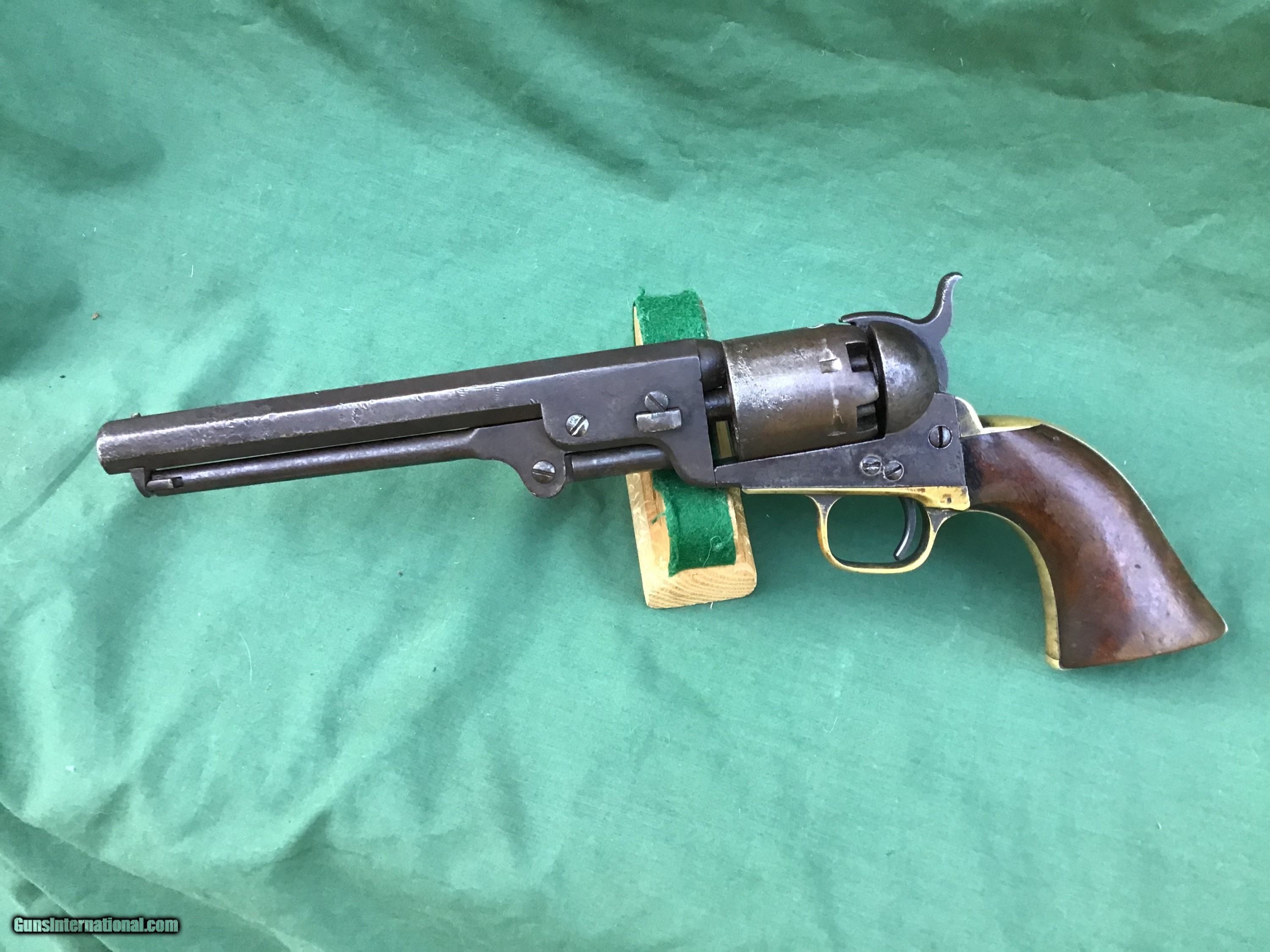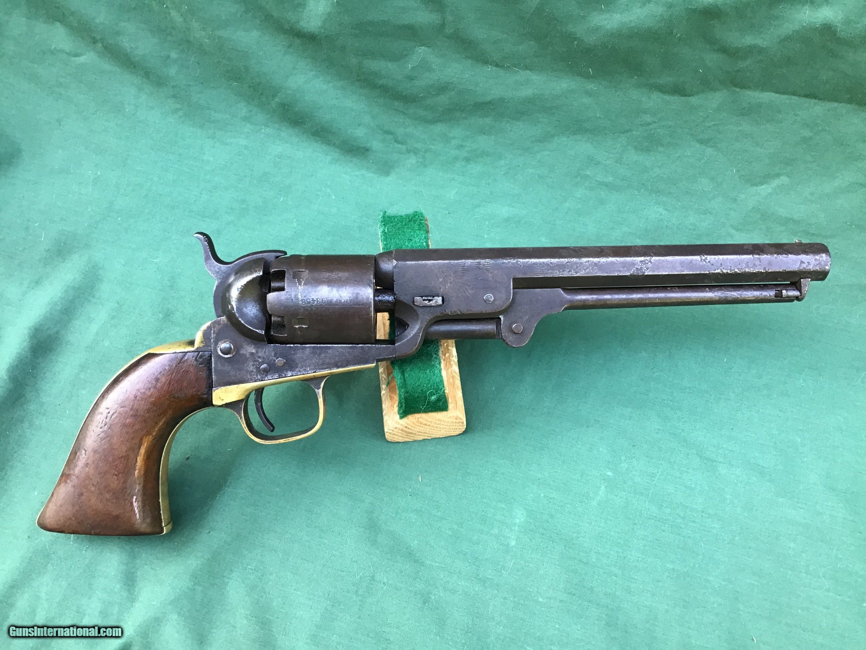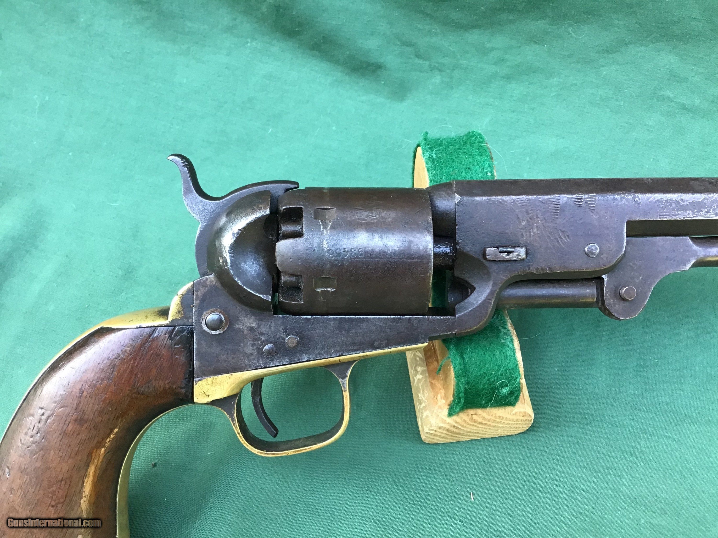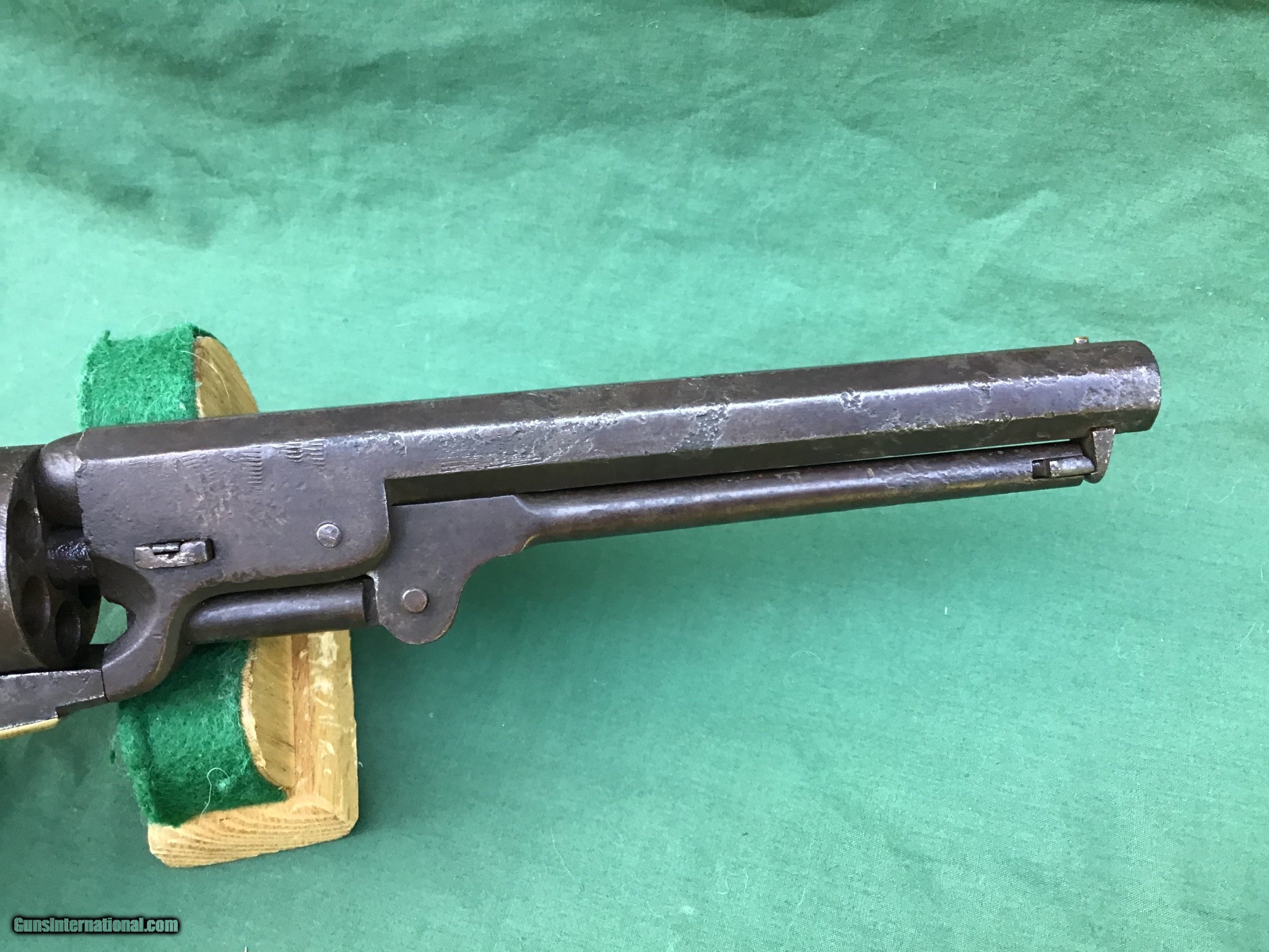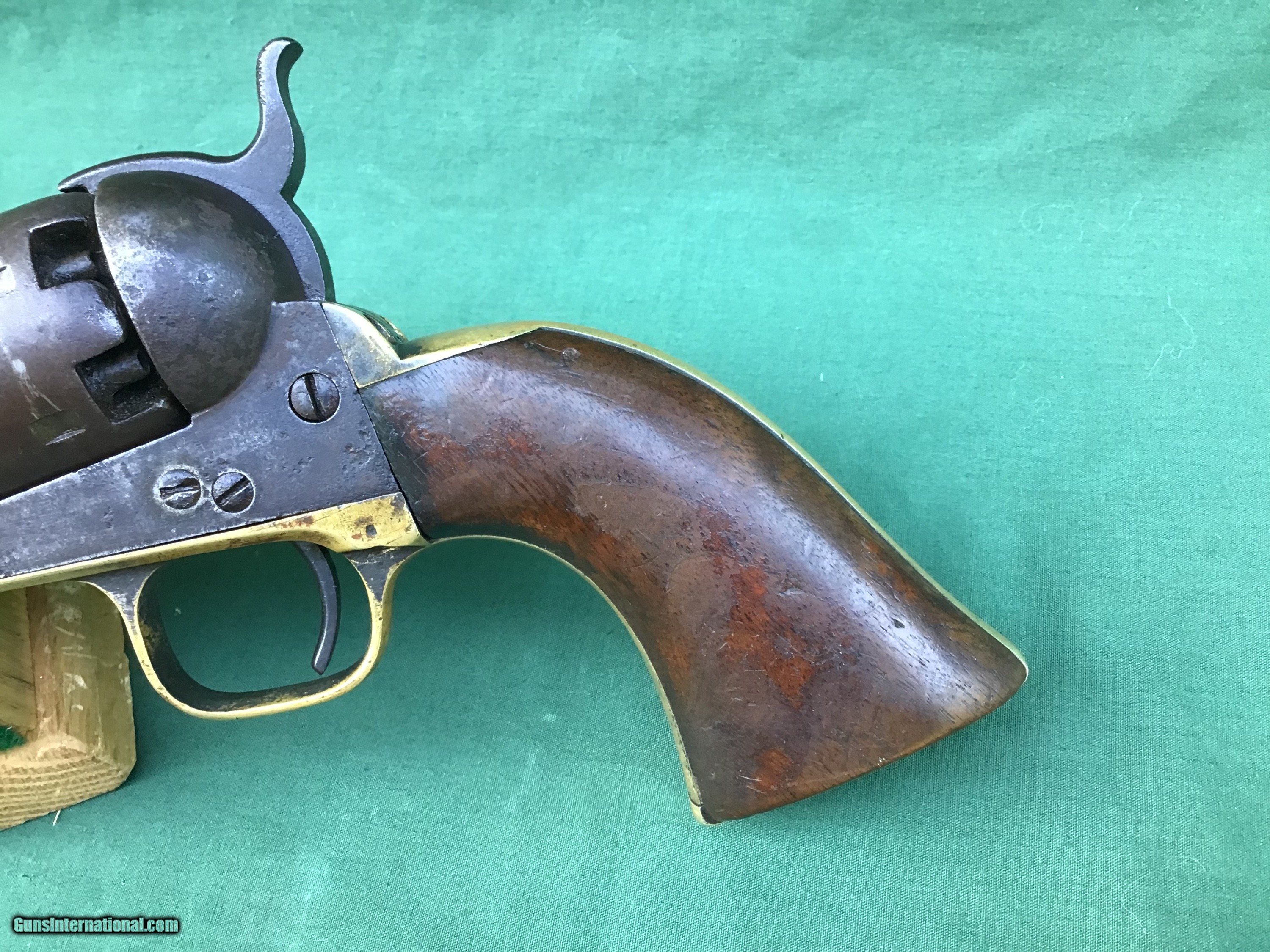 Description: 1851 Colt Navy with Hartford Barrel Address. All matching serial numbers including the wedge. Manufactured in 1860 right before the Civil War. It is believed by the majority of the collecting world that 1851 Navies manufactured in the 90,000 range with Hartford barrel addresses stood a good chance of being sold to the Southern States. This particular piece fits the part having a nice rich even dark brown patina, and heavily used exterior. Action indexes properly and grips are in good condition. 10 maybe 15% of the cylinder scene remains. 7 1/2" barrel with a decent bore. If your looking for 1851 Colt Navy that has a high percentage of being used by the South in Civil War, then here is your chance. Offered at below average price range. Please feel free to ask questions. SOLD Antique: Yes |