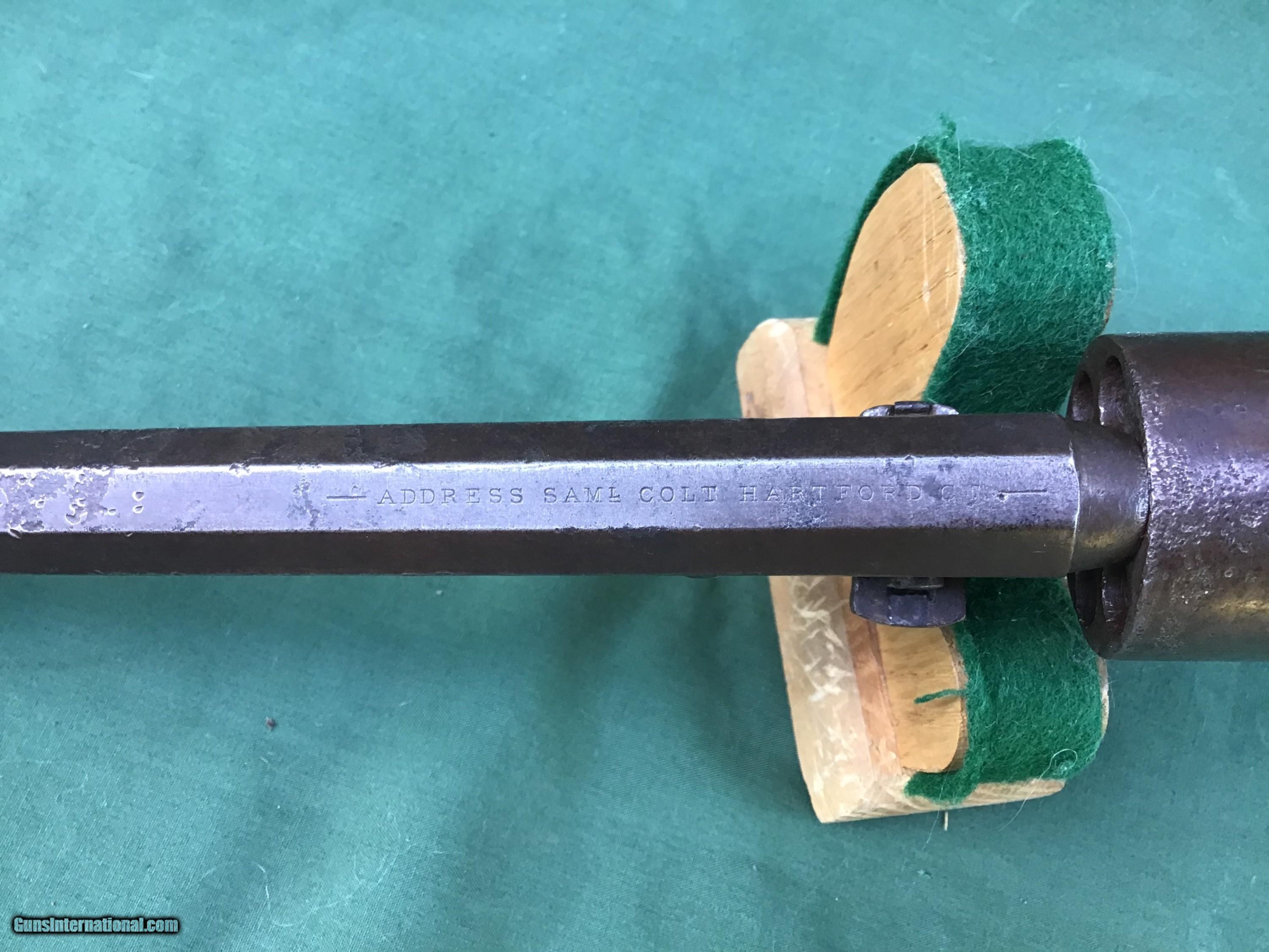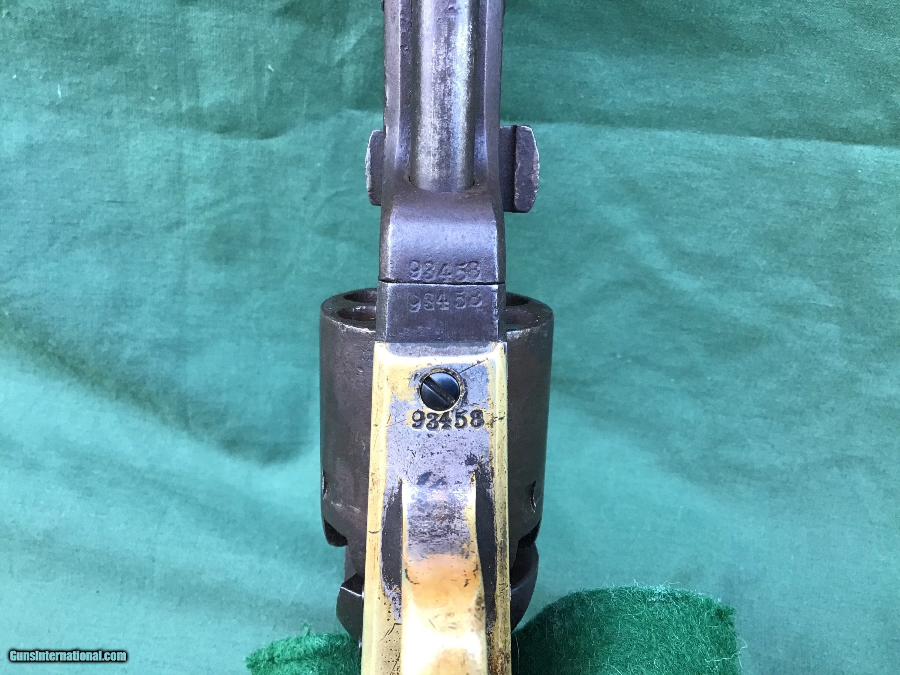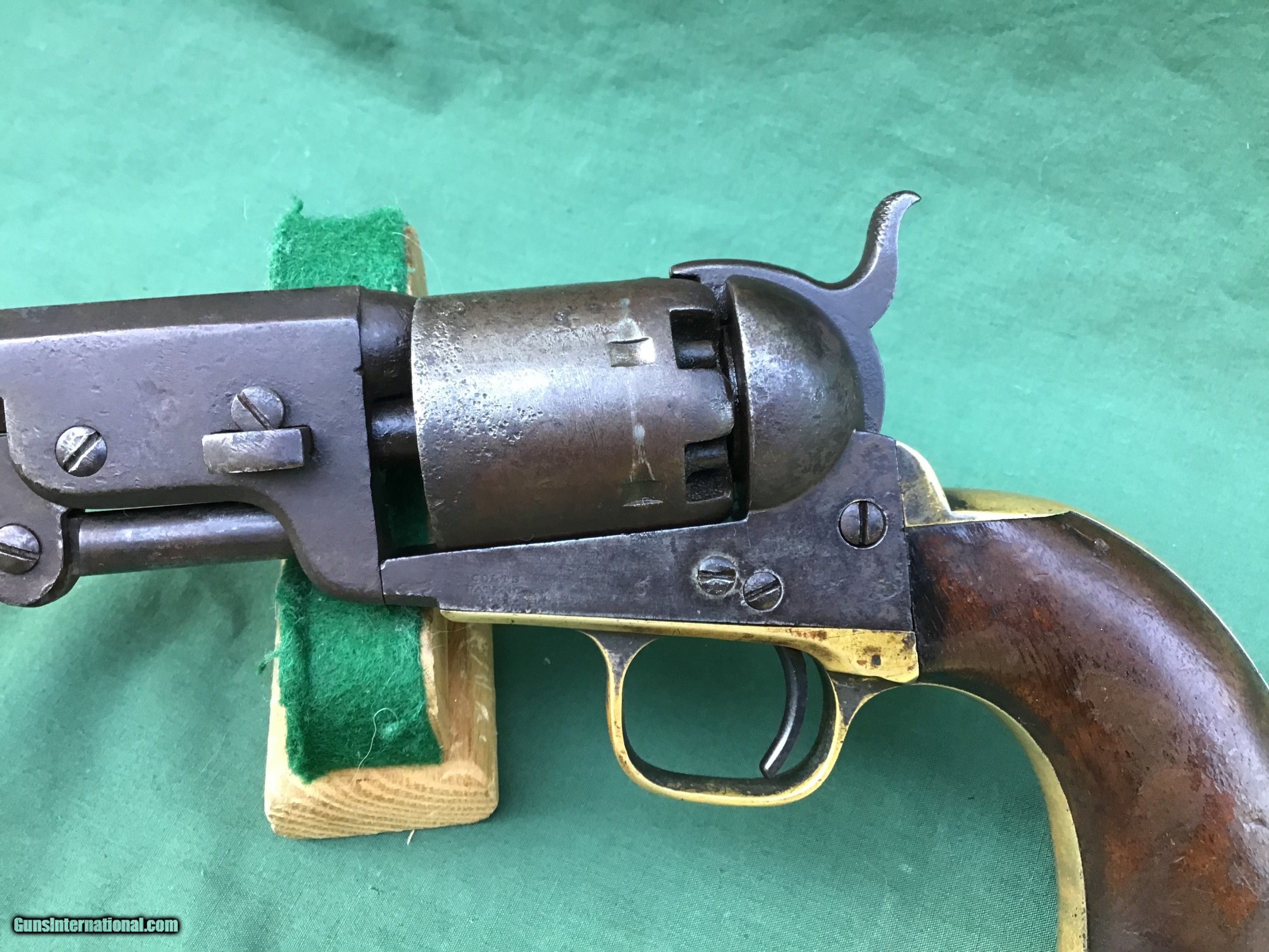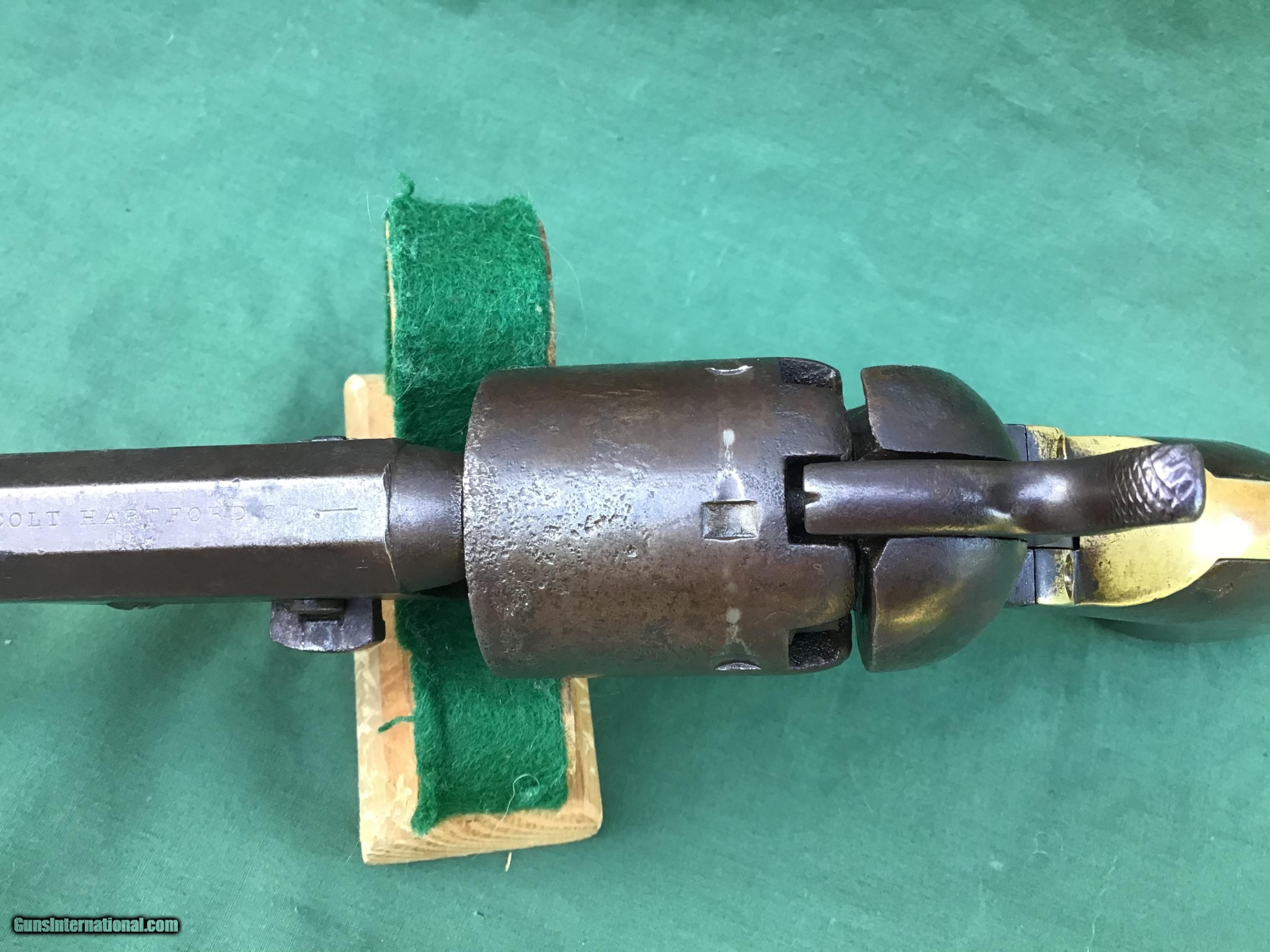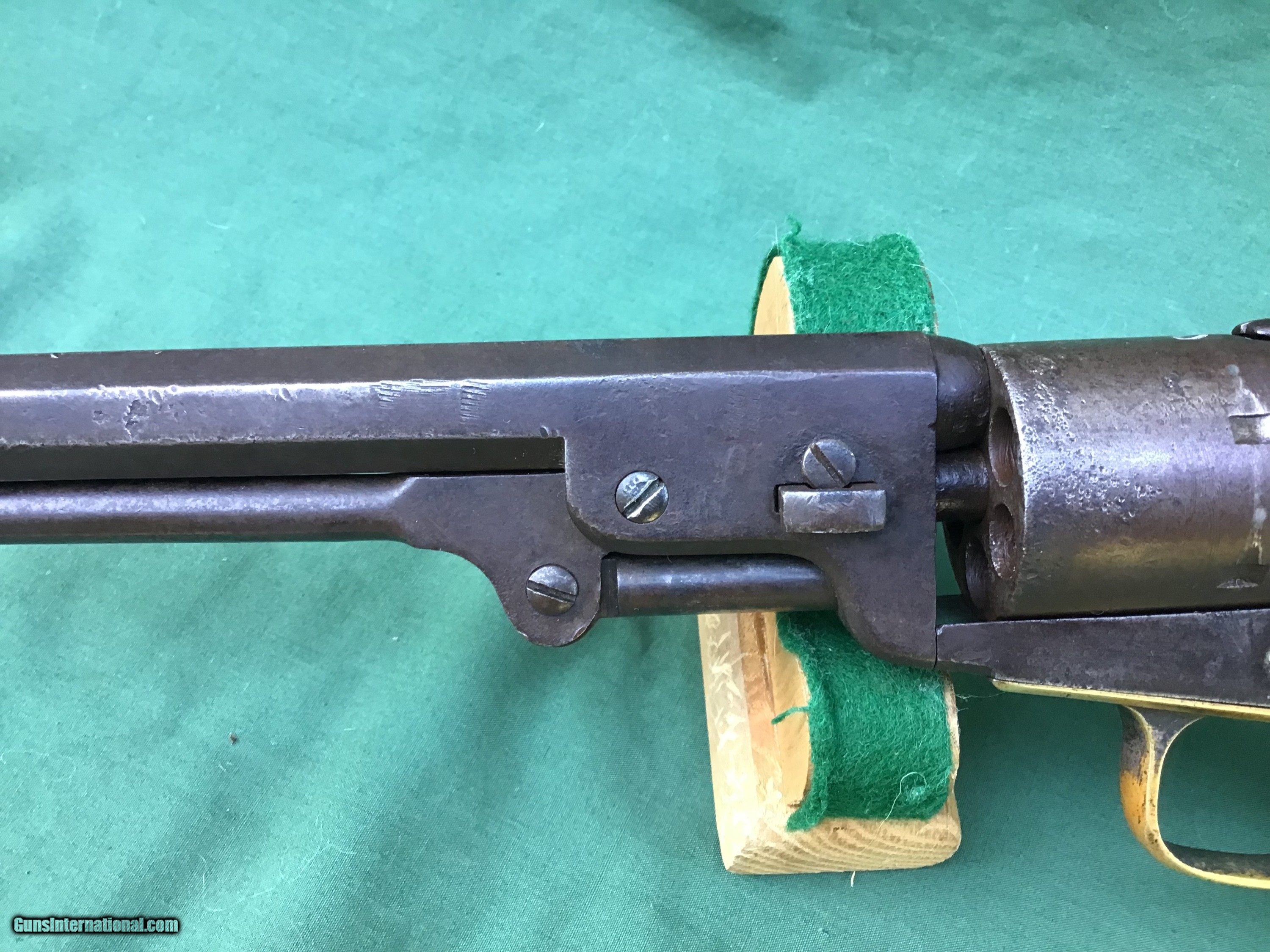 Description: 1851 Colt Navy with Hartford Barrel Address. All matching serial numbers including the wedge. Manufactured in 1860 right before the Civil War. It is believed by the majority of the collecting world that 1851 Navies manufactured in the 90,000 range with Hartford barrel addresses stood a good chance of being sold to the Southern States. This particular piece fits the part having a nice rich even dark brown patina, and heavily used exterior. Action indexes properly and grips are in good condition. 10 maybe 15% of the cylinder scene remains. 7 1/2" barrel with a decent bore. If your looking for 1851 Colt Navy that has a high percentage of being used by the South in Civil War, then here is your chance. Offered at below average price range. Please feel free to ask questions. SOLD Antique: Yes |