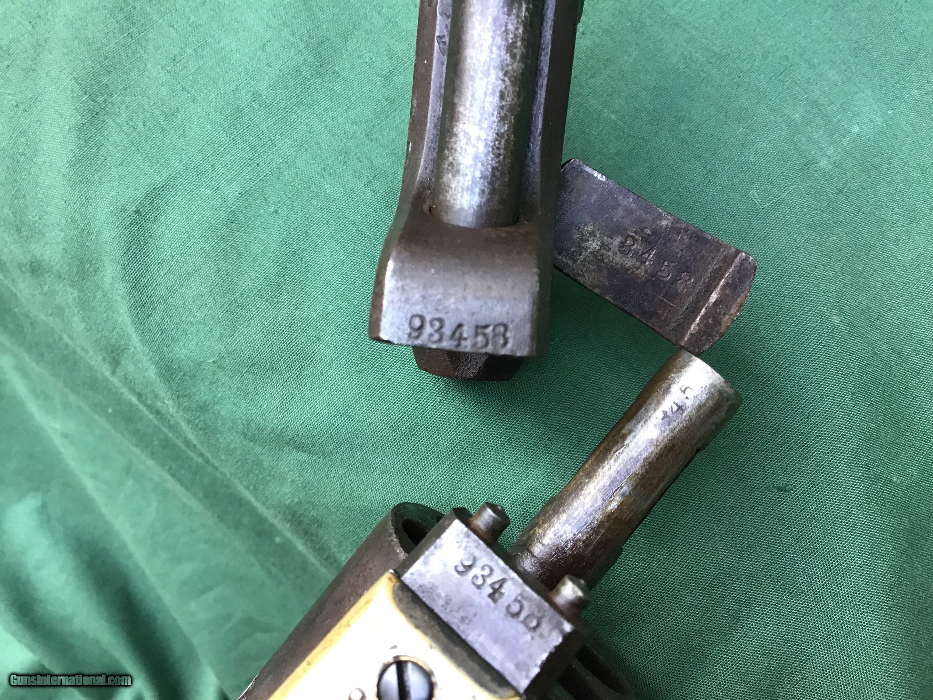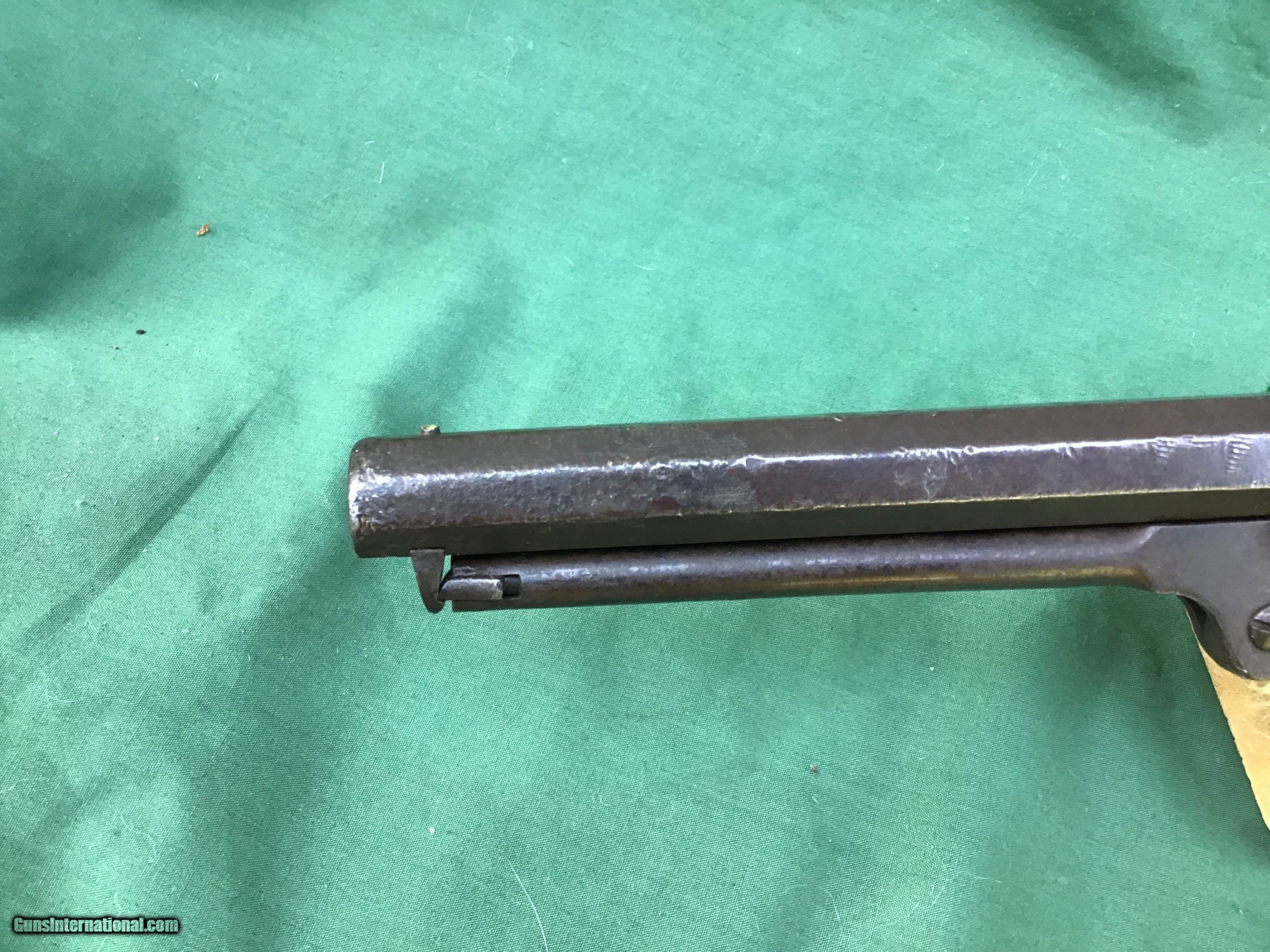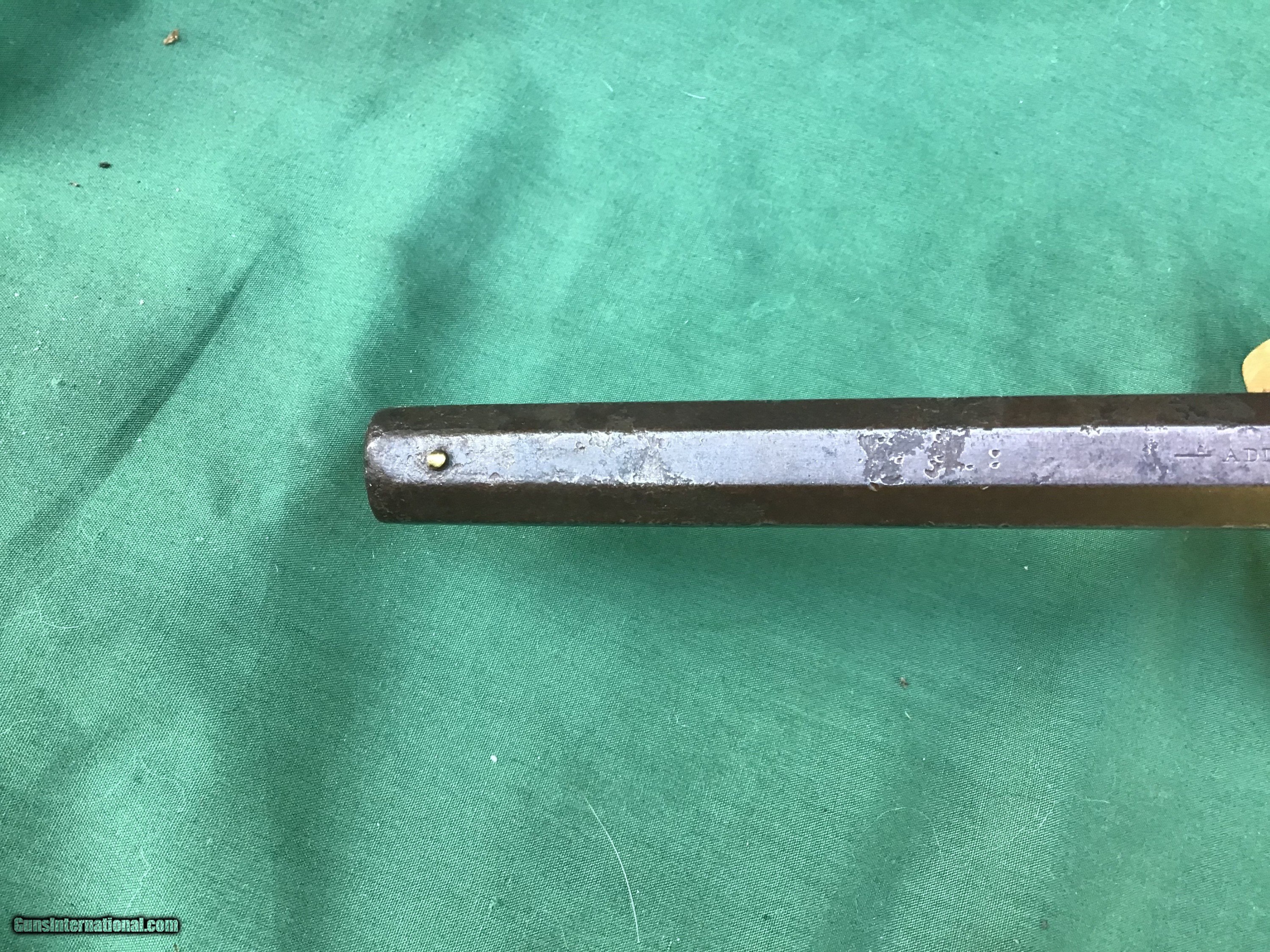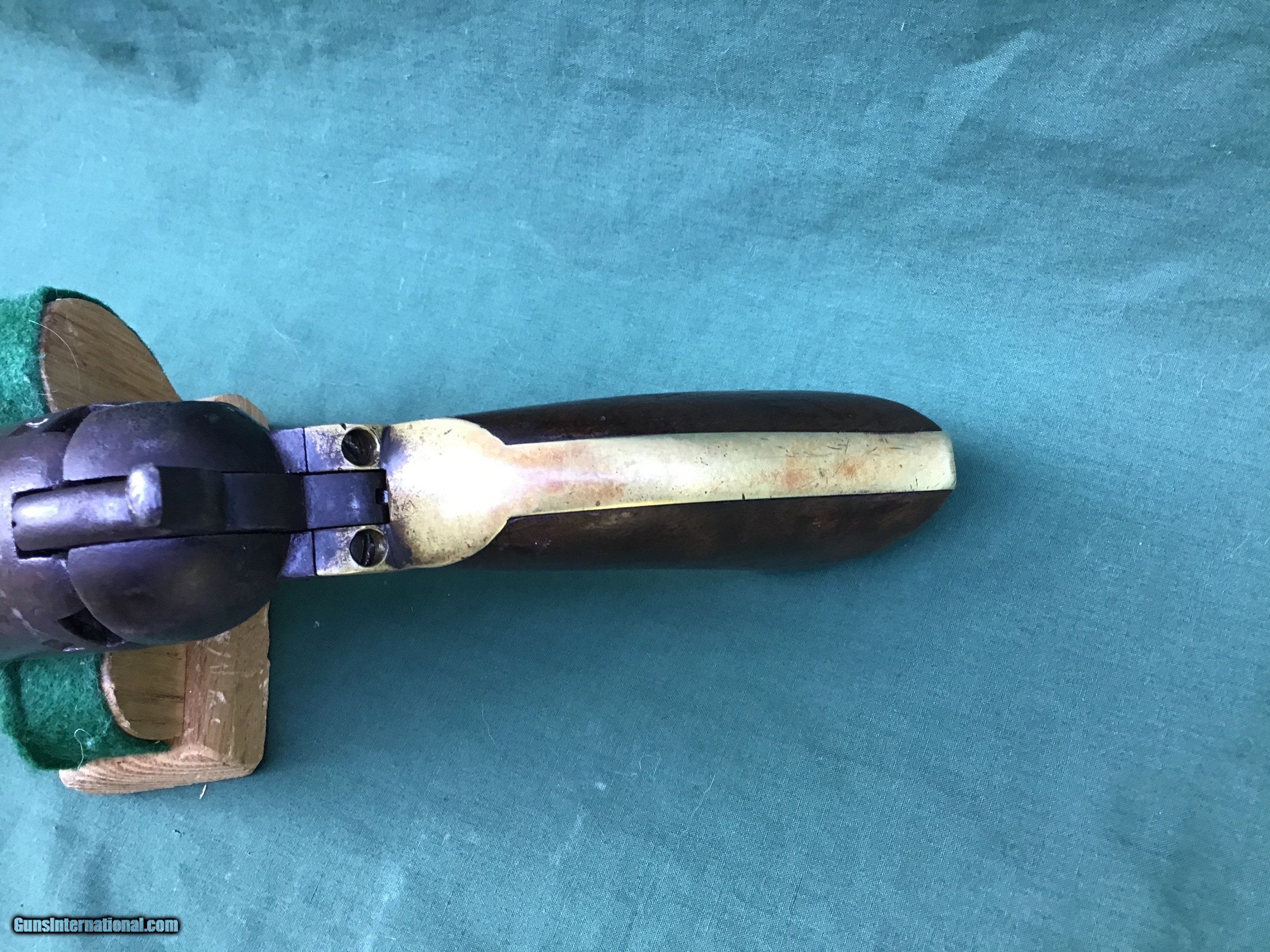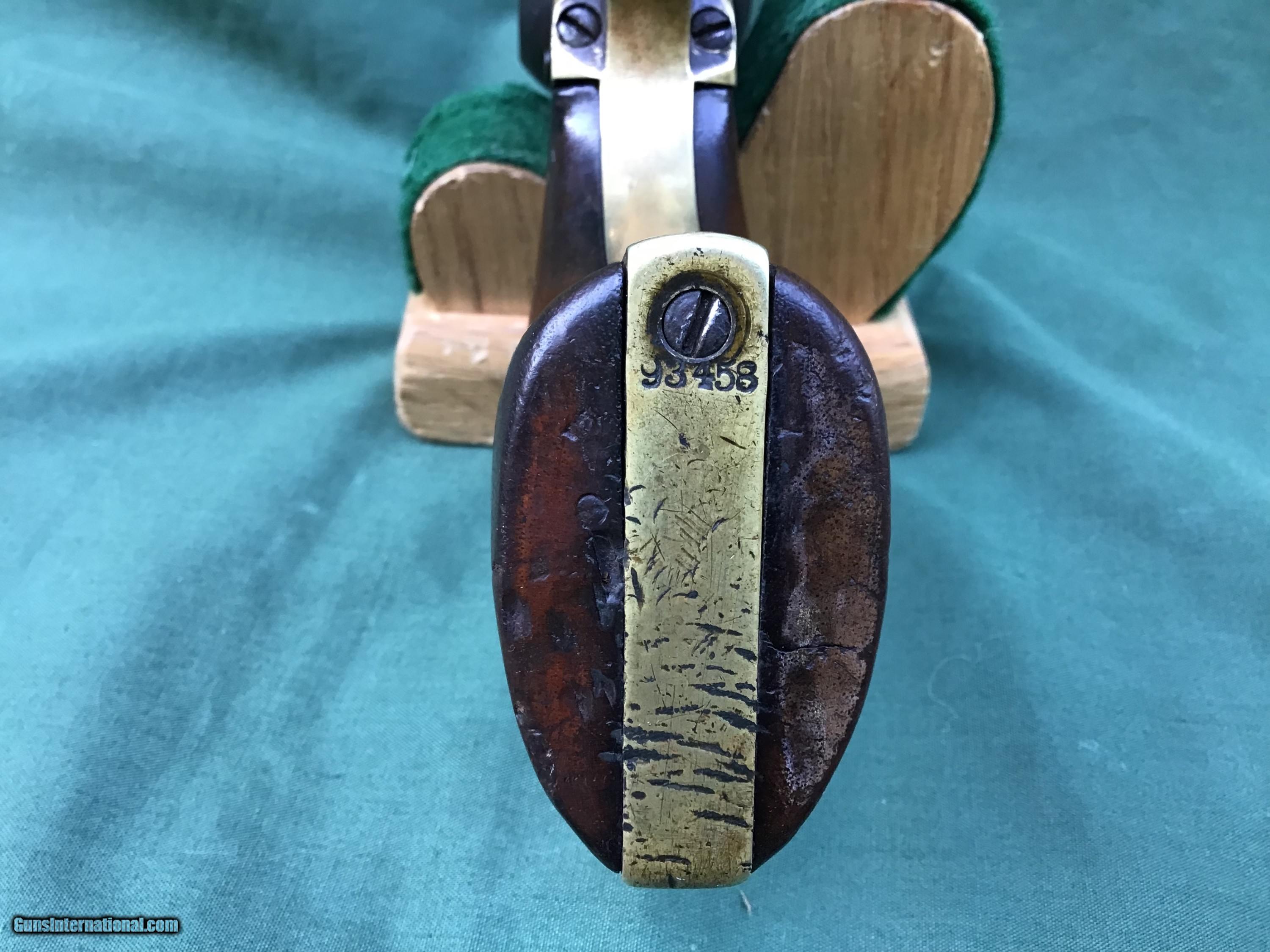 Description: 1851 Colt Navy with Hartford Barrel Address. All matching serial numbers including the wedge. Manufactured in 1860 right before the Civil War. It is believed by the majority of the collecting world that 1851 Navies manufactured in the 90,000 range with Hartford barrel addresses stood a good chance of being sold to the Southern States. This particular piece fits the part having a nice rich even dark brown patina, and heavily used exterior. Action indexes properly and grips are in good condition. 10 maybe 15% of the cylinder scene remains. 7 1/2" barrel with a decent bore. If your looking for 1851 Colt Navy that has a high percentage of being used by the South in Civil War, then here is your chance. Offered at below average price range. Please feel free to ask questions. SOLD Antique: Yes |