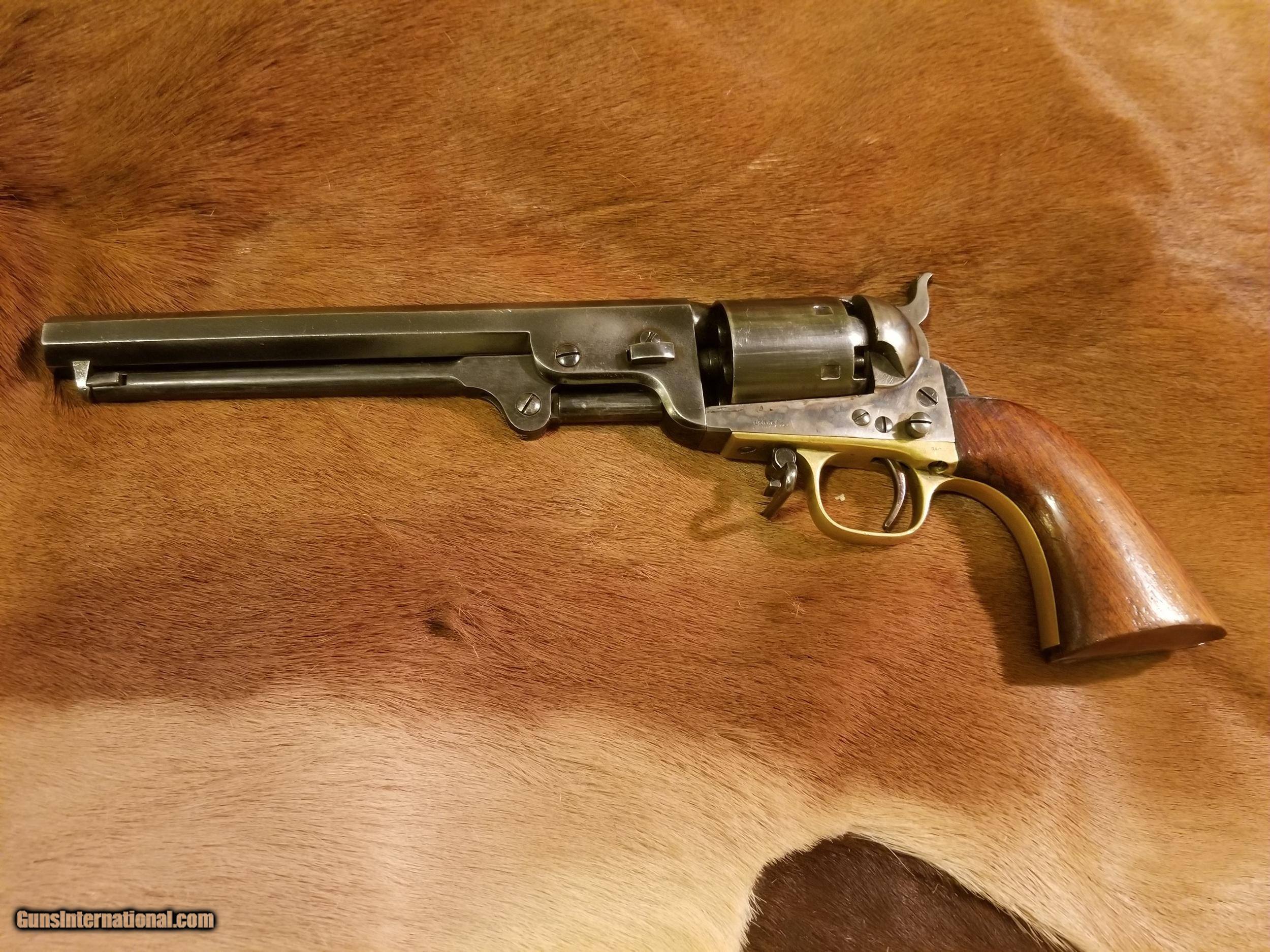 Description: The quality that is retained on this Navy is remarkable for its age. Frame and Barrel numbers are matching, Strap, Loading lever & Cylinder are non matching. Hammer spring and trigger are crisp with no noticable wear. Barrel retains 50% of its origonal rifleing and 40% if the origonal blued finish throughout. Patent markings are 70% with only 20% of engraving remaining on Cylinder. Noticable slight crack under cylinder above brass trigger guard. SOLD Manufacturer: Colt Model: 1851 Navy Serial Number: 22997 Caliber Info: 36 Bore: 4 lands Chambers: 6 Condition: good Metal Condition: good Wood Condition: excellent Bore Condition: 50% Barrel Type: octogon Action: single Triggers: 4 lb Finish: 30% Blu Weight: 2.5 Sights: brass Manufacture Date: 1860 Item Location: CT |