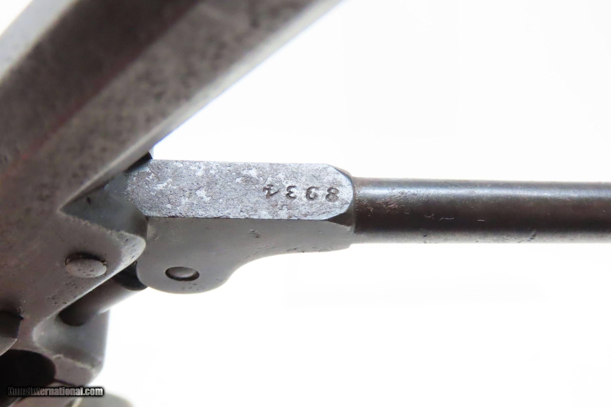 Description: 1854 mfr. ANTEBELLUM Antique COLT Model 1849 POCKET .31 Caliber Revolver Cased with Accessories Here we present an antique percussion Colt Model 1849 Pocket Revolver, made in 1854 in Hartford, Connecticut. The Model 1849 Pocket, the replacement for the Baby Dragoon, was the most widely produced of any Colt percussion pistol. Nearly 340,000 were manufactured during its 23-year production run that ended in 1873. Over 280,000 of these were produced by Colt’s factory at Hartford by the end of the American Civil War in 1865. These were very popular and saw a lot of use on the battlefield, on the home front and in the West. These were some of the smallest, handiest pocket revolvers of the time. One of the most aesthetically pleasing aspects of the 1849 Pocket is its cylinder scene. Cylinder scenes during this period were common, especially for Colt, not only for their visual appeal, but because it made a revolver more difficult to forge. The scene on the 1849 Pocket is that of a stagecoach robbery. The focal point is the stagecoach drawn by four horses. A woman in a dress is seen framed in the doorway of the side of the coach. The driver is standing alongside wielding his pistol against multiple assailants as the horses rear and struggle against their harnesses. Several of the bandits lay dying on the ground, one tries to control the horses, two are running away and one is in the process of falling dead after being shot. Not a bad way to show interested buyers what a pistol like this would be good for. It did a fine job as a self-defense handgun for the average citizen in 19th Century America. The overall condition is good. Original patina/finish. Strong action. The bore is in good shape and remains clear. Numbers match (wedge is not numbered). The cylinder scene is intact. Good grip, contains an average amount of wear/use. Legible markings. The included case contains a powder flask, hammer, combination tool, cap tin, and two bullet molds. Own the original! This is a legitimate antique and not a reproduction. Barrel is 5 inches. Caliber: .31 Percussion Overall condition as seen in photos. Very Fast. Very Safe. FREE SHIPPING WORLDWIDE. Delivered directly to your door by express mail! Guaranteed AUTHENTIC & Includes CERTIFICATE OF AUTHENTICITY. ancestryguns $1945 #217408 SOLD Antique: Yes |