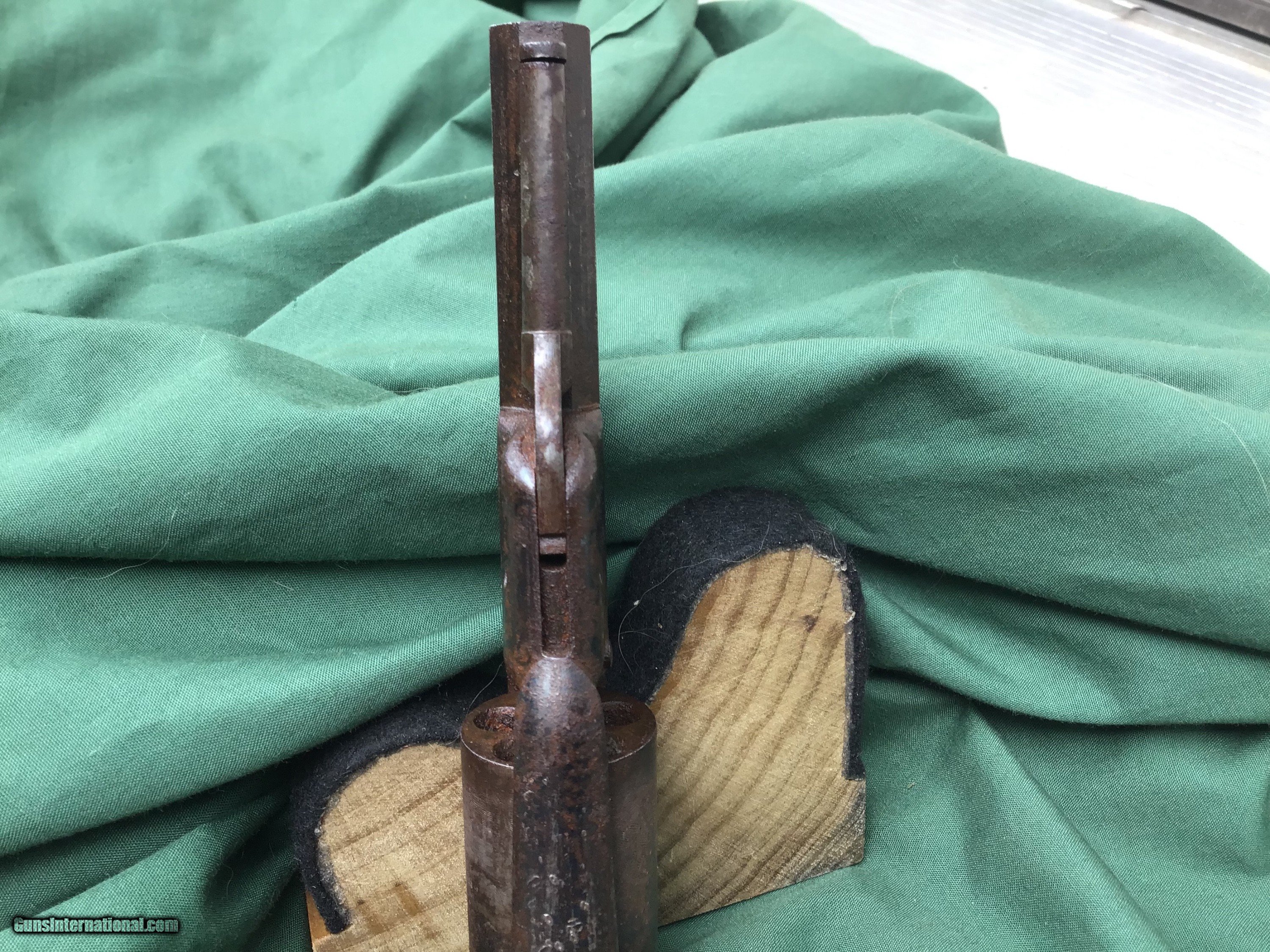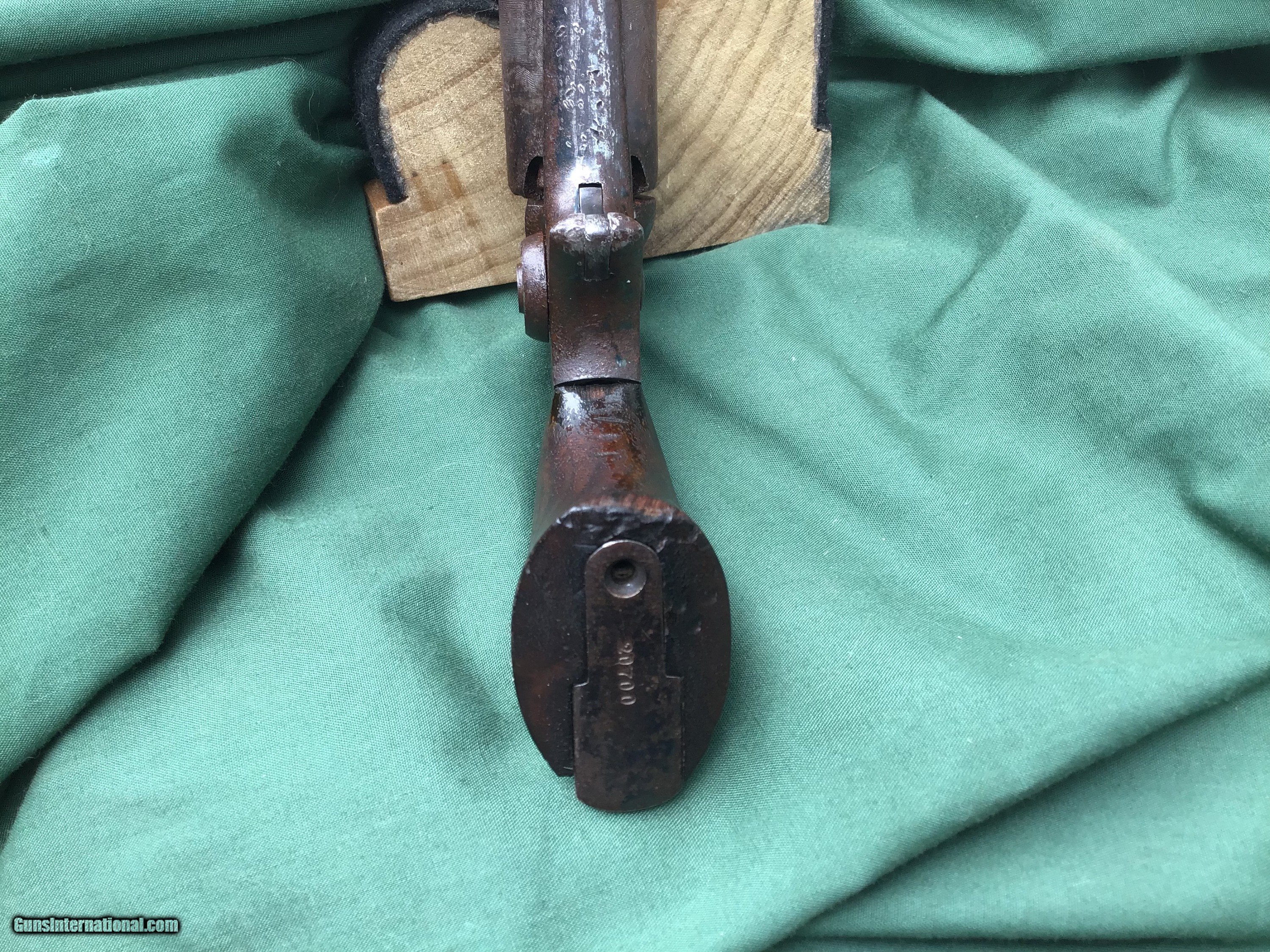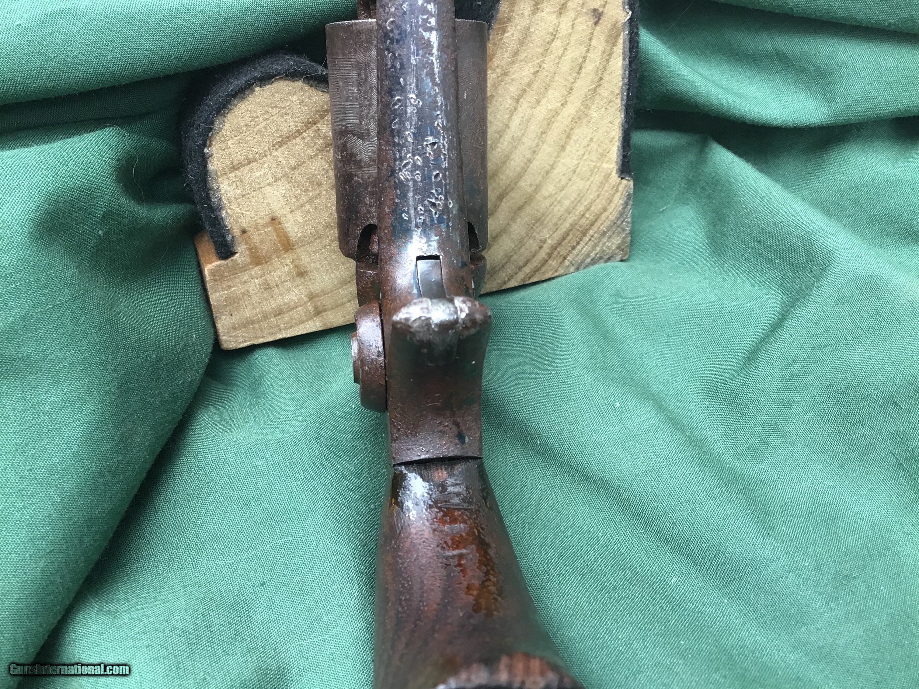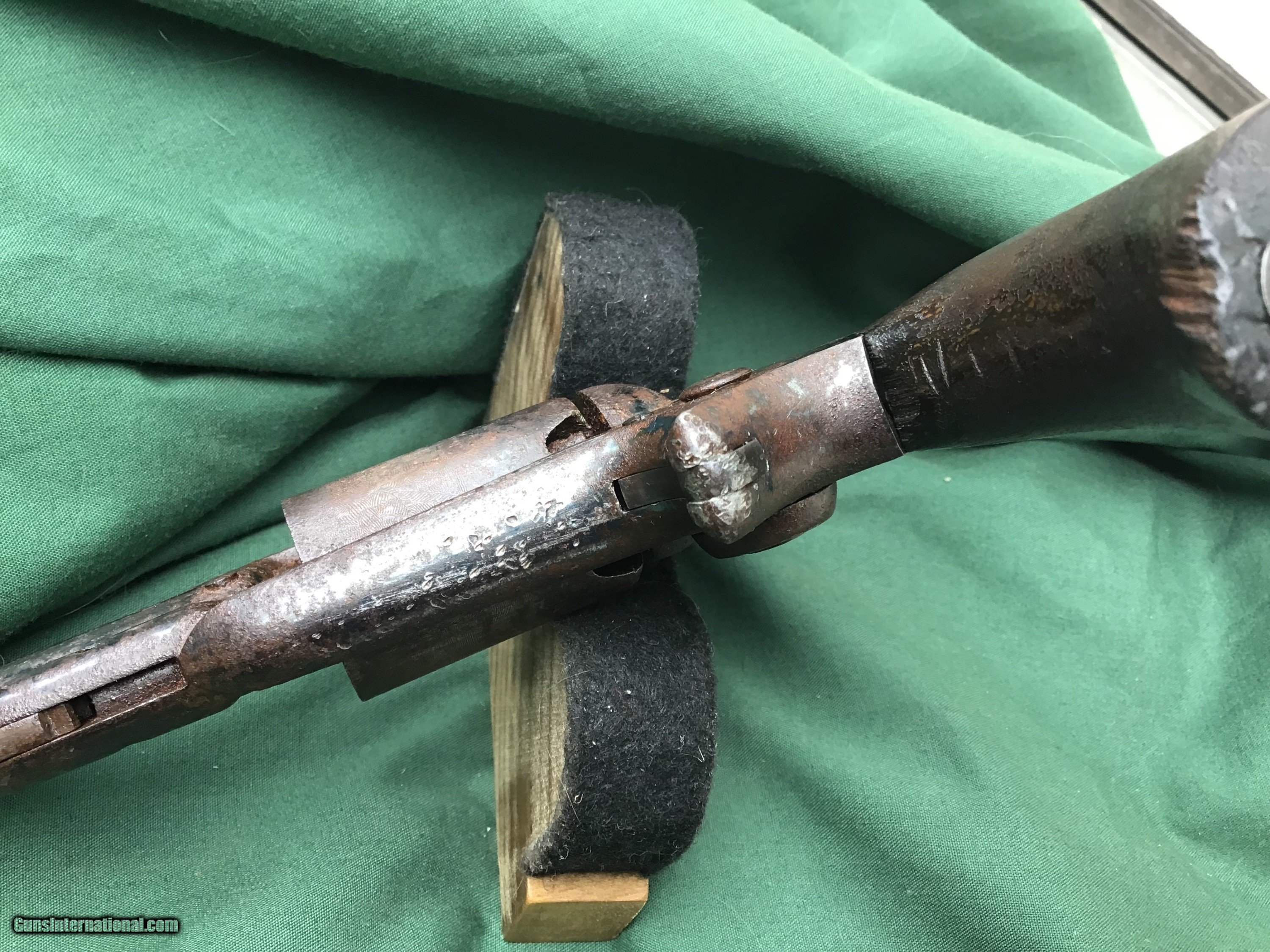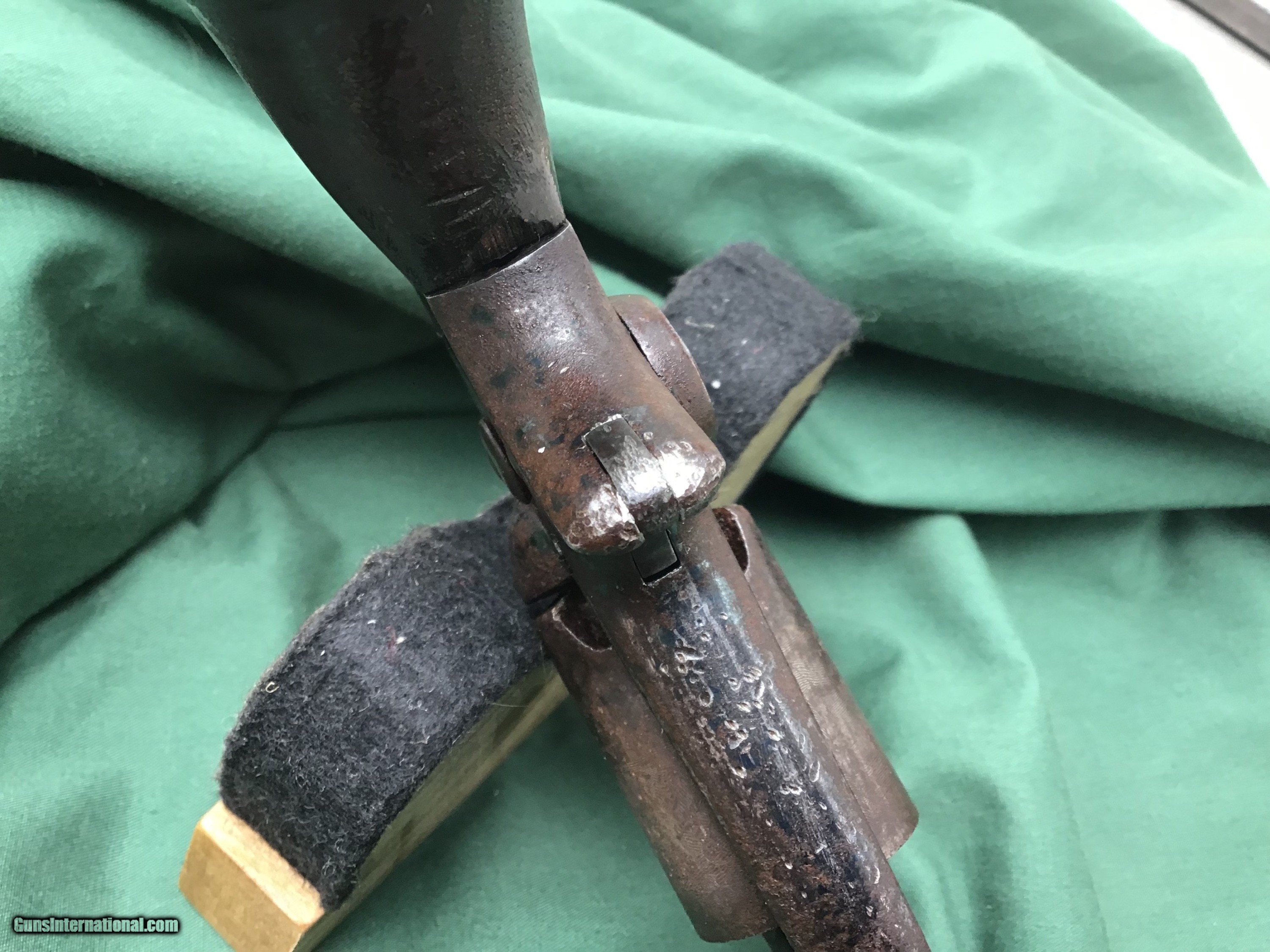 Description: 1855 Colt Root 2nd Model. .28 caliber and has Hartford barrel address. Serial number 20,700, all matching. This Colt is a little rough but very restorable or use it for parts. Missing three screws: on barrel (left hand side), hammer, and butt. Action indexes properly but trigger won’t engage because is stuck. It looks like it might be pinched on both sides thus not being able to move properly. Again action indexes nicely. Grips are matching and are in decent shape. Octagon barrel measures 3 1/2”. Please feel free to ask questions or for more detailed pictures. Antique and can shipped directly to your doorsteps. SOLD Antique: Yes |