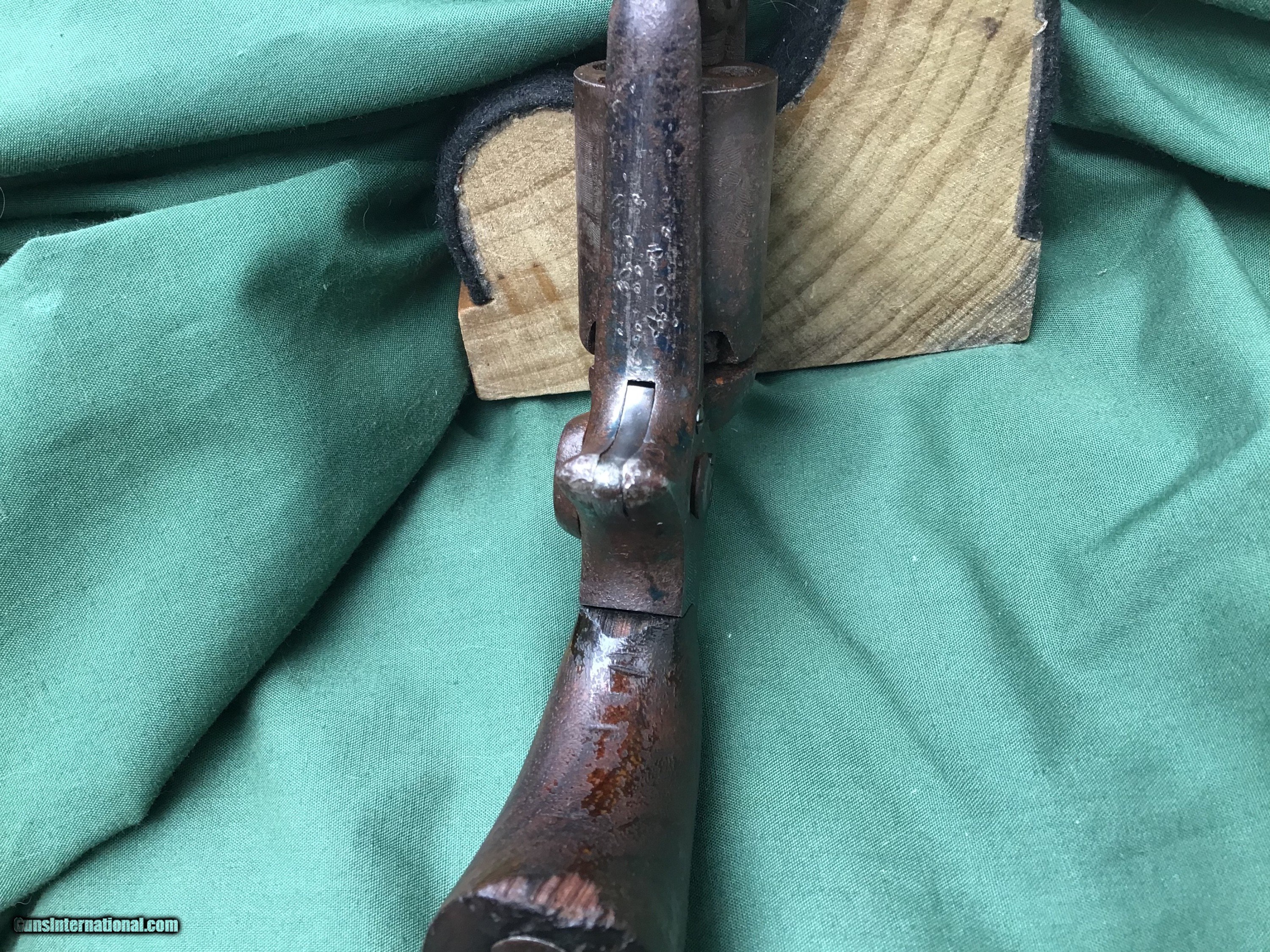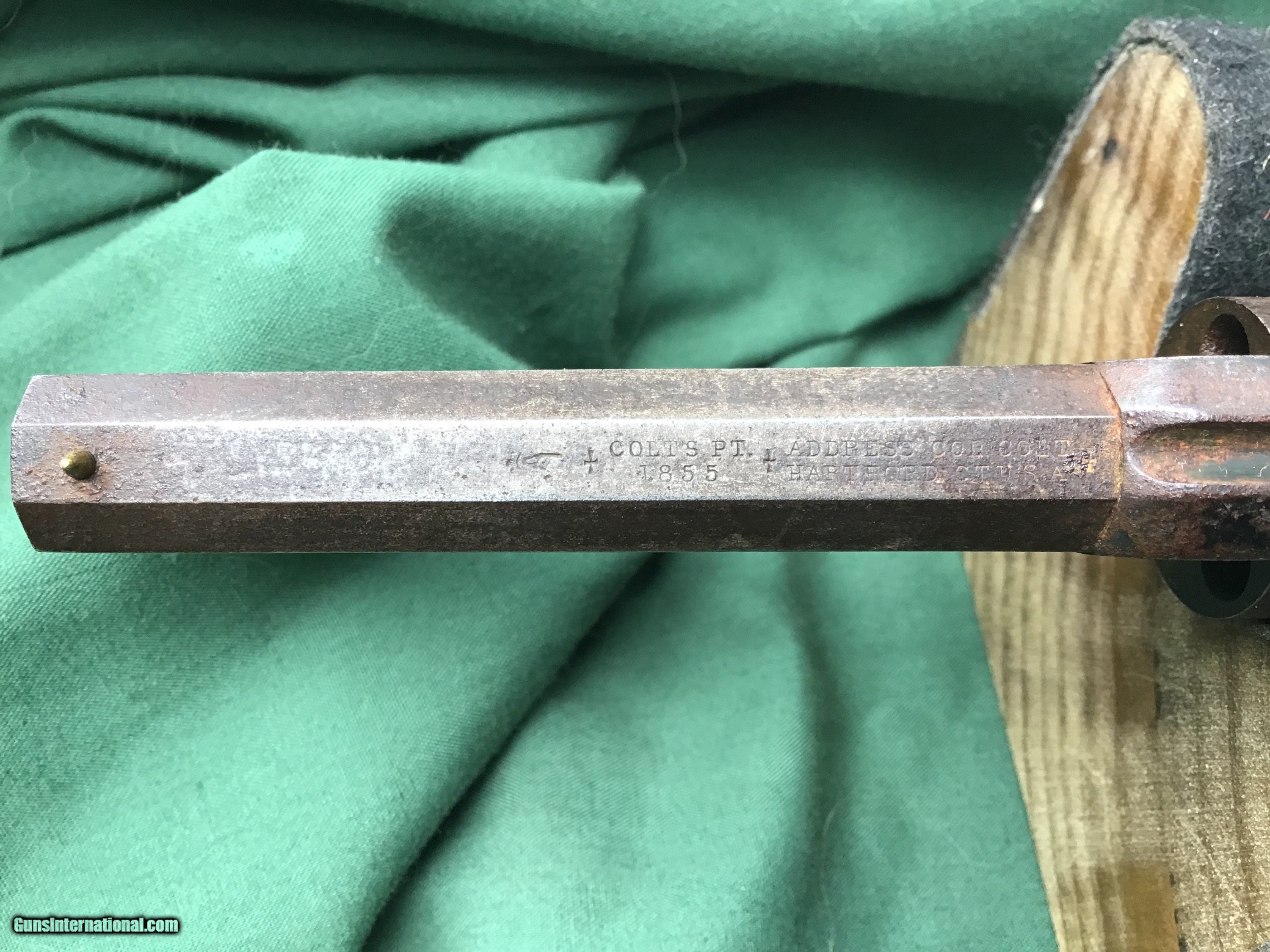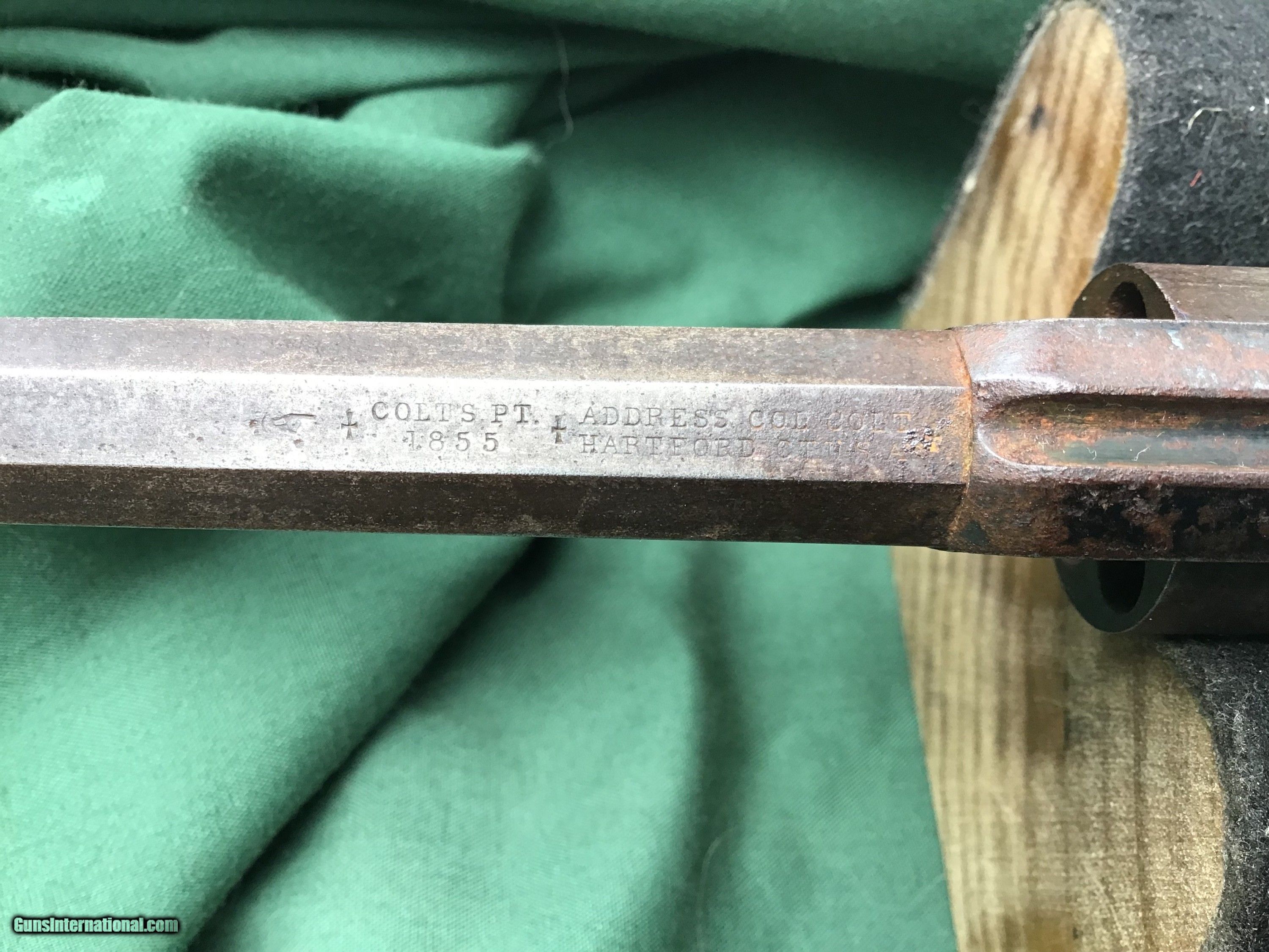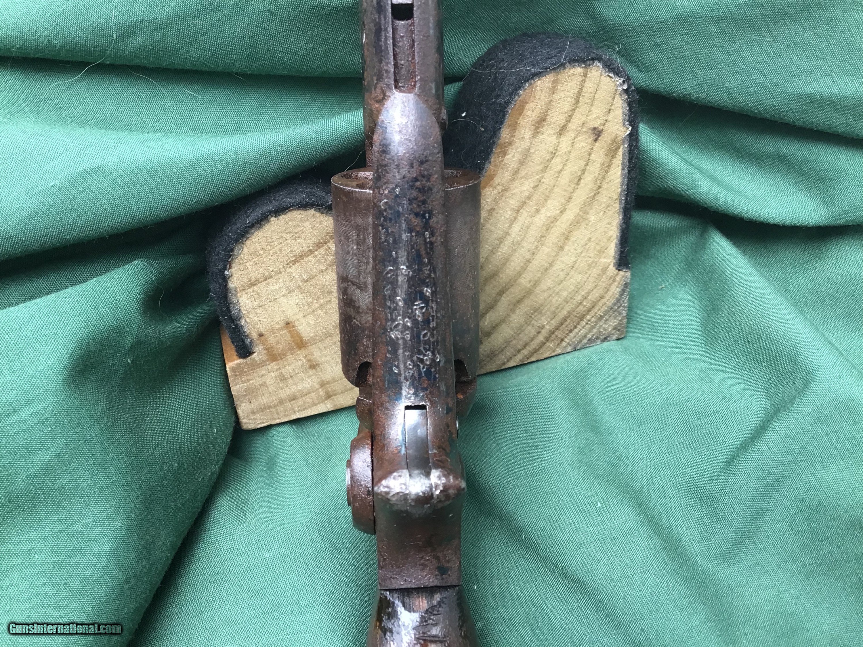 Description: 1855 Colt Root 2nd Model. .28 caliber and has Hartford barrel address. Serial number 20,700, all matching. This Colt is a little rough but very restorable or use it for parts. Missing three screws: on barrel (left hand side), hammer, and butt. Action indexes properly but trigger won’t engage because is stuck. It looks like it might be pinched on both sides thus not being able to move properly. Again action indexes nicely. Grips are matching and are in decent shape. Octagon barrel measures 3 1/2”. Please feel free to ask questions or for more detailed pictures. Antique and can shipped directly to your doorsteps. SOLD Antique: Yes |