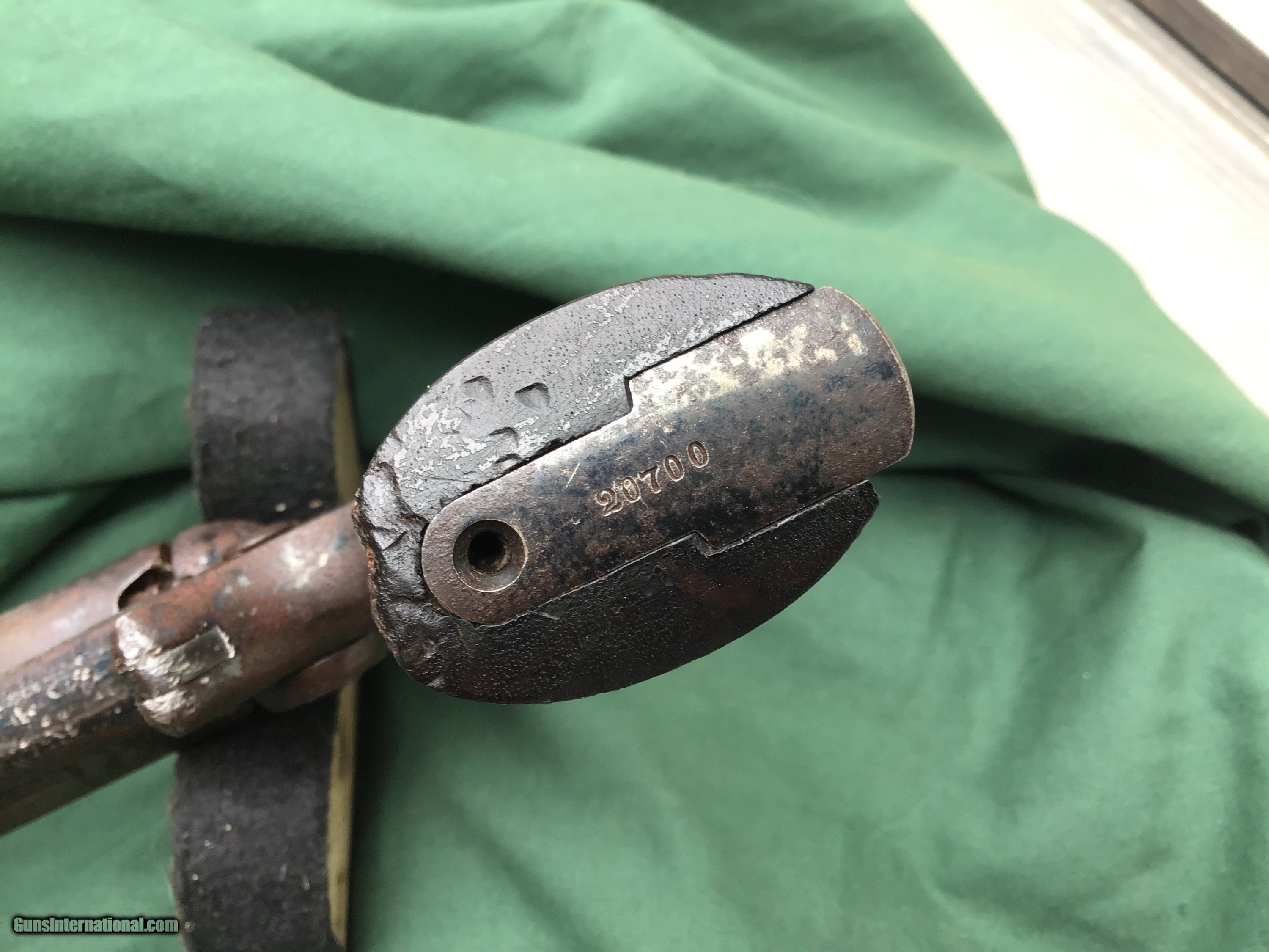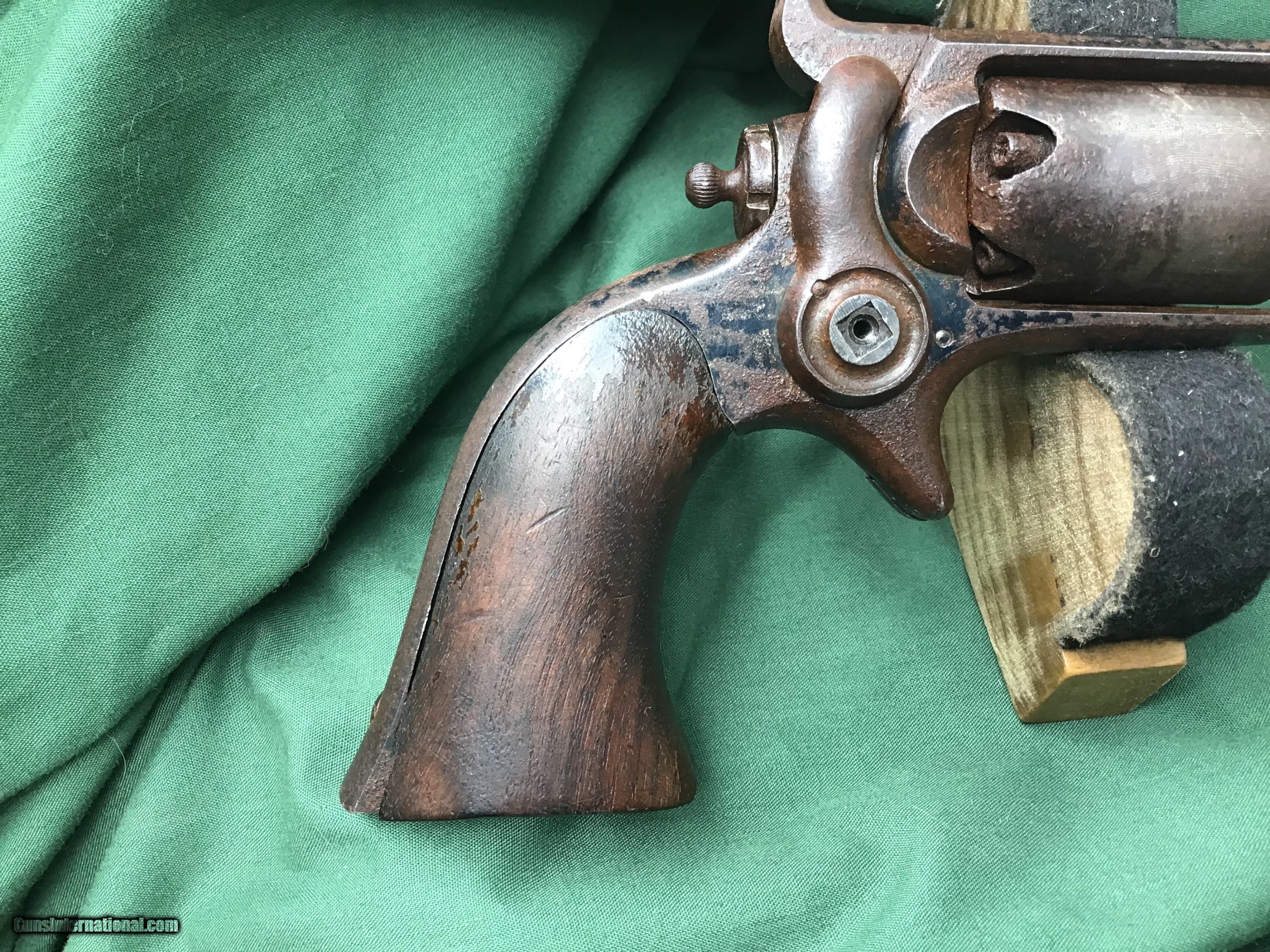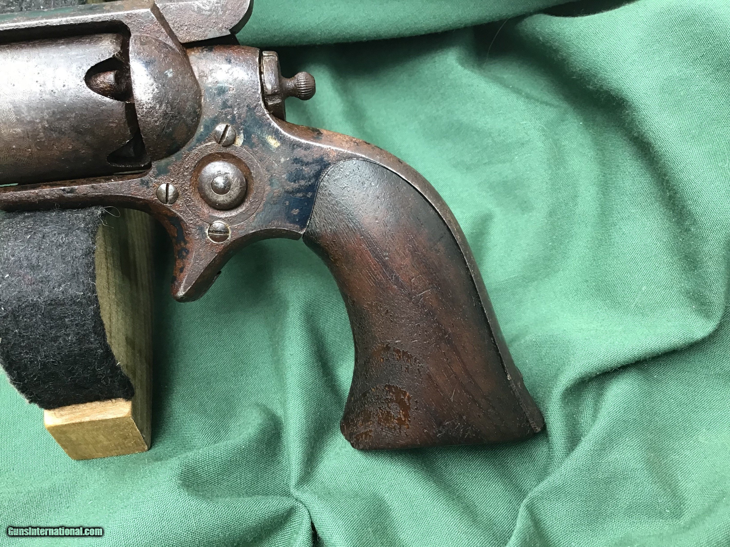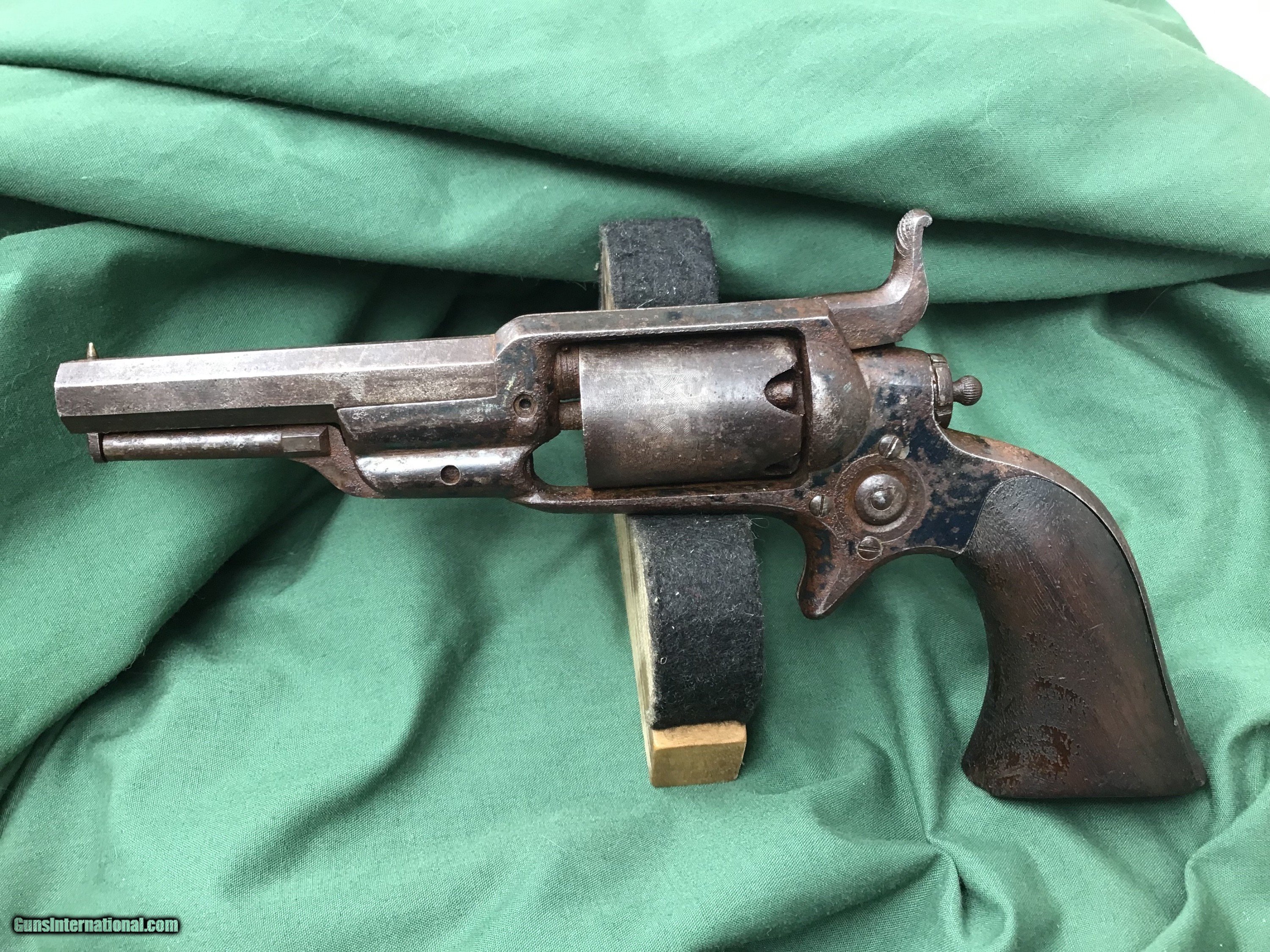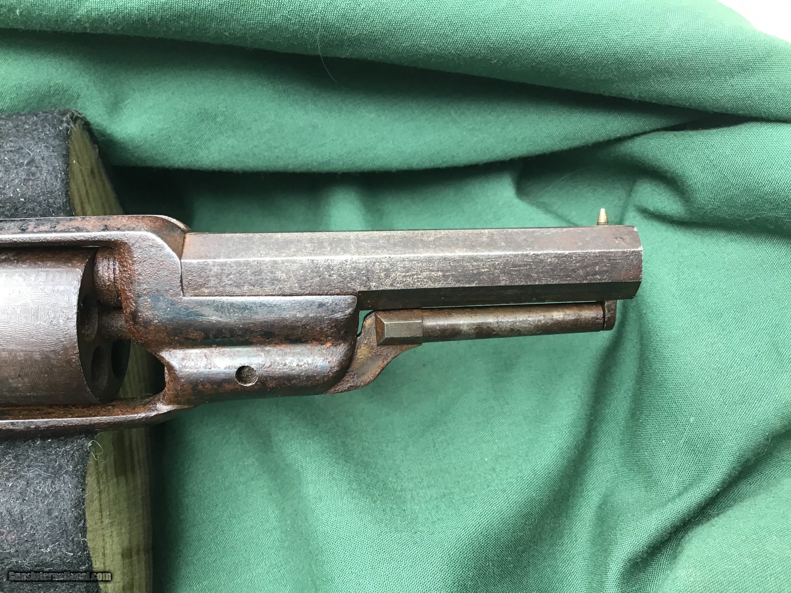 Description: 1855 Colt Root 2nd Model. .28 caliber and has Hartford barrel address. Serial number 20,700, all matching. This Colt is a little rough but very restorable or use it for parts. Missing three screws: on barrel (left hand side), hammer, and butt. Action indexes properly but trigger won’t engage because is stuck. It looks like it might be pinched on both sides thus not being able to move properly. Again action indexes nicely. Grips are matching and are in decent shape. Octagon barrel measures 3 1/2”. Please feel free to ask questions or for more detailed pictures. Antique and can shipped directly to your doorsteps. SOLD Antique: Yes |