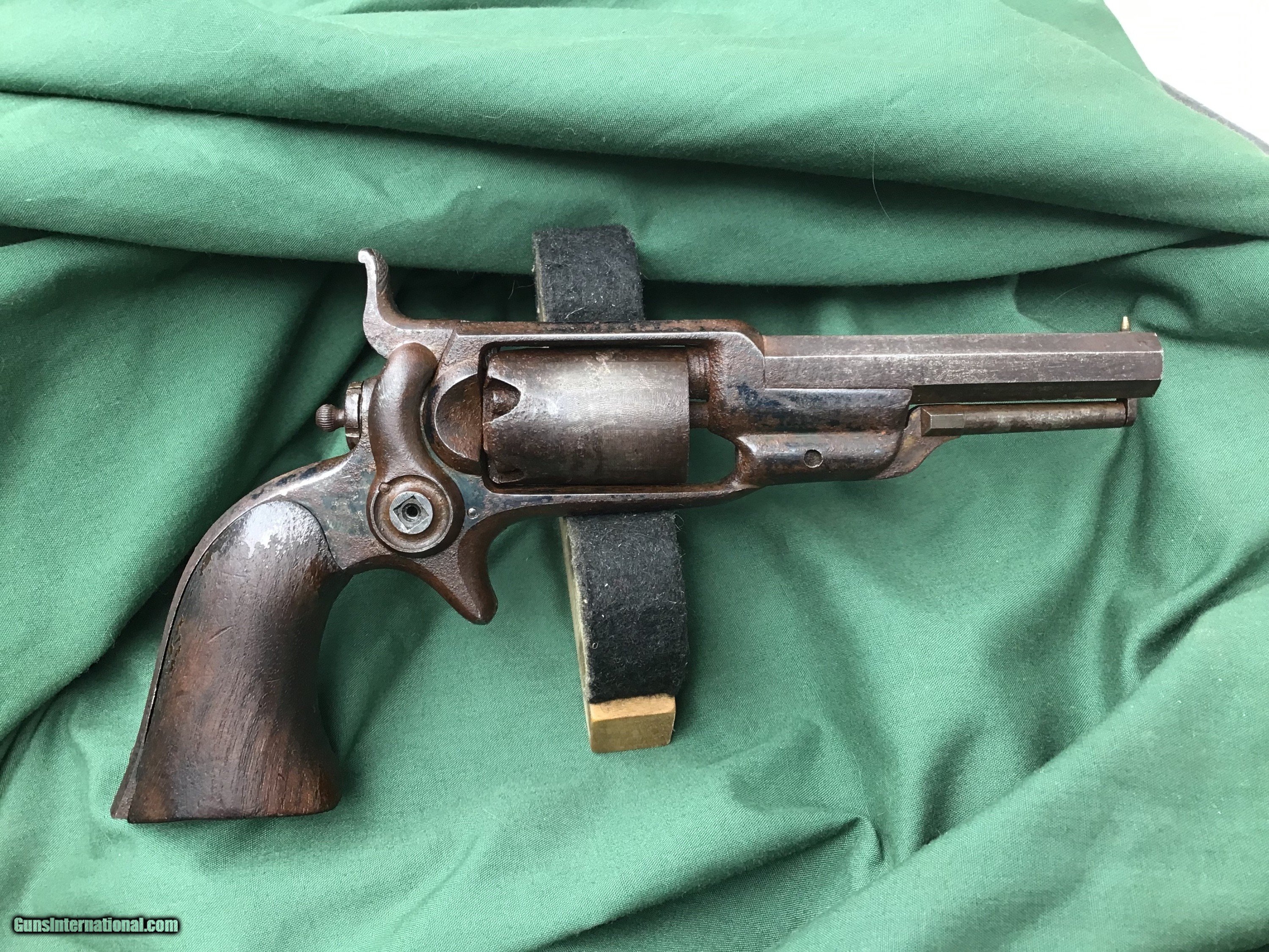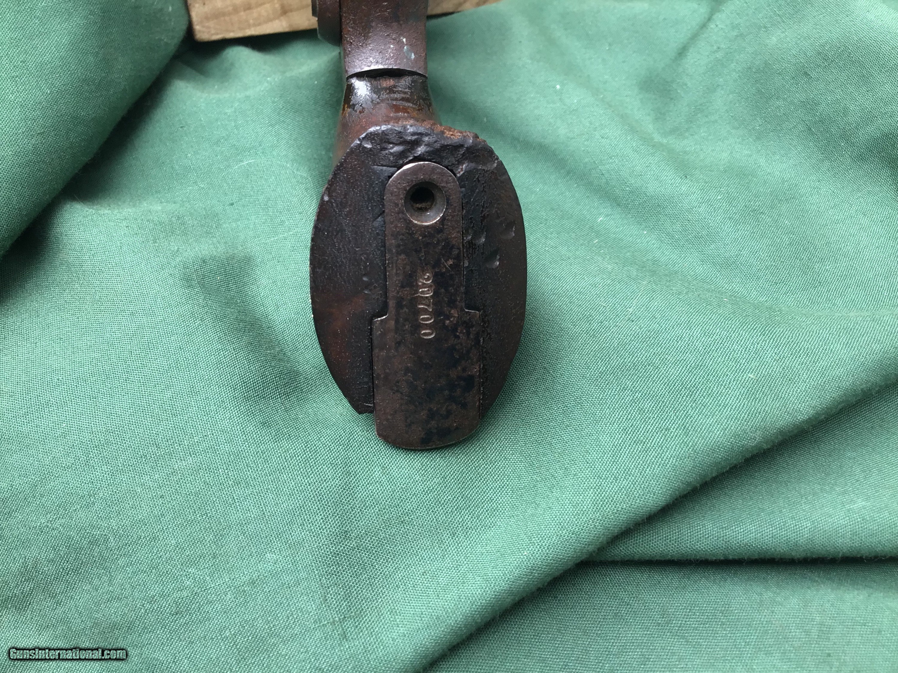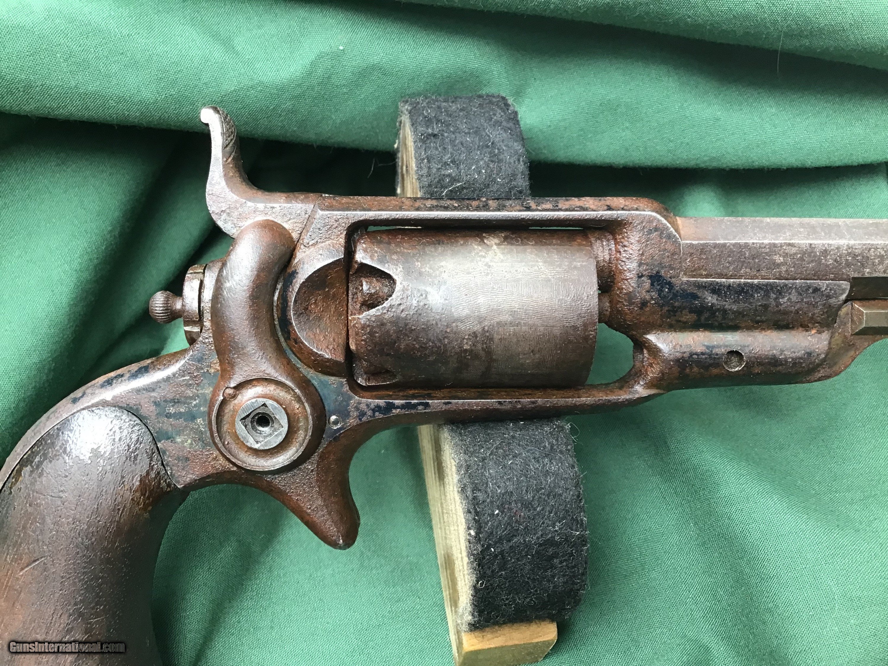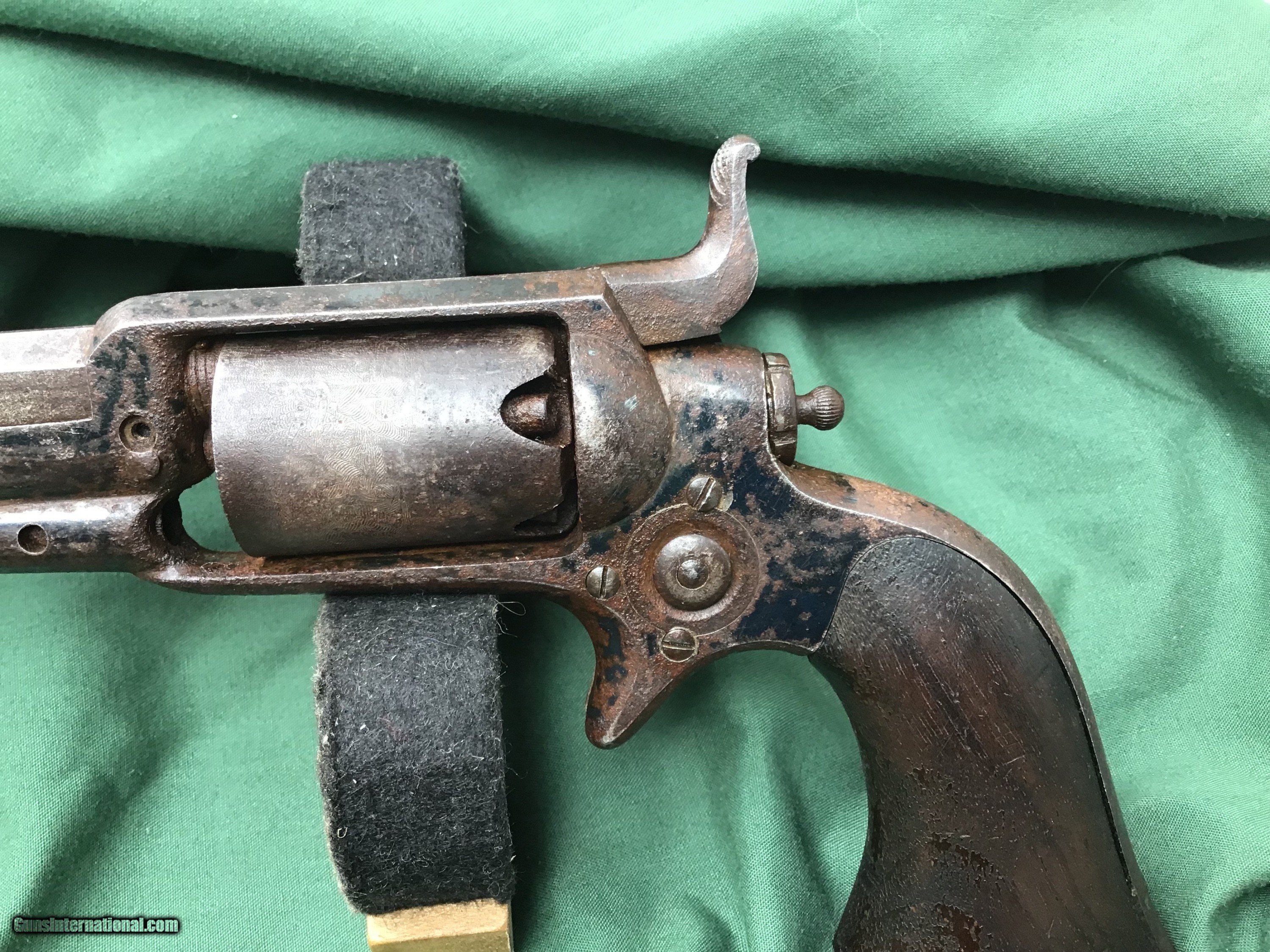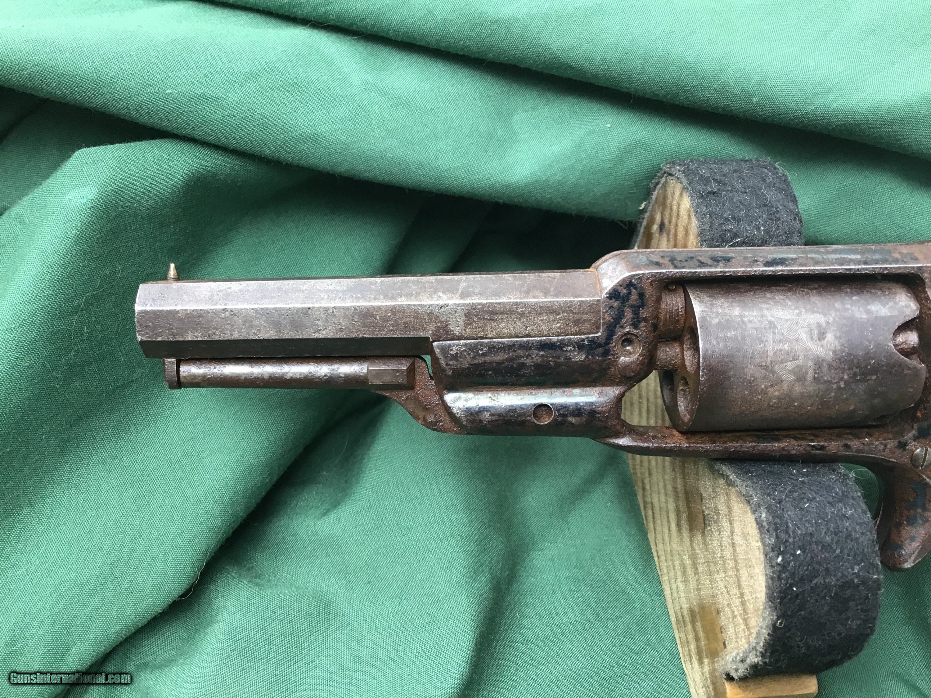 Description: 1855 Colt Root 2nd Model. .28 caliber and has Hartford barrel address. Serial number 20,700, all matching. This Colt is a little rough but very restorable or use it for parts. Missing three screws: on barrel (left hand side), hammer, and butt. Action indexes properly but trigger won’t engage because is stuck. It looks like it might be pinched on both sides thus not being able to move properly. Again action indexes nicely. Grips are matching and are in decent shape. Octagon barrel measures 3 1/2”. Please feel free to ask questions or for more detailed pictures. Antique and can shipped directly to your doorsteps. SOLD Antique: Yes |