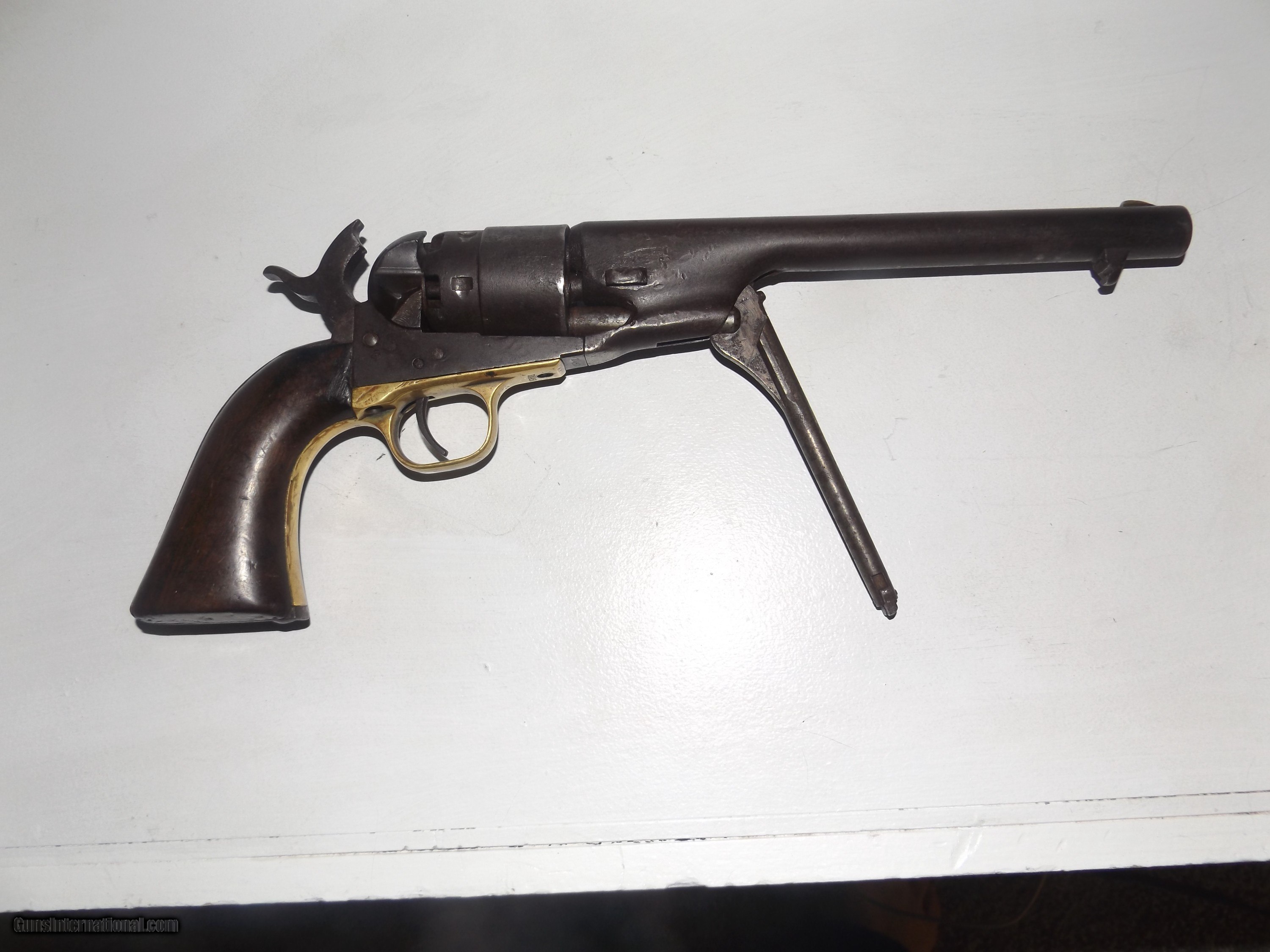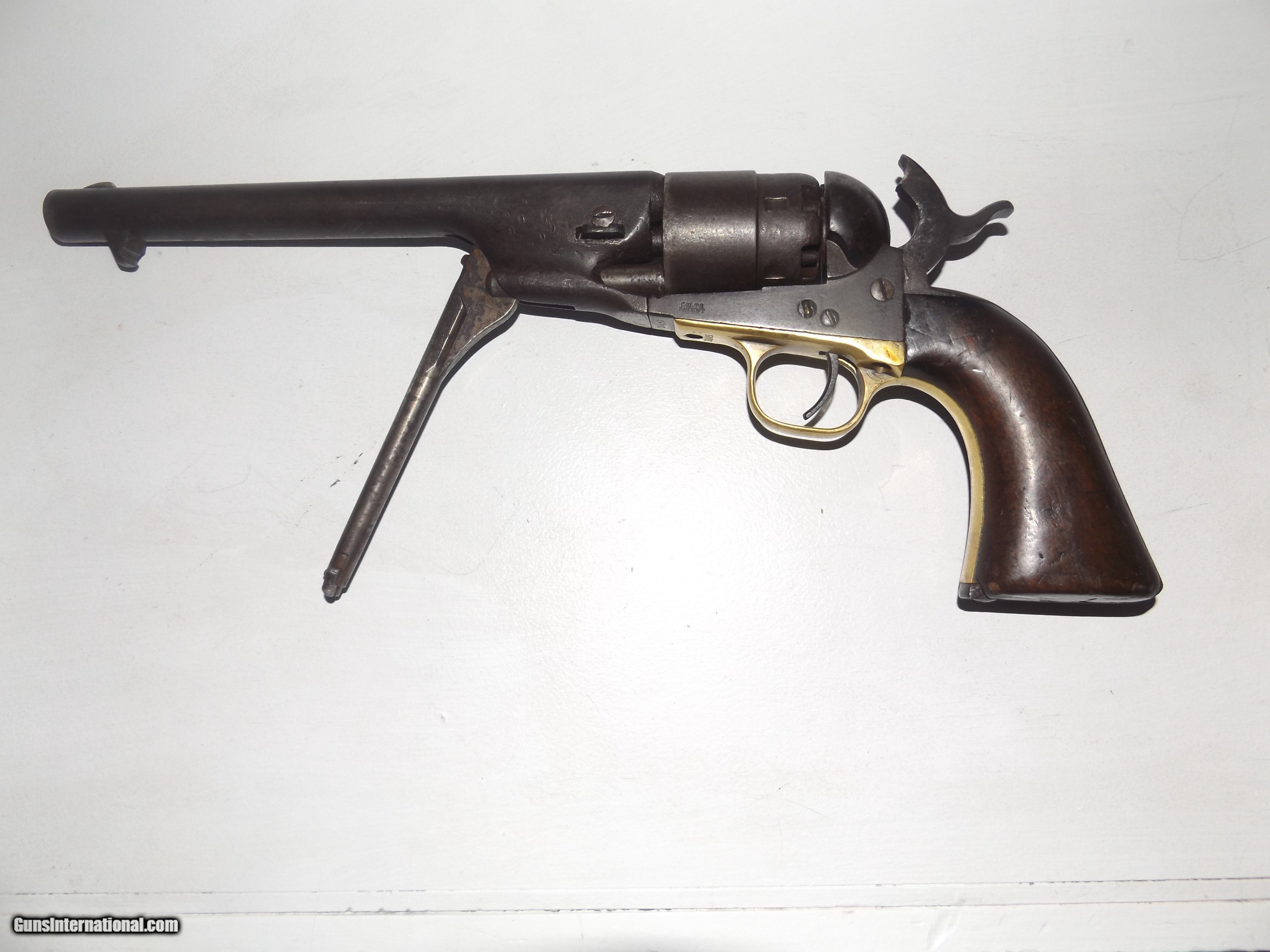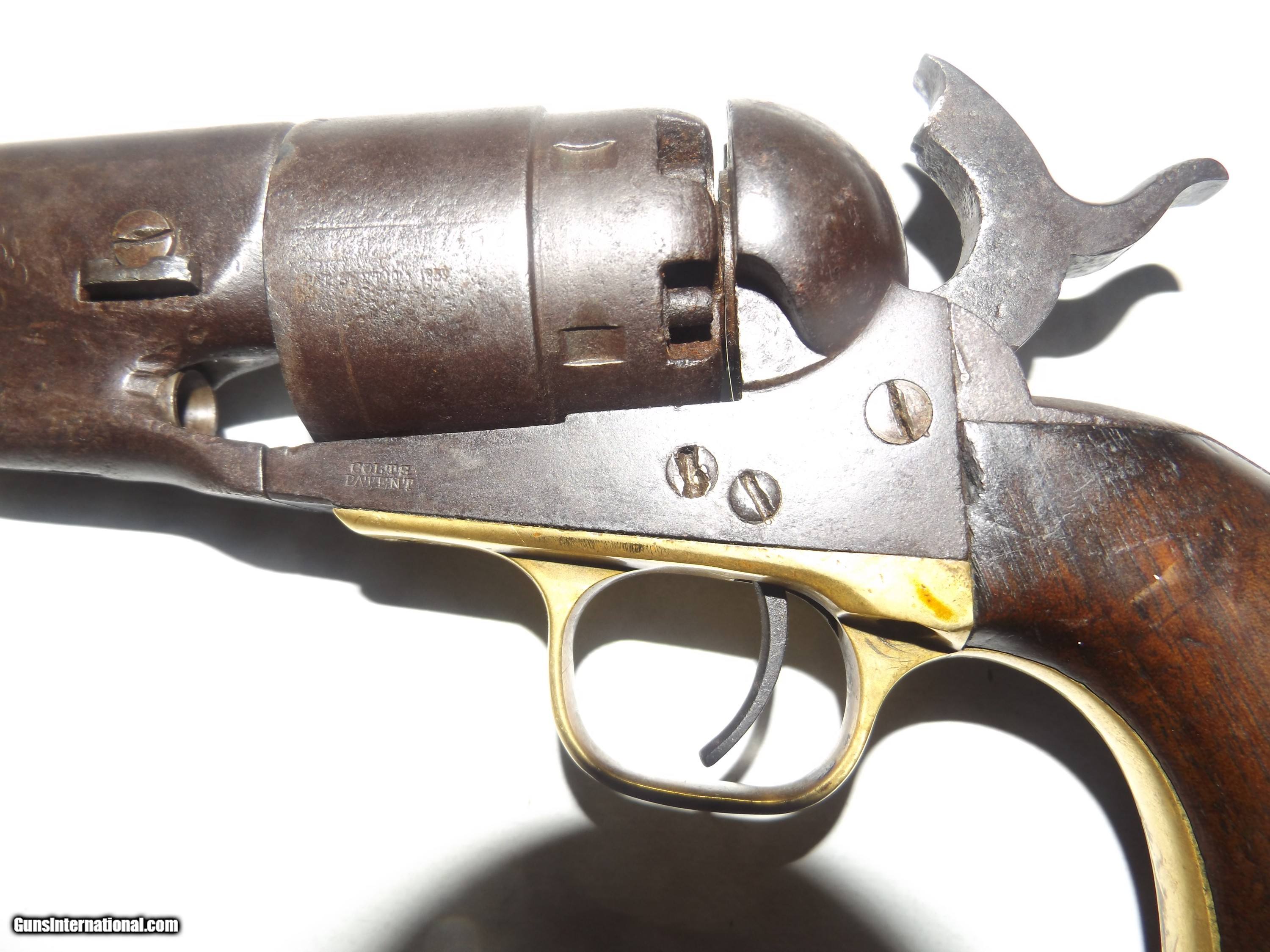 Description: This is an origonal Colt model 1860 Army 44 Cal. Martially marked revolver. It is S.N. 124452 and was made in 1863. It has the outline of a Cartouche on the grip. The gun is tight and functions in half and full cock. The cylinder rotates easily on half cock. The metal has a even dark patina. This is a Civil War Colt that was issued and used. The barrel has the Colt New York address stamped on it. The sights are a Brass blade front sight with a V notch in the Hammer. Use the photo's to judge condition. Shippping is $30.00 to the lower 48. All other states please add $10.00. Shipping includes insurance and tracking. No FFL requirded. SOLD Antique: Yes Handgun Caliber: .44 Manufacturer: Colt Model: 1860 Army Serial Number: 124452 Chambers: 6 Condition: Very Good + Metal Condition: Even Patina Barrels: 1 Barrel Type: Round Action: Single Triggers: 1 Finish: Blued Sights: V and Blade Manufacture Date: 1863 Item Location: Indiana Proof:Black: 45 grains |