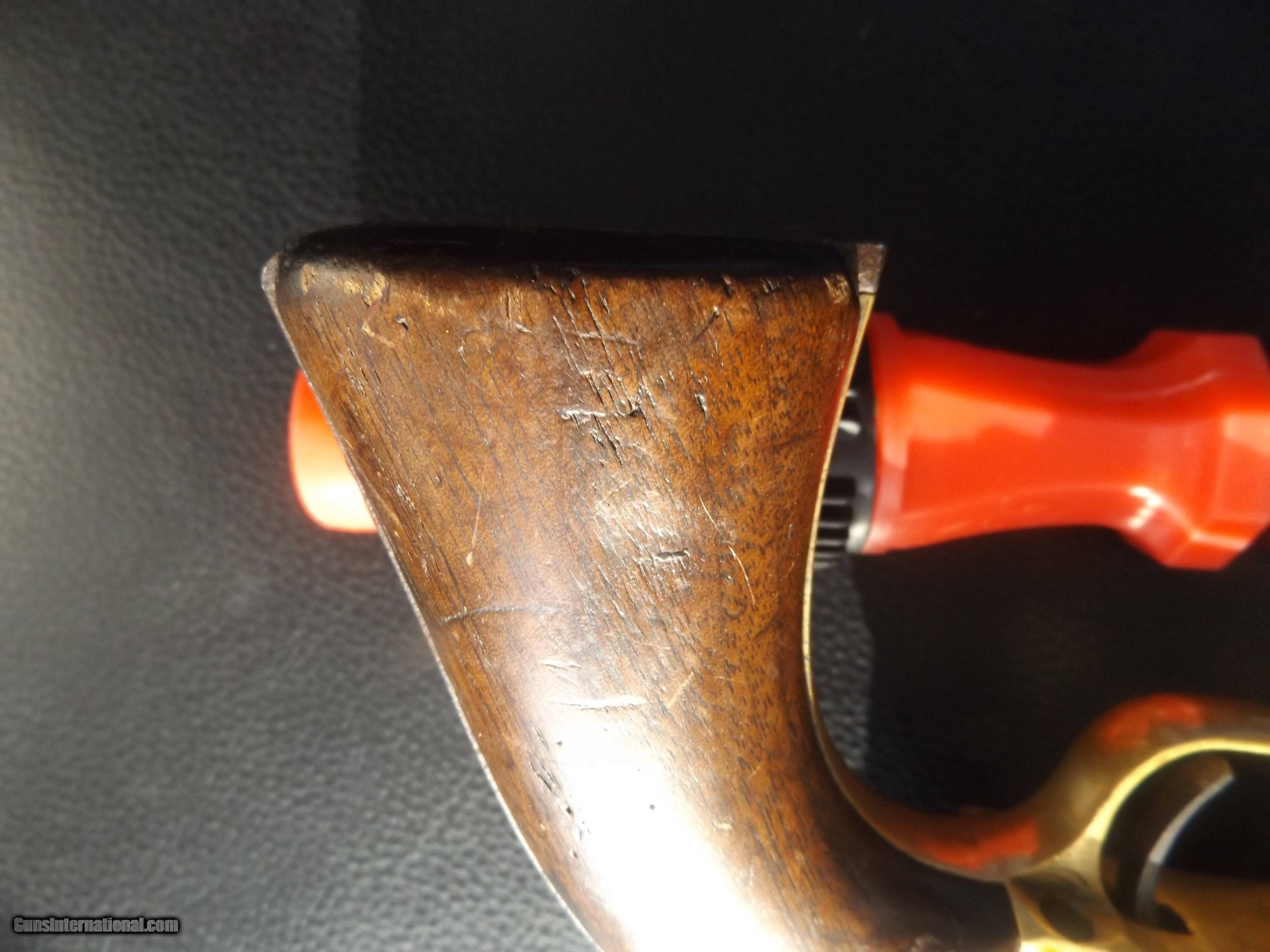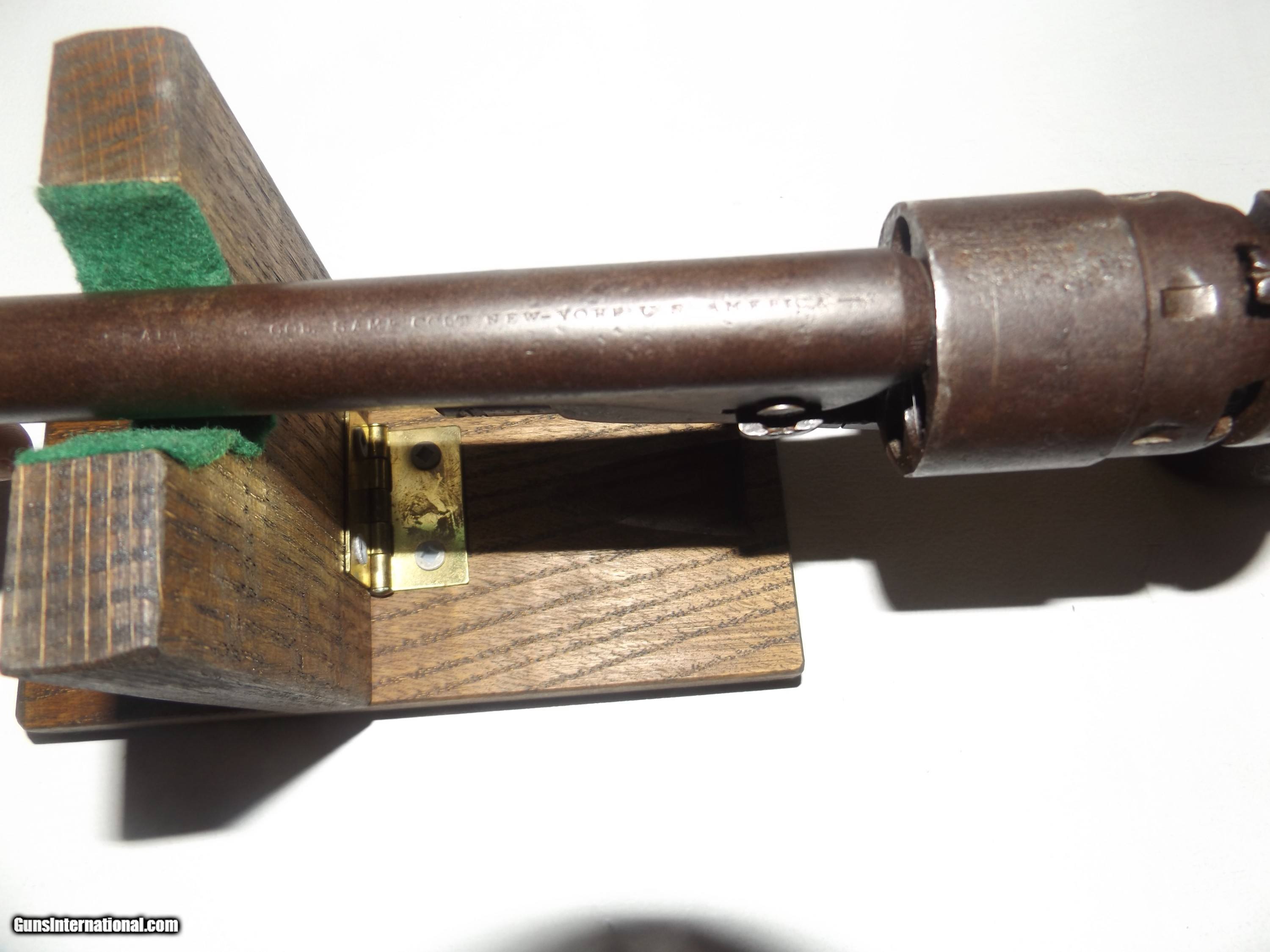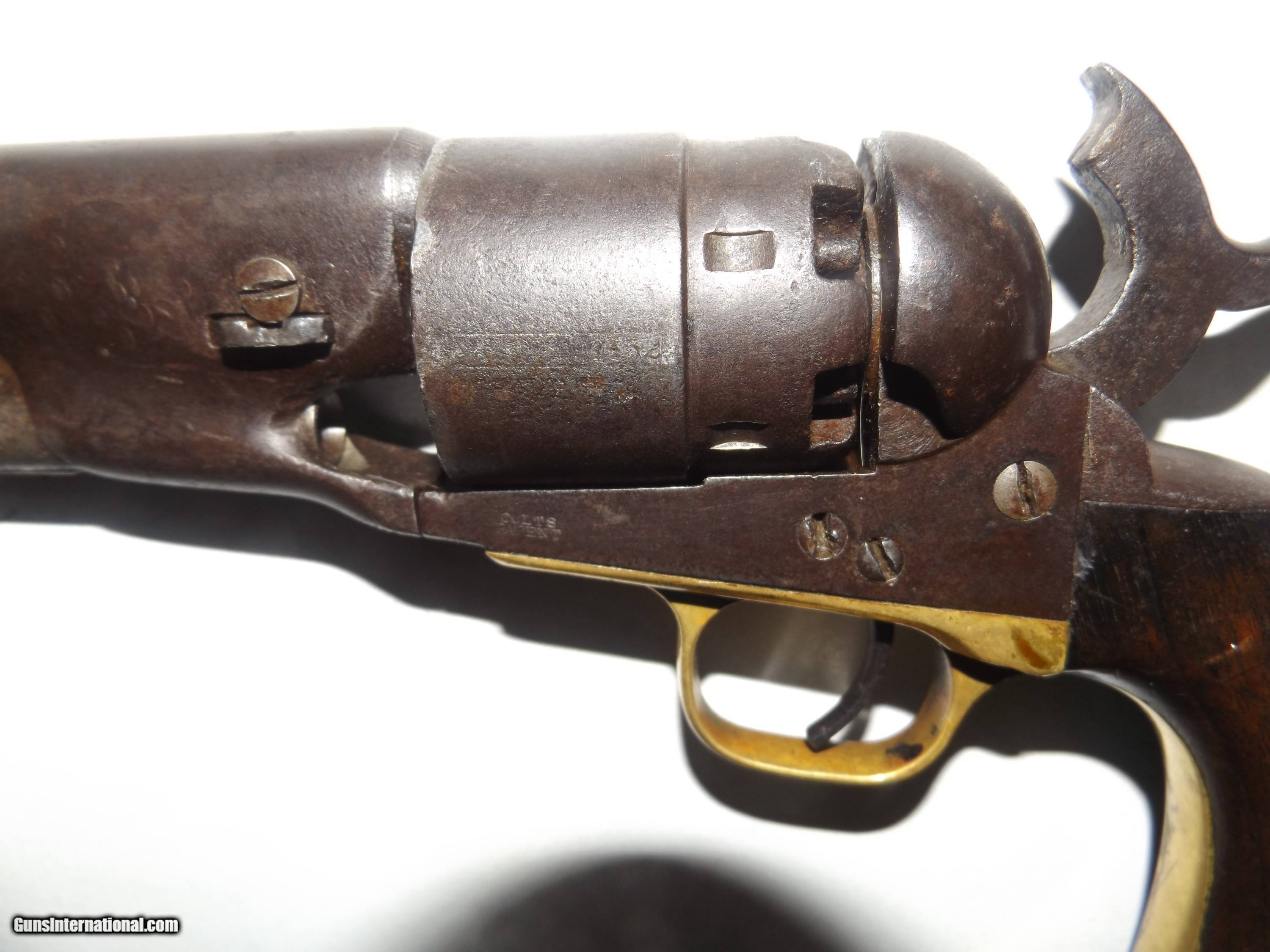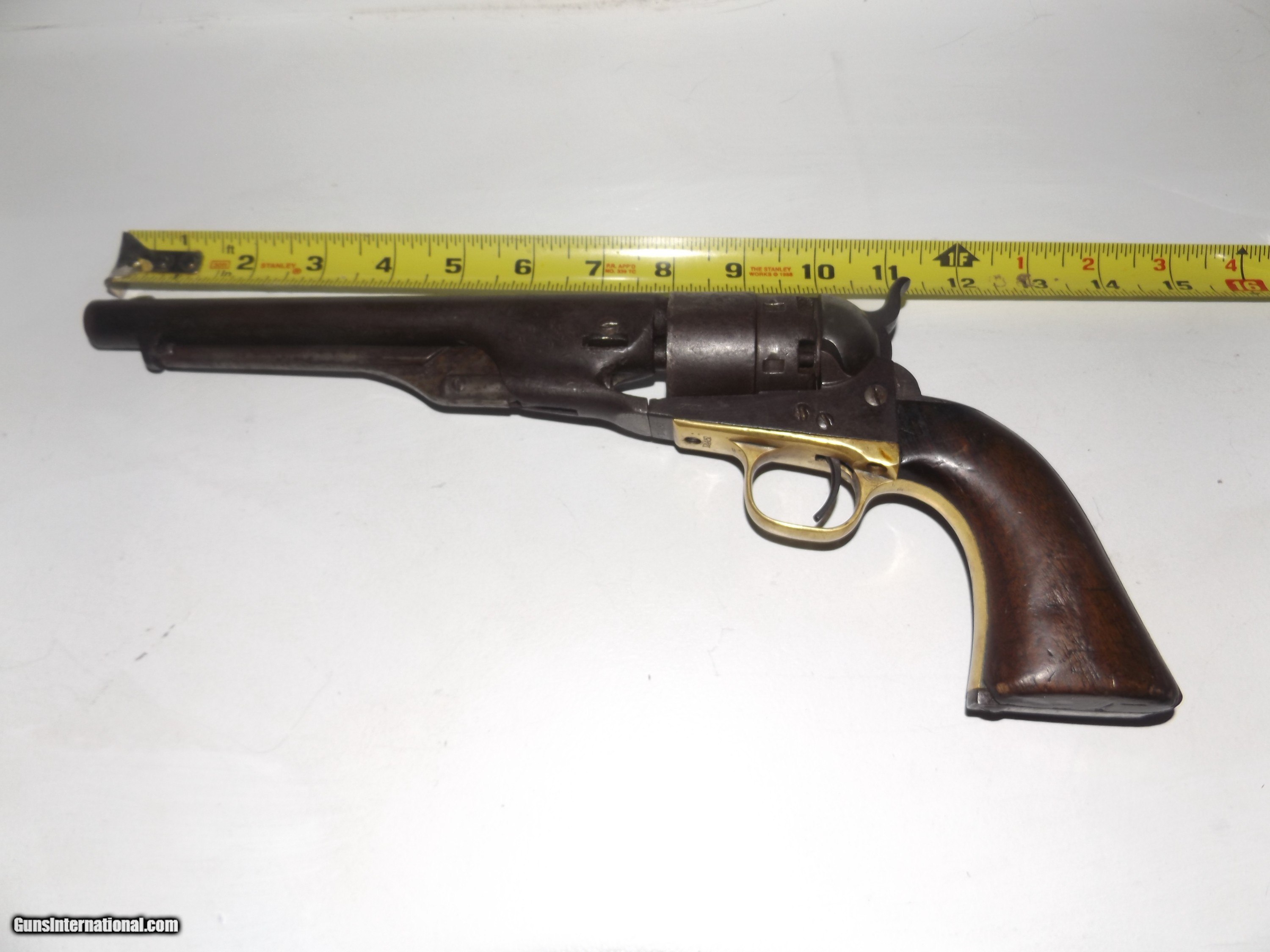 Description: This is an origonal Colt model 1860 Army 44 Cal. Martially marked revolver. It is S.N. 124452 and was made in 1863. It has the outline of a Cartouche on the grip. The gun is tight and functions in half and full cock. The cylinder rotates easily on half cock. The metal has a even dark patina. This is a Civil War Colt that was issued and used. The barrel has the Colt New York address stamped on it. The sights are a Brass blade front sight with a V notch in the Hammer. Use the photo's to judge condition. Shippping is $30.00 to the lower 48. All other states please add $10.00. Shipping includes insurance and tracking. No FFL requirded. SOLD Antique: Yes Handgun Caliber: .44 Manufacturer: Colt Model: 1860 Army Serial Number: 124452 Chambers: 6 Condition: Very Good + Metal Condition: Even Patina Barrels: 1 Barrel Type: Round Action: Single Triggers: 1 Finish: Blued Sights: V and Blade Manufacture Date: 1863 Item Location: Indiana Proof:Black: 45 grains |