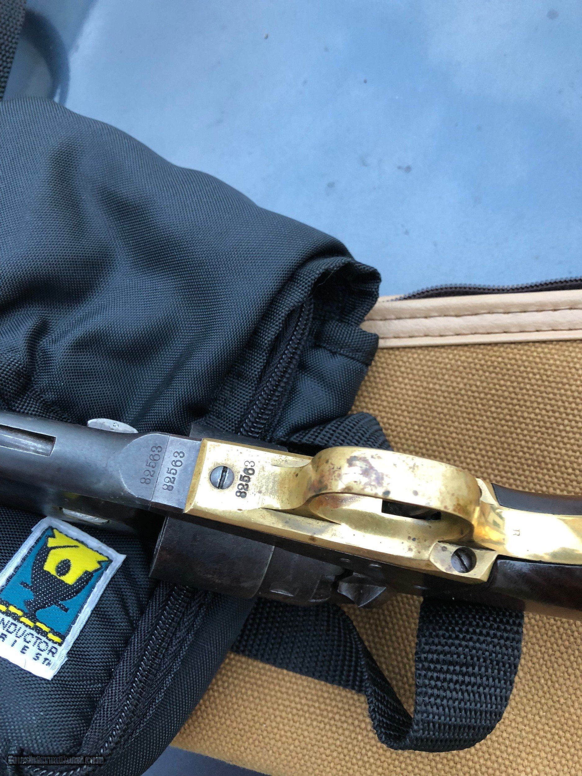 Description: This is a fine 1860 Army in excellent mechanical condition. The grip on the right side is slightly bent out a the top. Estimated 40% blue on barrel and cylinder with some minor pitting on left side of muzzle and cylinder. All matching including wedge. Traces of case colors on frame and hammer. This is a truly fine revolver and for a really nice collection. SOLD Antique: Yes |