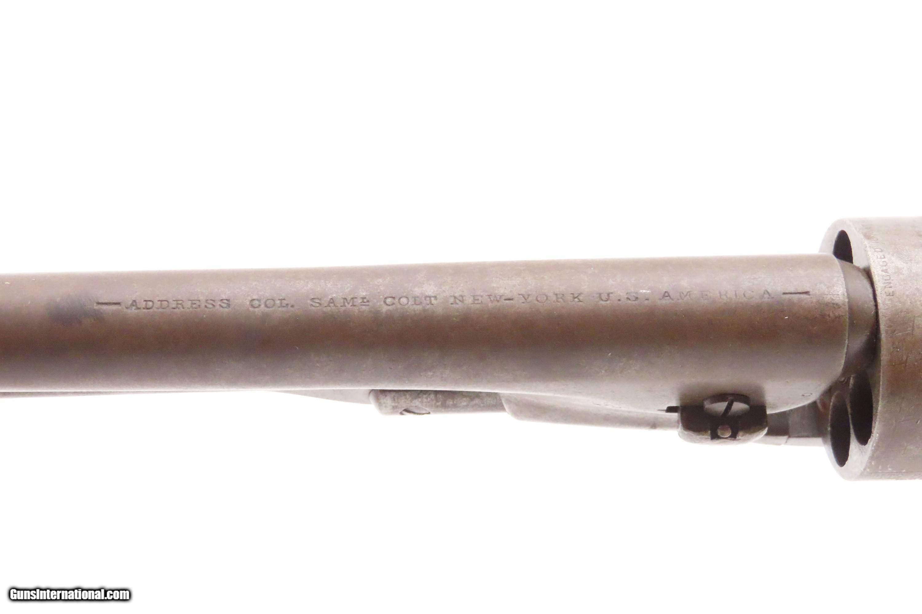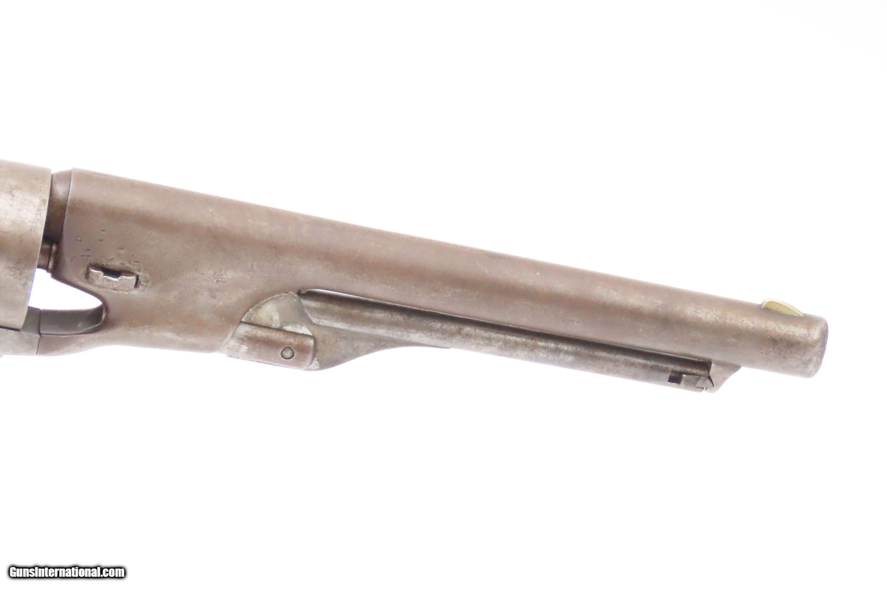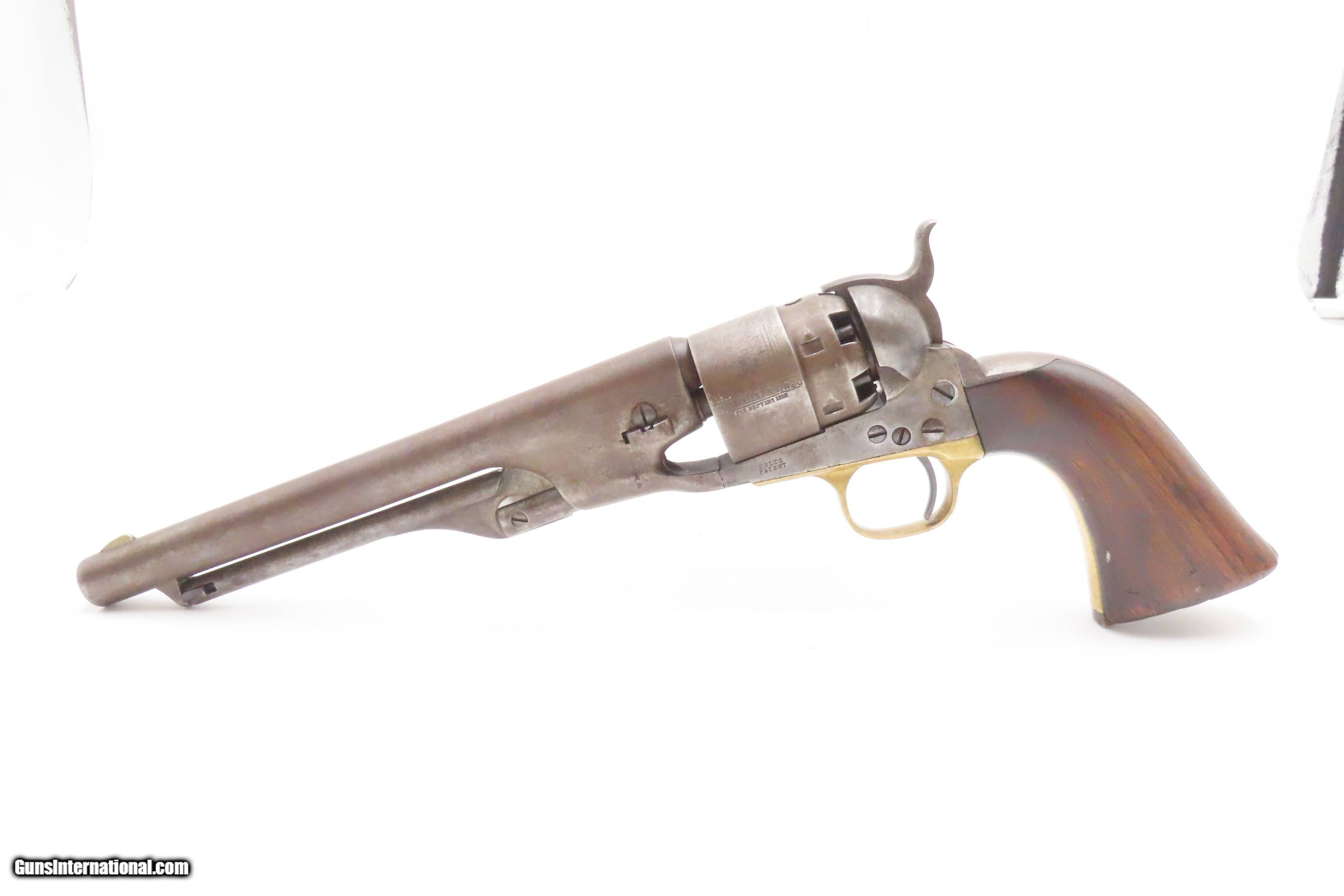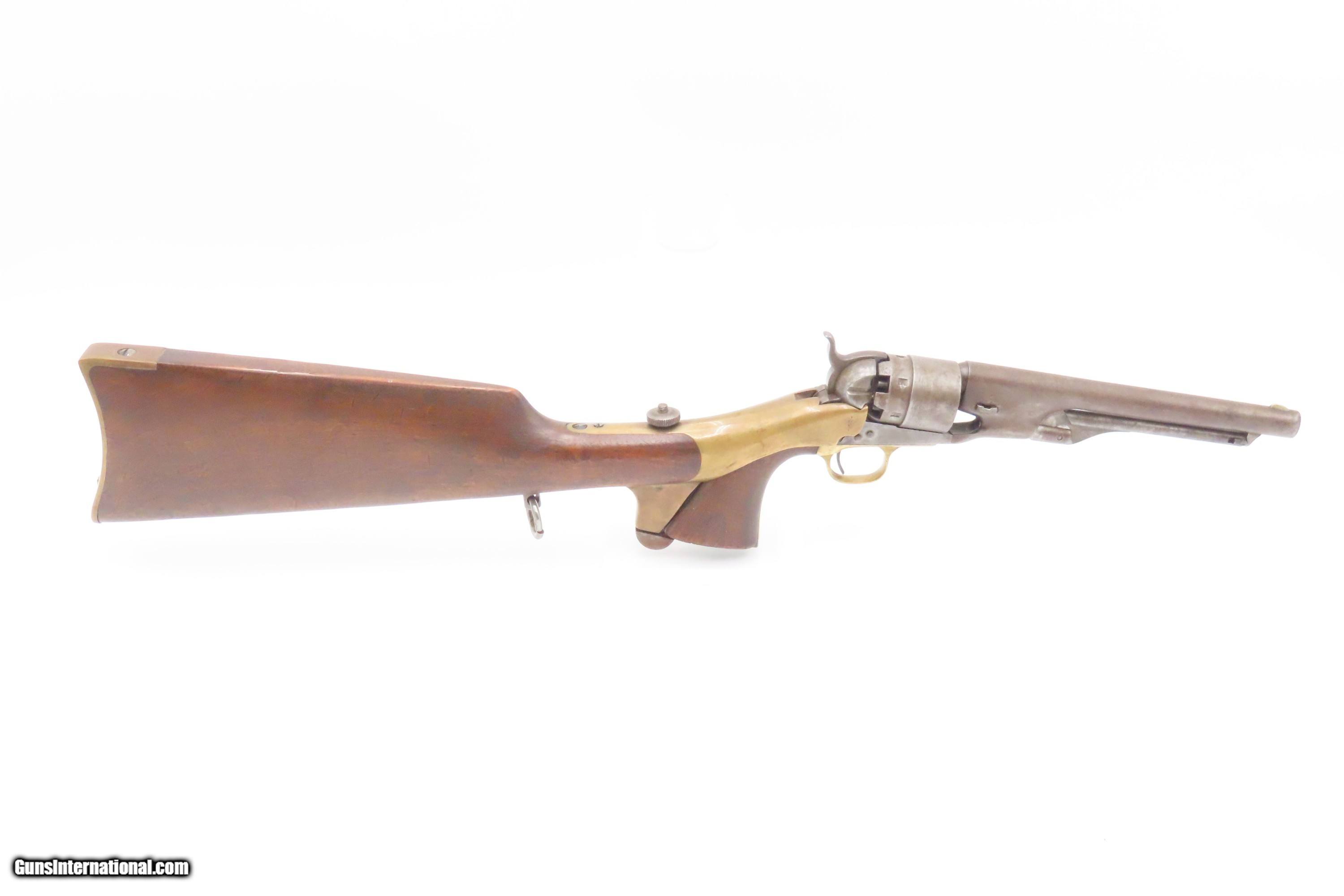 Description: 1862 Early-CIVIL WAR/WILD WEST Antique U.S. COLT M1860 .44 Percussion ARMY Revolver Used Past the Civil War into the WILD WEST Here we present an antique Colt U.S. Model 1860 Army Percussion Revolver, made in 1862 in Hartford, Connecticut. The 1860 Army was the single most used pistol of the American Civil War. Over 200,000 were made from 1860 to 1873, and 156,000 of those were made by the end of the war in 1865. These were excellent sidearms for officers, cavalry, infantry, and artillery troops. The 1860 Army was Samuel Colt’s finest achievement to that point, having finally developed a large caliber revolver that weighed about 2 lbs. 10 oz. to the famous Dragoon’s 4 lbs. 4 oz., and was adopted en masse by the U.S. government with huge contracts. The revolver was well balanced in hand and had a long enough barrel to be effective when utilized as a carbine with the attachable shoulder stock. This revolver represented unprecedented firepower from a handgun in the field at the time and was especially suited to Cavalry. The Confederacy, lacking in manufacturing capabilities though they were, managed to produce limited numbers of copies, and battlefield pickups of the 1860 Army were highly coveted. The 1860 Army went on to serve the U.S. military even after the Civil War and into the Indian Wars, until production of Colt’s 1873 Single Action Army created new waves in the revolver market, and again achieved great success in the military and commercial markets. The overall condition is very good. Patina throughout. Still visible Battle of Campeche cylinder scene. Inspector markings throughout, including a cartouche on the left side of the grip. The action is excellent. The bore is dim with strong rifling. The grip has initials carved into the bottom as well as a place whittled out for a lanyard. Numbers match throughout on the gun. The detachable stock remains solid throughout. Own the original! This is a legitimate antique and not a reproduction. Barrel is 8 inches. Caliber: .44 Percussion Overall condition as seen in photos. Very Fast. Very Safe. FREE SHIPPING WORLDWIDE. Delivered directly to your door by express mail! Guaranteed AUTHENTIC & Includes CERTIFICATE OF AUTHENTICITY. ancestryguns $3200 #247335 SOLD Antique: Yes |