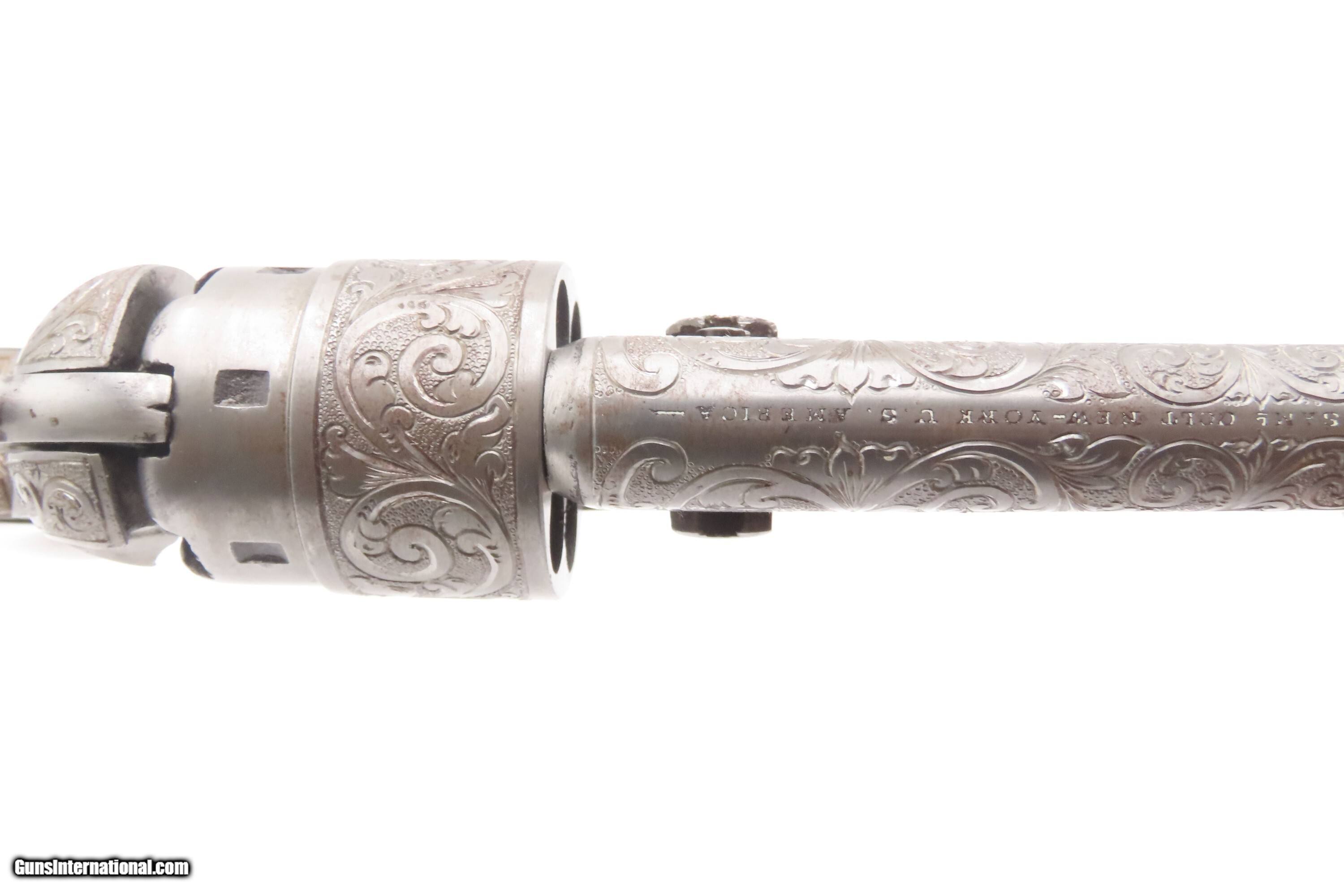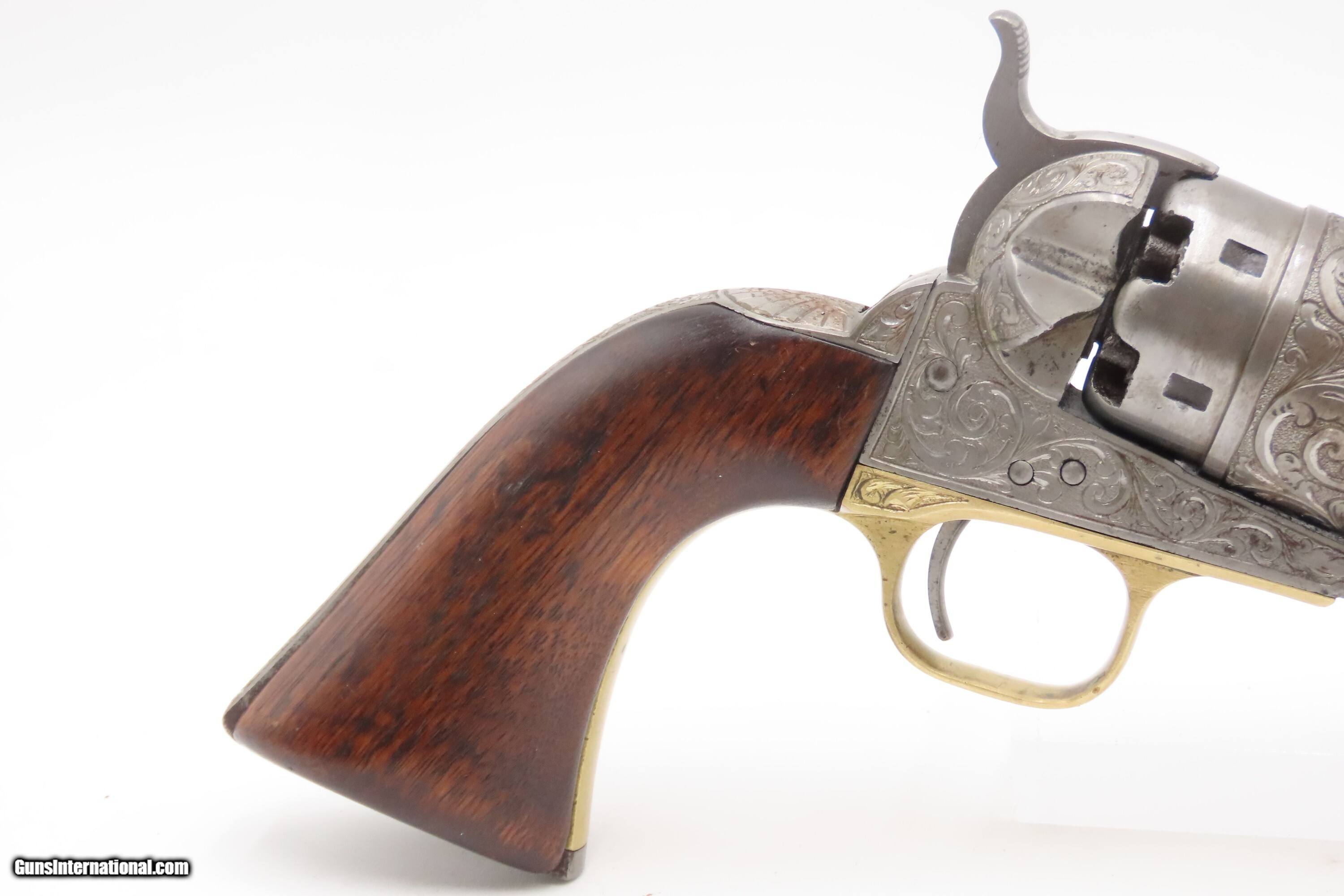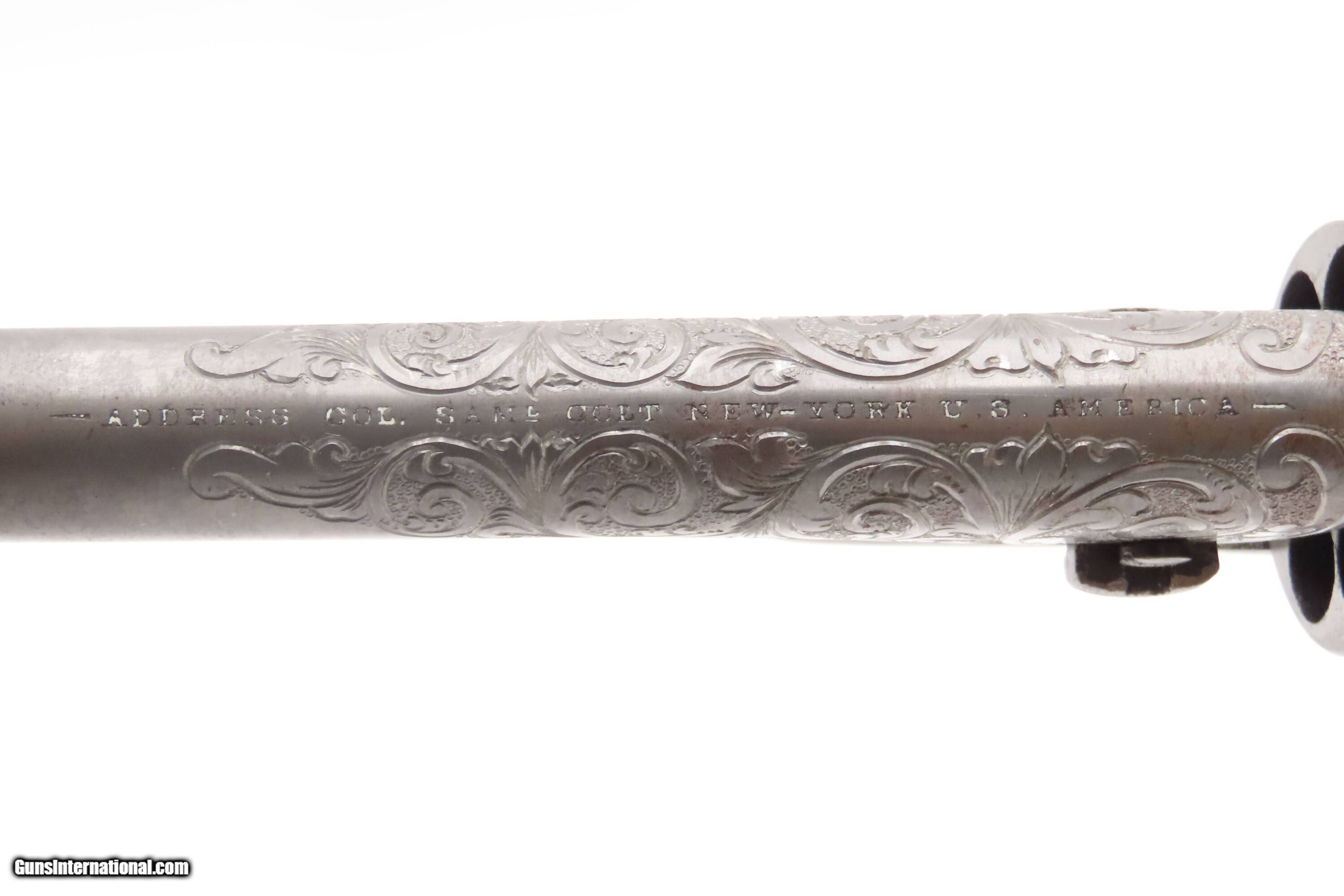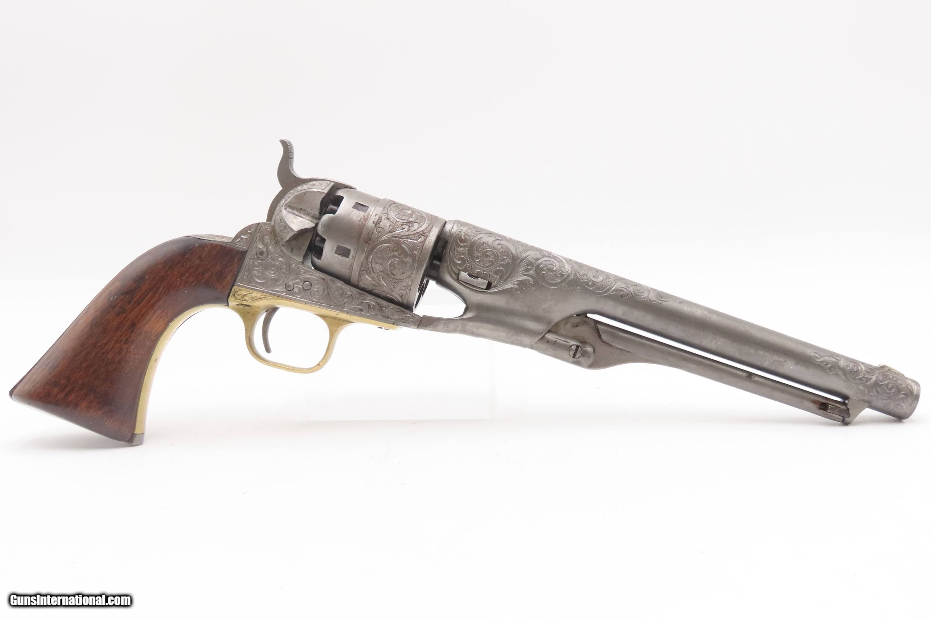 Description: 1863 mfr. ENGRAVED Antique CIVIL WAR Antique COLT M1860 .44 Percussion ARMY ENGRAVER RACHEL WELLS w/ SHOULDER STOCK Here Ancestry Guns presents an antique Colt Model 1860 Army Percussion Revolver, made in 1863 in Hartford, Connecticut, and Engraved in the 20th Century by Rachel Wells. The 1860 Army was the single most used pistol of the American Civil War. Over 200,000 were made from 1860 to 1873, and 156,000 of those were made by the end of the war in 1865. These were excellent sidearms for officers, cavalry, infantry, and artillery troops. The 1860 Army was Samuel Colt’s finest achievement to that point, having finally developed a large caliber revolver that weighed about 2 lbs. 10 oz. to the famous Dragoon’s 4 lbs. 4 oz., and was adopted en masse by the U.S. government with huge contracts. The revolver was well balanced in hand and had a long enough barrel to be effective when utilized as a carbine with the attachable shoulder stock. This revolver represented unprecedented firepower from a handgun in the field at the time and was especially suited to Cavalry. The Confederacy, lacking in manufacturing capabilities though they were, managed to produce limited numbers of copies, and battlefield pickups of the 1860 Army were highly coveted. The 1860 Army went on to serve the U.S. military even after the Civil War and into the Indian Wars, until production of Colt’s 1873 Single Action Army created new waves in the revolver market, and again achieved great success in the military and commercial markets. This gun was manufactured in the middle of the Civil War and subsequently engraved and signed by Firearms Engravers Guild of America member Rachel Wells. It features floral scroll engraving on over half of the surfaces, with Wells' signature on the butt. This example has been engraved by Rachel Wells. The overall condition is fine. The grip has been refinished and is slightly undersized. Minor wear on the grip. Numbers match. The markings are legible. Excellent action. The bore is dim with some reflection and remains good with serviceable rifling. The shoulder stock is a reproduction with a missing retention bolt. Own the original! This is a legitimate antique and not a reproduction. Barrel is 7-7/8 inches. Caliber: .44 Percussion Overall condition as seen in photos. Very Fast. Very Safe. FREE SHIPPING WORLDWIDE. Delivered directly to your door by express mail! Guaranteed AUTHENTIC & Includes CERTIFICATE OF AUTHENTICITY. $6200 #259325 Antique: Yes Price: $6,200.00 Buy Now Pay with