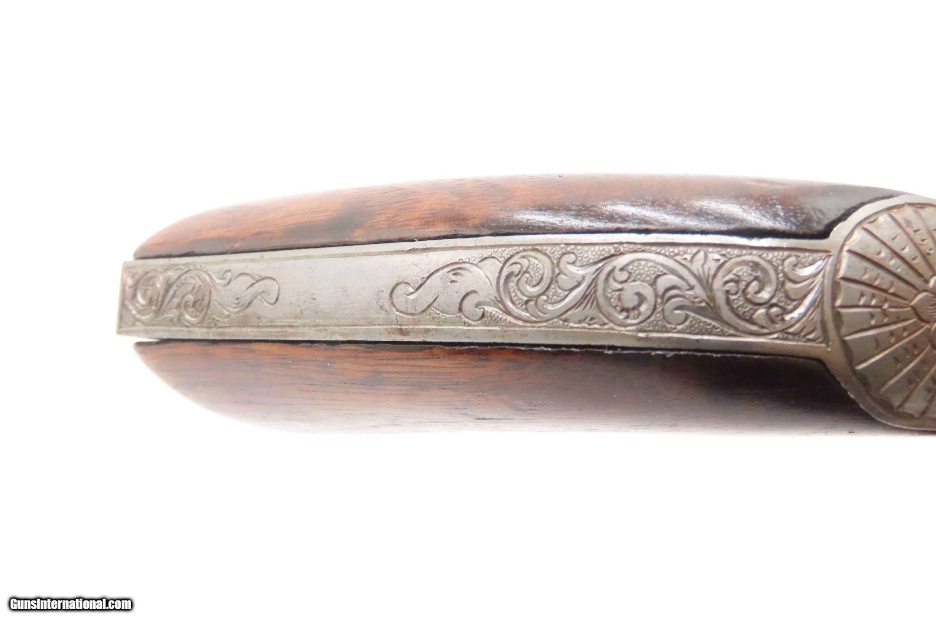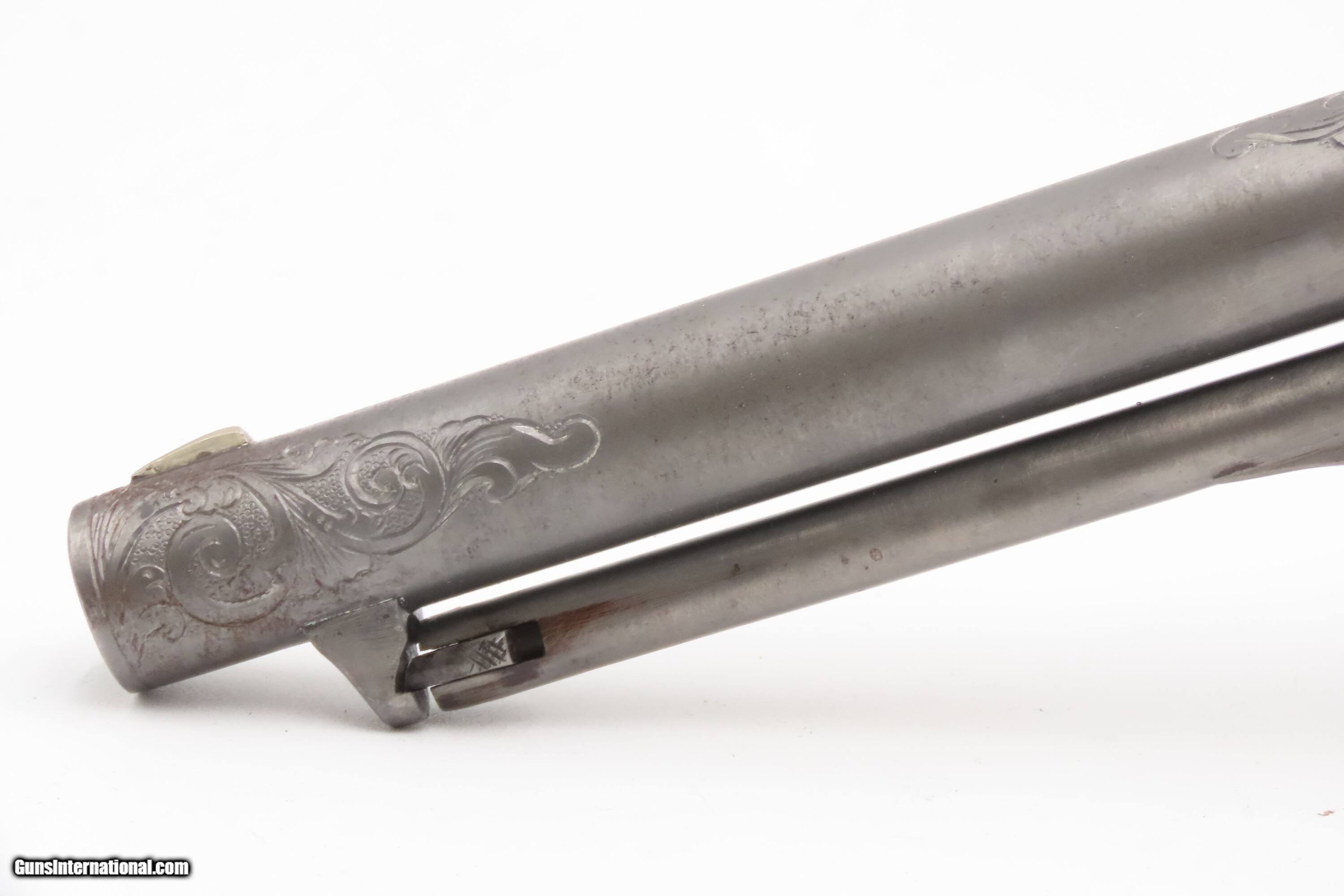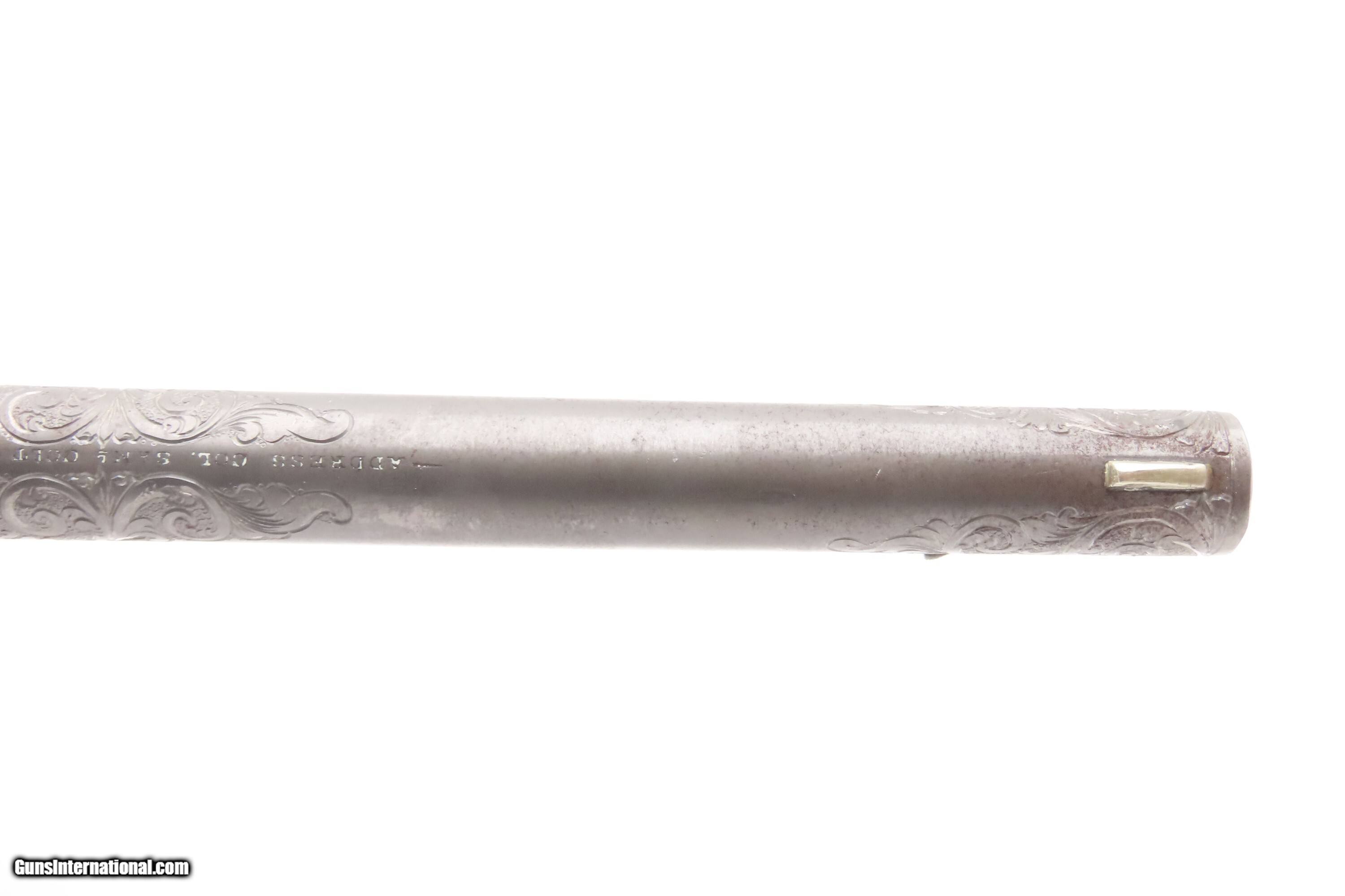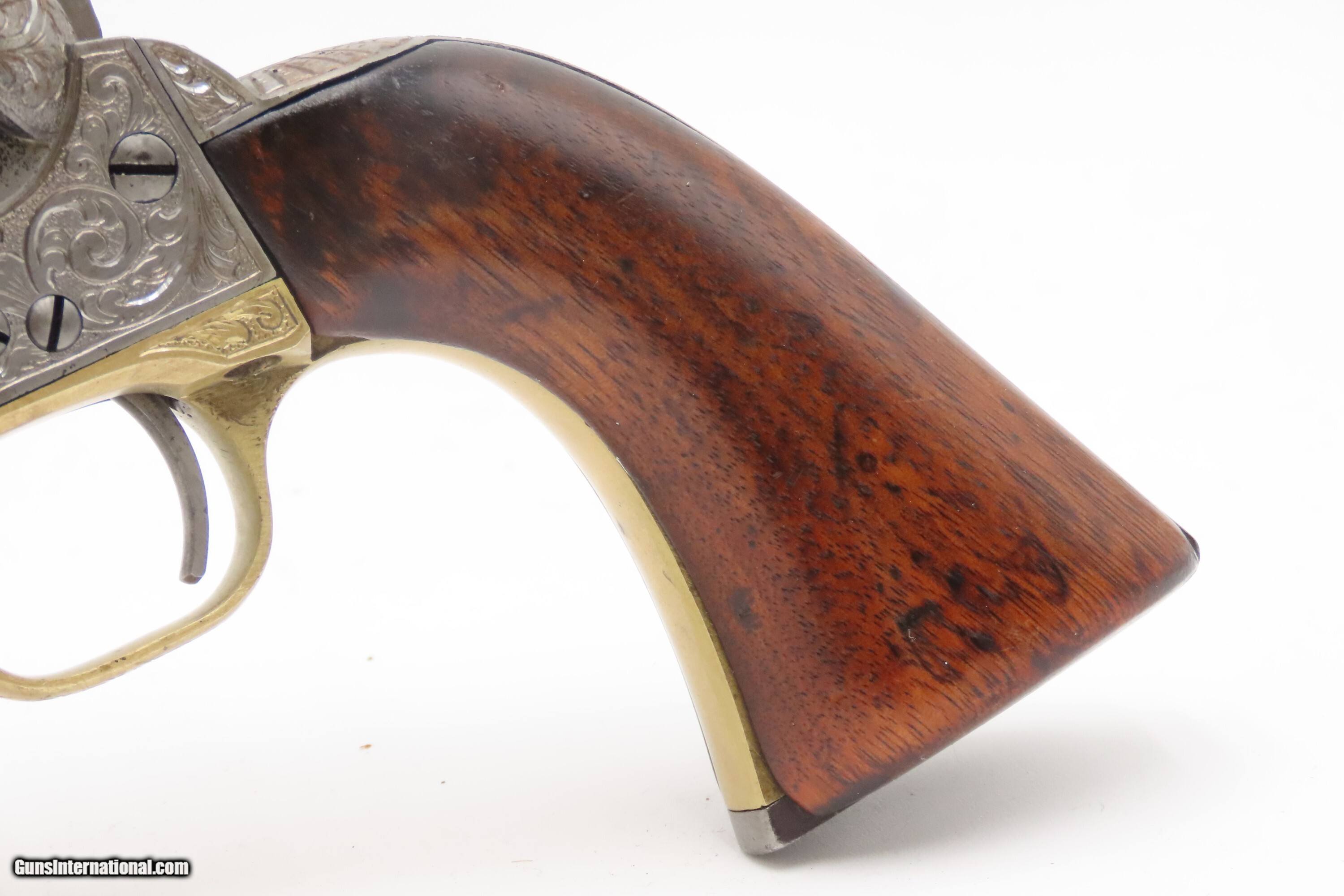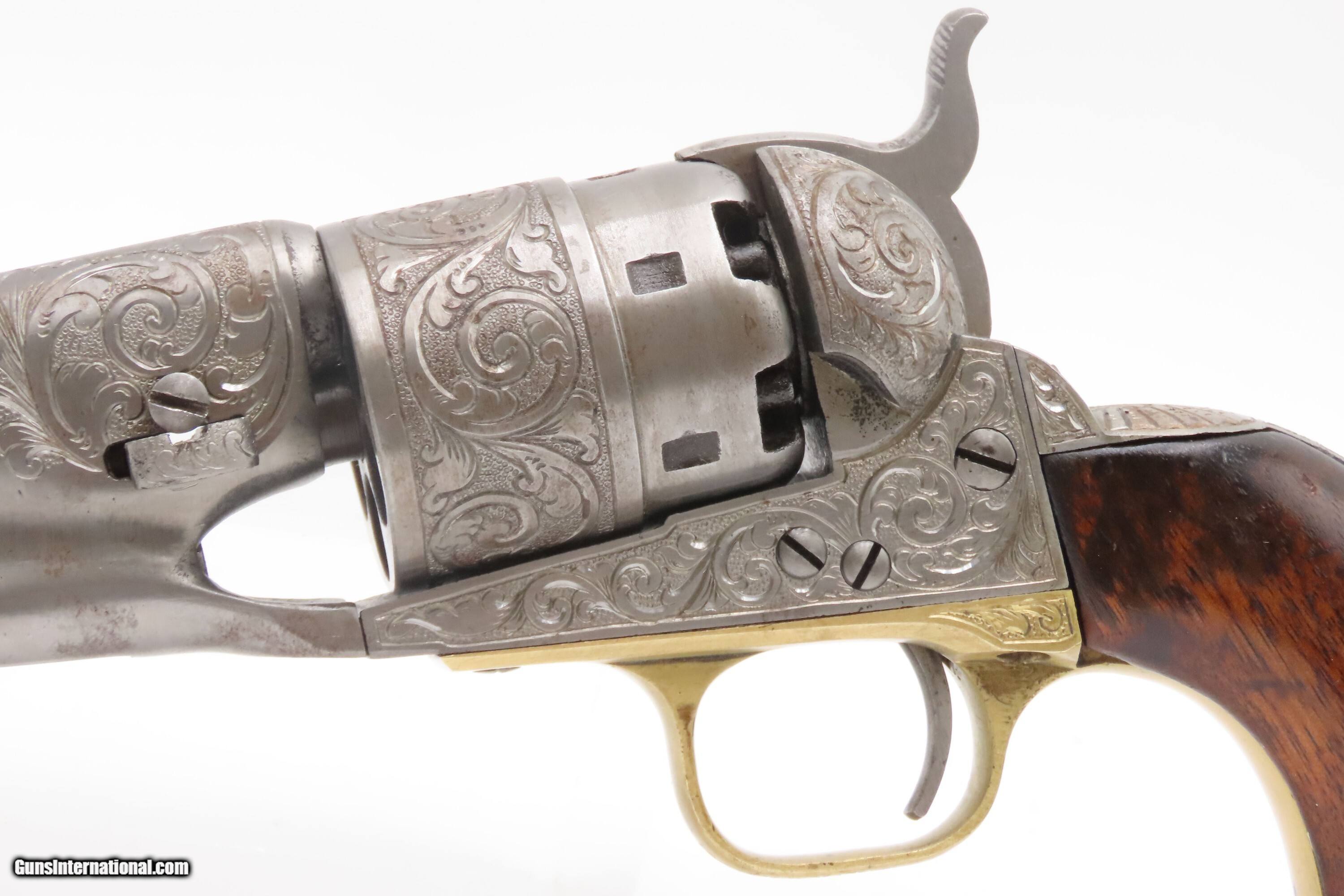 Description: 1863 mfr. ENGRAVED Antique CIVIL WAR Antique COLT M1860 .44 Percussion ARMY ENGRAVER RACHEL WELLS w/ SHOULDER STOCK Here Ancestry Guns presents an antique Colt Model 1860 Army Percussion Revolver, made in 1863 in Hartford, Connecticut, and Engraved in the 20th Century by Rachel Wells. The 1860 Army was the single most used pistol of the American Civil War. Over 200,000 were made from 1860 to 1873, and 156,000 of those were made by the end of the war in 1865. These were excellent sidearms for officers, cavalry, infantry, and artillery troops. The 1860 Army was Samuel Colt’s finest achievement to that point, having finally developed a large caliber revolver that weighed about 2 lbs. 10 oz. to the famous Dragoon’s 4 lbs. 4 oz., and was adopted en masse by the U.S. government with huge contracts. The revolver was well balanced in hand and had a long enough barrel to be effective when utilized as a carbine with the attachable shoulder stock. This revolver represented unprecedented firepower from a handgun in the field at the time and was especially suited to Cavalry. The Confederacy, lacking in manufacturing capabilities though they were, managed to produce limited numbers of copies, and battlefield pickups of the 1860 Army were highly coveted. The 1860 Army went on to serve the U.S. military even after the Civil War and into the Indian Wars, until production of Colt’s 1873 Single Action Army created new waves in the revolver market, and again achieved great success in the military and commercial markets. This gun was manufactured in the middle of the Civil War and subsequently engraved and signed by Firearms Engravers Guild of America member Rachel Wells. It features floral scroll engraving on over half of the surfaces, with Wells' signature on the butt. This example has been engraved by Rachel Wells. The overall condition is fine. The grip has been refinished and is slightly undersized. Minor wear on the grip. Numbers match. The markings are legible. Excellent action. The bore is dim with some reflection and remains good with serviceable rifling. The shoulder stock is a reproduction with a missing retention bolt. Own the original! This is a legitimate antique and not a reproduction. Barrel is 7-7/8 inches. Caliber: .44 Percussion Overall condition as seen in photos. Very Fast. Very Safe. FREE SHIPPING WORLDWIDE. Delivered directly to your door by express mail! Guaranteed AUTHENTIC & Includes CERTIFICATE OF AUTHENTICITY. $6200 #259325 Antique: Yes Price: $6,200.00 Buy Now Pay with