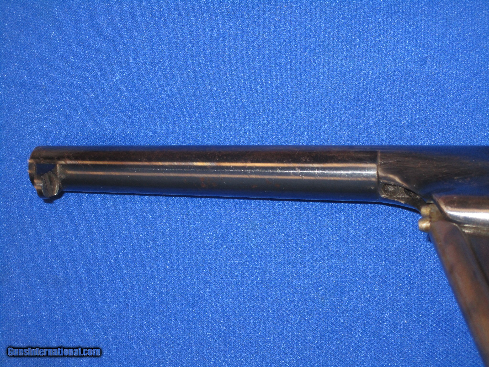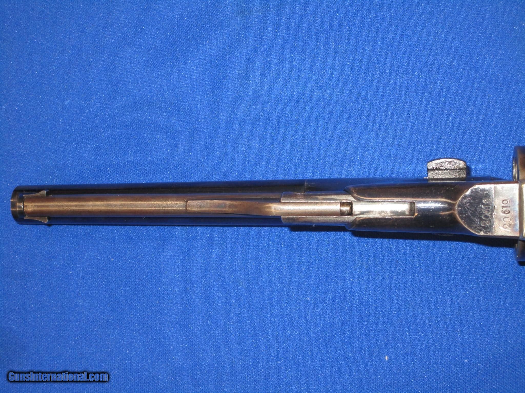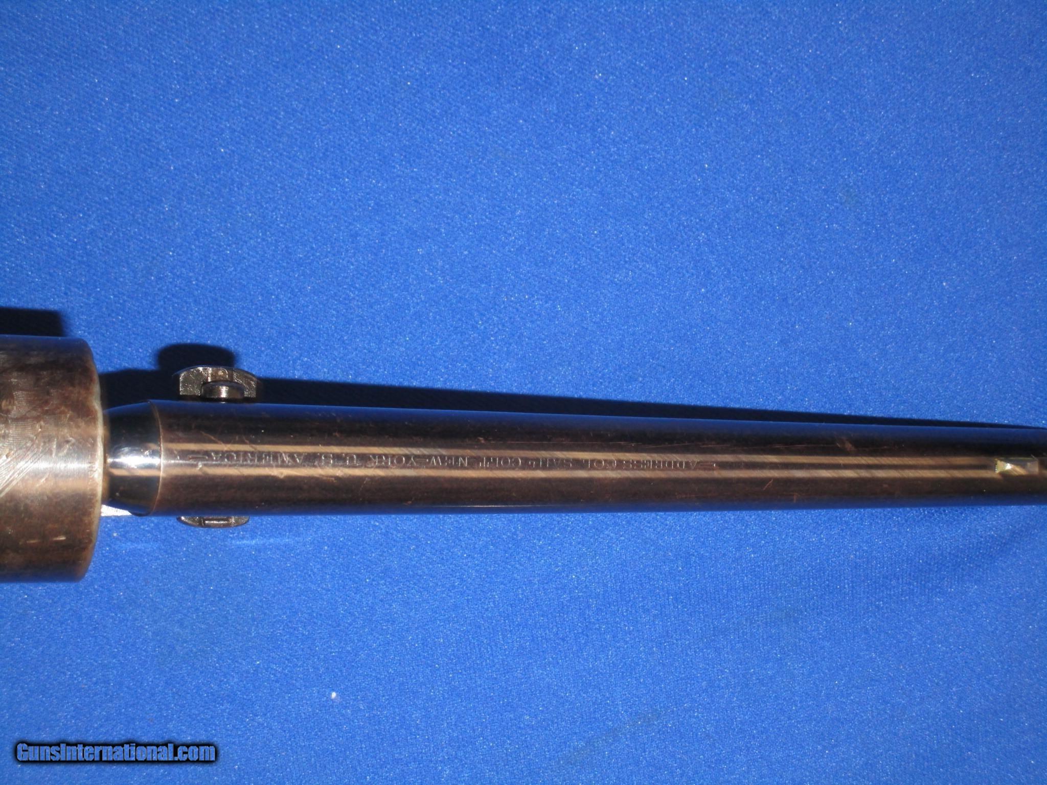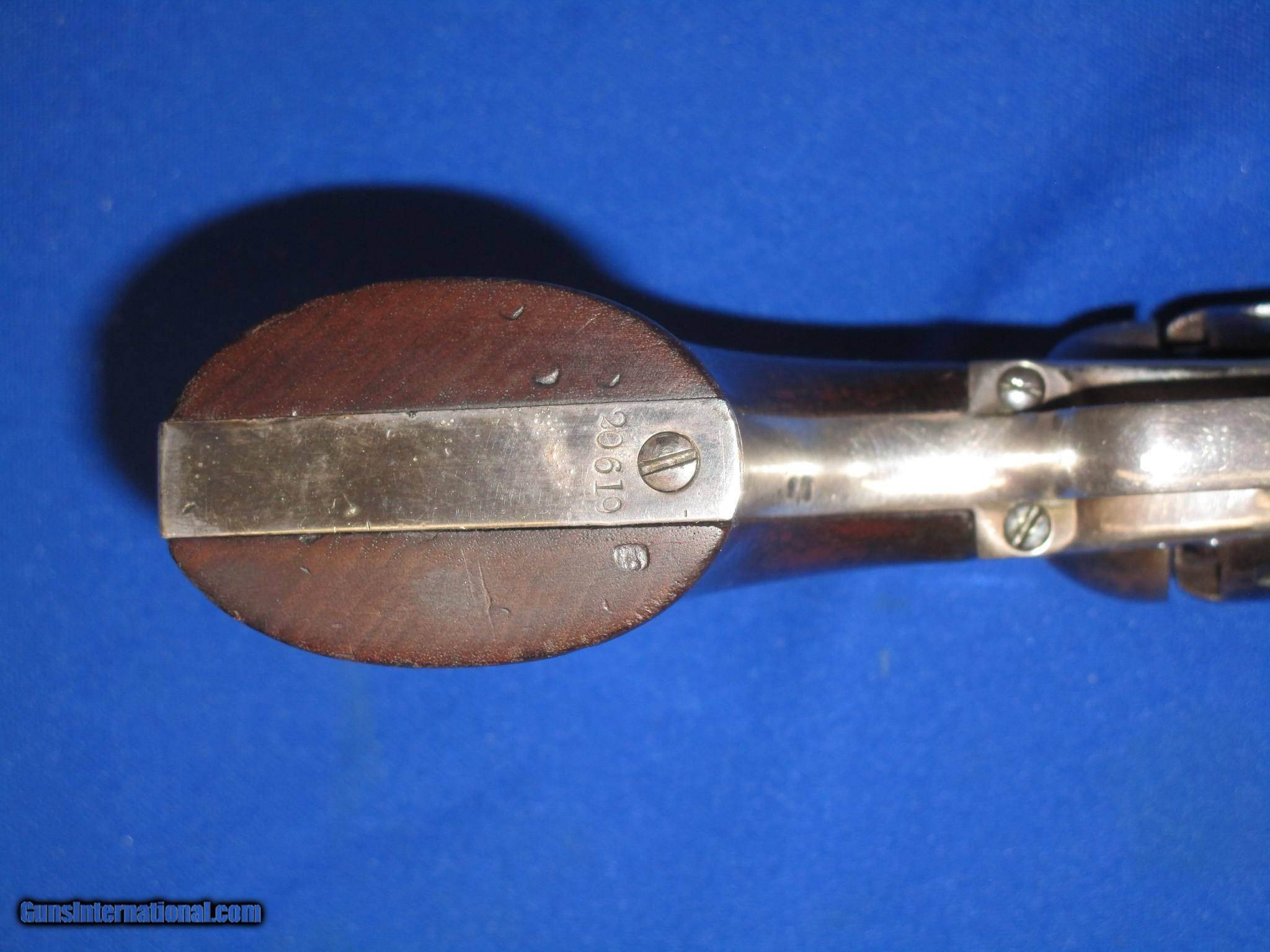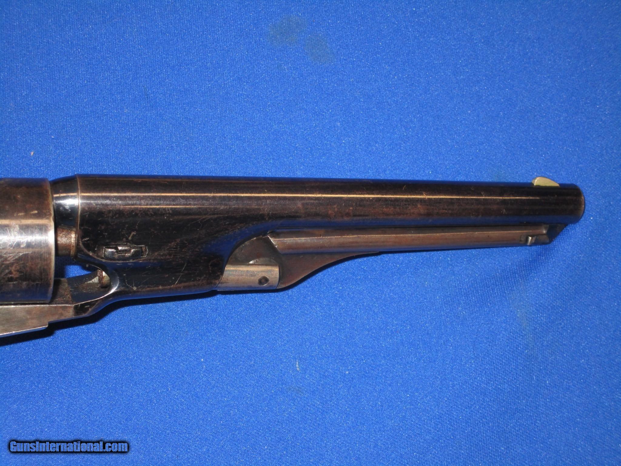 Description: AN EARLY & SCARCE CIVIL WAR COLT MODEL 1861 ROUND BARREL PERCUSSION NAVY REVOLVER IN EXCELLENT UNTOUCHED CONDITION. SERIAL #20,619, ALL MATCHING NUMBERS EXCEPT FOR THE WEDGE WHICH IS AN ORIGINAL PERIOD REPLACEMENT. MADE IN 1864, ALL ORIGINAL & COMPLETE. THE GUN HAS EXCELLENT PLUS METAL & MARKINGS INCLUDING A VERY CLEAR CYLINDER SCENE. IT HAS EXCELLENT LINES & EDGES. THE BARREL & CYLINDER HAVE EXCELLENT ORIGINAL BRIGHT BLUE. THE FRAME, LOADING LEVER, & HAMMER ALL SHOW EXCELLENT CASE COLORS. THE GUN HAS EXCELLENT FIRE BLUED SCREWS. THE BACKSTRAP & TRIGGER GUARD RETAIN ALL OF THEIR ORIGINAL SILVER. IT HAS EXCELENT & FULL GRIPS THROUGHOUT & A TIGHT CRISP ACTION. THE BORE IS EXCELLENT. THIS IS A VERY HIGH CONDITION EXAMPLE OF A SCARCE & HARD TO FIND CIVIL WAR COLT MODEL 1861 ROUND BARREL PERCUSSION NAVY REVOLVER THAT IS FRESH OUT OF AN OLD COLLECTION! SOLD Antique: Yes Manufacturer: COLT Model: 1861 NAVY REVOLVER Serial Number: 20,619 Caliber Info: .36 Condition: EXCELLENT Metal Condition: EXCELLENT Wood Condition: EXCELLENT Bore Condition: EXCELLENT |